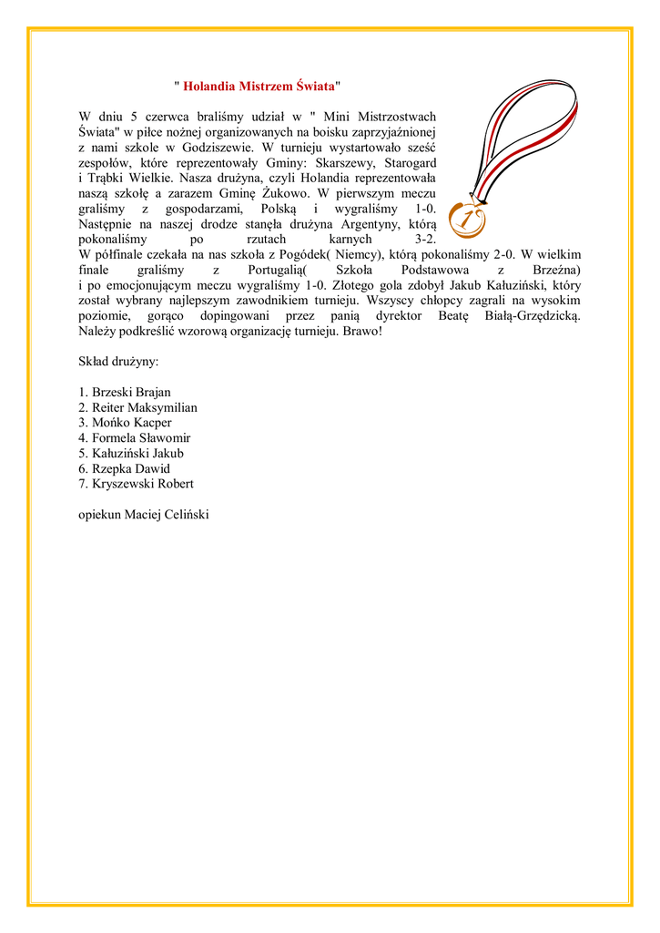 " Holandia Mistrzem Świata" W dniu 5 czerwca braliśmy udział w " Mini Mistrzostwach Świata" w piłce nożnej organizowanych na boisku zaprzyjaźnionej z nami szkole w Godziszewie. W turnieju wystartowało sześć zespołów, które reprezentowały Gminy: Skarszewy, Starogard i Trąbki Wielkie. Nasza drużyna, czyli Holandia reprezentowała naszą szkołę a zarazem Gminę Żukowo. W pierwszym meczu graliśmy z gospodarzami, Polską i wygraliśmy 1-0. Następnie na naszej drodze stanęła drużyna Argentyny, którą pokonaliśmy po rzutach karnych 3-2. W półfinale czekała na nas szkoła z Pogódek( Niemcy), którą pokonaliśmy 2-0. W wielkim finale graliśmy z Portugalią( Szkoła Podstawowa z Brzeźna) i po emocjonującym meczu wygraliśmy 1-0. Złotego gola zdobył Jakub Kałuziński, który został wybrany najlepszym zawodnikiem turnieju. Wszyscy chłopcy zagrali na wysokim poziomie, gorąco dopingowani przez panią dyrektor Beatę Białą-Grzędzicką. Należy podkreślić wzorową organizację turnieju. Brawo! Skład drużyny: 1. Brzeski Brajan 2. Reiter Maksymilian 3. Mońko Kacper 4. Formela Sławomir 5. Kałuziński Jakub 6. Rzepka Dawid 7. Kryszewski Robert opiekun Maciej Celiński