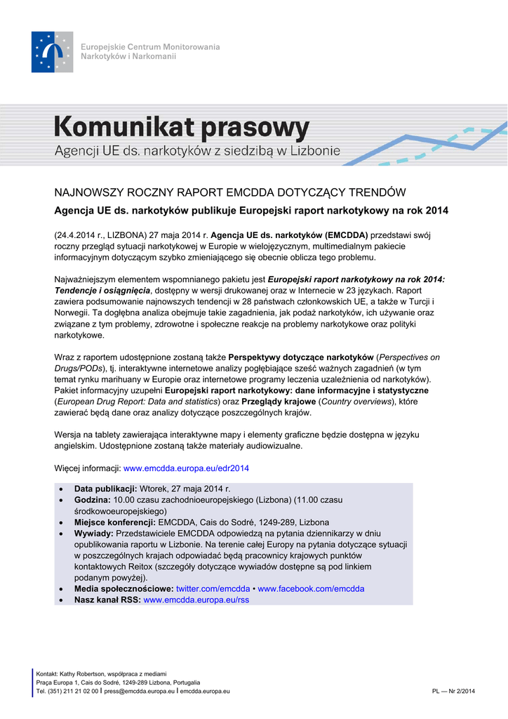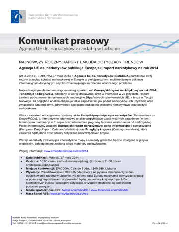 NAJNOWSZY ROCZNY RAPORT EMCDDA DOTYCZĄCY TRENDÓW Agencja UE ds. narkotyków publikuje Europejski raport narkotykowy na rok 2014 (24.4.2014 r., LIZBONA) 27 maja 2014 r. Agencja UE ds. narkotyków (EMCDDA) przedstawi swój roczny przegląd sytuacji narkotykowej w Europie w wielojęzycznym, multimedialnym pakiecie informacyjnym dotyczącym szybko zmieniającego się obecnie oblicza tego problemu. Najważniejszym elementem wspomnianego pakietu jest Europejski raport narkotykowy na rok 2014: Tendencje i osiągnięcia, dostępny w wersji drukowanej oraz w Internecie w 23 językach. Raport zawiera podsumowanie najnowszych tendencji w 28 państwach członkowskich UE, a także w Turcji i Norwegii. Ta dogłębna analiza obejmuje takie zagadnienia, jak podaż narkotyków, ich używanie oraz związane z tym problemy, zdrowotne i społeczne reakcje na problemy narkotykowe oraz polityki narkotykowe. Wraz z raportem udostępnione zostaną także Perspektywy dotyczące narkotyków (Perspectives on Drugs/PODs), tj. interaktywne internetowe analizy pogłębiające sześć ważnych zagadnień (w tym temat rynku marihuany w Europie oraz internetowe programy leczenia uzależnienia od narkotyków). Pakiet informacyjny uzupełni Europejski raport narkotykowy: dane informacyjne i statystyczne (European Drug Report: Data and statistics) oraz Przeglądy krajowe (Country overviews), które zawierać będą dane oraz analizy dotyczące poszczególnych krajów. Wersja na tablety zawierająca interaktywne mapy i elementy graficzne będzie dostępna w języku angielskim. Udostępnione zostaną także materiały audiowizualne. Więcej informacji: www.emcdda.europa.eu/edr2014 Data publikacji: Wtorek, 27 maja 2014 r. Godzina: 10.00 czasu zachodnioeuropejskiego (Lizbona) (11.00 czasu środkowoeuropejskiego) Miejsce konferencji: EMCDDA, Cais do Sodré, 1249-289, Lizbona Wywiady: Przedstawiciele EMCDDA odpowiedzą na pytania dziennikarzy w dniu opublikowania raportu w Lizbonie. Na terenie całej Europy na pytania dotyczące sytuacji w poszczególnych krajach odpowiadać będą pracownicy krajowych punktów kontaktowych Reitox (szczegóły dotyczące wywiadów dostępne są pod linkiem podanym powyżej). Media społecznościowe: twitter.com/emcdda • www.facebook.com/emcdda Nasz kanał RSS: www.emcdda.europa.eu/rss Kontakt: Kathy Robertson, współpraca z mediami Praça Europa 1, Cais do Sodré, 1249-289 Lizbona, Portugalia Tel. (351) 211 21 02 00 I [email protected] I emcdda.europa.eu PL — Nr 2/2014