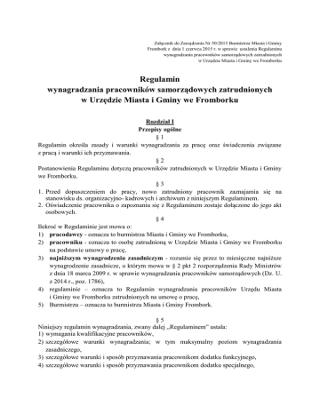 Załącznik do Zarządzenia Nr 50/2015 Burmistrza Miasta i Gminy Frombork z dnia 1 czerwca 2015 r. w sprawie ustalenia Regulaminu wynagradzania pracowników samorządowych zatrudnionych w Urzędzie Miasta i Gminy we Fromborku Regulamin wynagradzania pracowników samorządowych zatrudnionych w Urzędzie Miasta i Gminy we Fromborku Rozdział I Przepisy ogólne §1 Regulamin określa zasady i warunki wynagradzania za pracę oraz świadczenia związane z pracą i warunki ich przyznawania. §2 Postanowienia Regulaminu dotyczą pracowników zatrudnionych w Urzędzie Miasta i Gminy we Fromborku. §3 1. Przed dopuszczeniem do pracy, nowo zatrudniony pracownik zaznajamia się na stanowisku ds. organizacyjno- kadrowych i archiwum z niniejszym Regulaminem. 2. Oświadczenie pracownika o zapoznaniu się z Regulaminem zostaje dołączone do jego akt osobowych. §4 Ilekroć w Regulaminie jest mowa o: 1) pracodawcy - oznacza to burmistrza Miasta i Gminy we Fromborku, 2) pracowniku - oznacza to osobę zatrudnioną w Urzędzie Miasta i Gminy we Fromborku na podstawie umowy o pracę, 3) najniższym wynagrodzeniu zasadniczym - rozumie się przez to miesięczne najniższe wynagrodzenie zasadnicze, o którym mowa w § 2 pkt 2 rozporządzenia Rady Ministrów z dnia 18 marca 2009 r. w sprawie wynagradzania pracowników samorządowych (Dz. U. z 2014 r., poz. 1786), 4) regulaminie – oznacza to Regulamin wynagradzania pracowników Urzędu Miasta i Gminy we Fromborku zatrudnionych na umowę o pracę, 5) Burmistrzu – oznacza to burmistrza Miasta i Gminy Frombork. §5 Niniejszy regulamin wynagradzania, zwany dalej „Regulaminem” ustala: 1) wymagania kwalifikacyjne pracowników, 2) szczegółowe warunki wynagradzania; w tym maksymalny poziom wynagradzania zasadniczego, 3) szczegółowe warunki i sposób przyznawania pracownikom dodatku funkcyjnego, 4) szczegółowe warunki i sposób przyznawania pracownikom dodatku specjalnego, 5) szczegółowe warunki przyznawania oraz warunki i sposób wypłacania pracownikom nagród innych niż jubileuszowe, 6) szczegółowe warunki i zasady nagradzania pracowników zatrudnionych na stanowiskach pomocniczych i obsługi. Rozdział II Wymagania kwalifikacyjne §6 1. Minimalne wymagania kwalifikacyjne (wykształcenie oraz umiejętności zawodowe, staż pracy w latach) dotyczące pracowników określa załącznik Nr 1 do niniejszego Regulaminu. 2. Pracownicy, którzy nie spełniają wymagań kwalifikacyjnych przewidzianych dla stanowiska zajmowanego przez nich w dniu wejścia w życie rozporządzenia, mogą być nadal zatrudnieni na tych stanowiskach pod warunkiem spełnienia wymagań, o których mowa w art. 53 ust. 2 i 3 ustawy z dnia 21 listopada 2008 roku o pracownikach samorządowych (Dz. U. z 2014 r., poz. 1202). 1. 2. 3. 4. Rozdział III Wynagrodzenie zasadnicze §7 Minimalny poziom wynagrodzenia zasadniczego pracowników określa Rozporządzenie Rady Ministrów z dnia 18 marca 2009 r. w sprawie wynagradzania pracowników samorządowych (Dz. U. z 2014 r., poz. 1786) – załącznik nr 3 Tabela IV. Maksymalne kwoty stawek miesięcznego wynagrodzenia zasadniczego oraz kategorie zaszeregowania wskazujące minimalny i maksymalny miesięczny poziom wynagrodzenia zasadniczego określa załącznik Nr 2 do niniejszego Regulaminu. Wynagrodzenie zasadnicze ustalane jest każdorazowo w umowie o pracę poprzez wskazanie kategorii zaszeregowania i oznaczenie kwoty należnej pracownikowi. Zatrudnienie w niepełnym wymiarze czasu pracy skutkuje ustaleniem wynagrodzenia zasadniczego w wysokości odpowiedniej do ustalonego w umowie wymiaru czasu pracy. Rozdział IV DODATKI DO WYNAGRODZENIA ZASADNICZEGO I NAGRODY Dodatek funkcyjny §8 1. Dodatek funkcyjny jest fakultatywnym składnikiem wynagrodzenia za pracę i może być przyznany na stanowiskach określonych w ust. 2. 2. Ustala się następujące stanowiska, na których jest przyznawany dodatek funkcyjny: 1) sekretarz gminy - kierownik Referatu Organizacyjnego, 2) zastępca kierownika Urzędu Stanu Cywilnego, 3) zastępca skarbnika, 4) kierownik Referatu Inwestycji, Zamówień Publicznych, Gospodarki Przestrzennej i Komunalnej i Ochrony Środowiska, 3. 4. 5. 6. 5) zastępca kierownika Referatu Inwestycji, Zamówień Publicznych, Gospodarki Przestrzennej i Komunalnej i Ochrony Środowiska, 6) inspektor ds. obrony cywilnej, spraw wojskowych, zarządzania kryzysowego i ochrony informacji niejawnych. Dodatek funkcyjny nie może być niższy niż 30% najniższego wynagrodzenia zasadniczego i wyższy niż 160 % najniższego wynagrodzenia zasadniczego. Dodatek funkcyjny przyznaje i jego wartość kwotową ustala burmistrz. Dodatek funkcyjny przysługuje pracownikowi za dni, za które otrzymuje wynagrodzenie, oraz za dni nieobecności w pracy z powodu niezdolności do pracy w skutek choroby albo konieczności osobistego sprawowania opieki nad dzieckiem lub chorym członkiem rodziny, za które pracownik otrzymuje z tego tytułu zasiłek z ubezpieczenia społecznego. Wysokość dodatku funkcyjnego dla poszczególnych stanowisk określa załącznik Nr 3 do niniejszego Regulaminu. Dodatek specjalny §9 1. Dodatek specjalny może zostać przyznany pracownikom z tytułu okresowego zwiększenia obowiązków służbowych lub powierzenia dodatkowych zadań. 2. Podstawę przyznania dodatku, o którym mowa w ust. 1 stanowi decyzja Burmistrza, w której należy określić maksymalny czas, do którego dodatek specjalny jest przyznany. 3. Dodatek przyznaje się na czas określony, nie dłuższy niż istnienie okoliczności, o których mowa w ust.1 w kwocie wynoszącej co najmniej 10% łącznie wynagrodzenia zasadniczego i dodatku funkcyjnego i nie więcej niż 40% łącznie wynagrodzenia zasadniczego i dodatku funkcyjnego osoby, której dodatek przyznano. Nagroda uznaniowa § 10 1. W ramach posiadanych środków na wynagrodzenia tworzy się na dany rok kalendarzowy fundusz nagród, w wysokości 3% planowanego osobowego funduszu płac z przeznaczeniem na nagro