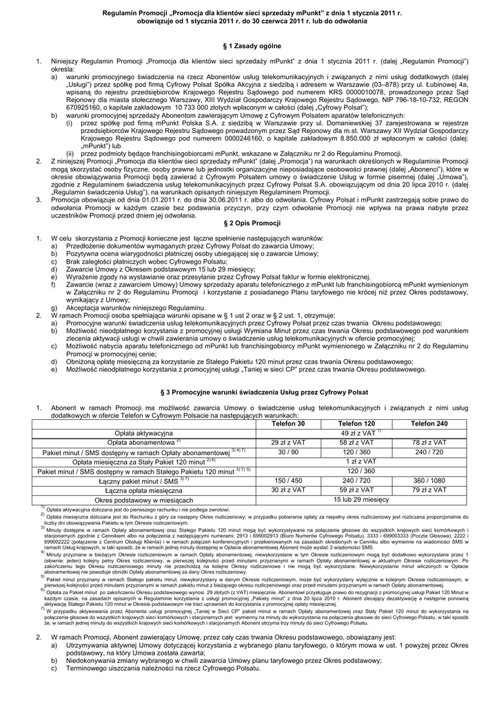Regulamin Promocji „Promocja dla klientów sieci sprzedaży mPunkt” z dnia 1 stycznia 2011 r. obowiązuje od 1 stycznia 2011 r. do 30 czerwca 2011 r. lub do odwołania § 1 Zasady ogólne 1. 2. 3. 1. 2. Niniejszy Regulamin Promocji „Promocja dla klientów sieci sprzedaży mPunkt” z dnia 1 stycznia 2011 r. (dalej „Regulamin Promocji”) określa: a) warunki promocyjnego świadczenia na rzecz Abonentów usług telekomunikacyjnych i związanych z nimi usług dodatkowych (dalej „Usługi”) przez spółkę pod firmą Cyfrowy Polsat Spółka Akcyjna z siedzibą i adresem w Warszawie (03–878) przy ul. Łubinowej 4a, wpisaną do rejestru przedsiębiorców Krajowego Rejestru Sądowego pod numerem KRS 0000010078, prowadzonego przez Sąd Rejonowy dla miasta stołecznego Warszawy, XIII Wydział Gospodarczy Krajowego Rejestru Sądowego, NIP 796-18-10-732, REGON 670925160, o kapitale zakładowym 10 733 000 złotych wpłaconym w całości (dalej „Cyfrowy Polsat”); b) warunki promocyjnej sprzedaży Abonentom zawierającym Umowę z Cyfrowym Polsatem aparatów telefonicznych: (i) przez spółkę pod firmą mPunkt Polska S.A. z siedzibą w Warszawie przy ul. Domaniewskiej 37 zarejestrowana w rejestrze przedsiębiorców Krajowego Rejestru Sądowego prowadzonym przez Sąd Rejonowy dla m.st. Warszawy XII Wydział Gospodarczy Krajowego Rejestru Sądowego pod numerem 0000246160, o kapitale zakładowym 8.850.000 zł wpłaconym w całości (dalej: „mPunkt”) lub (ii) przez podmioty będące franchisingobiorcami mPunkt, wskazane w Załączniku nr 2 do Regulaminu Promocji. Z niniejszej Promocji „Promocja dla klientów sieci sprzedaży mPunkt” (dalej „Promocja”) na warunkach określonych w Regulaminie Promocji mogą skorzystać osoby fizyczne, osoby prawne lub jednostki organizacyjne nieposiadające osobowości prawnej (dalej „Abonenci”), które w okresie obowiązywania Promocji będą zawierać z Cyfrowym Polsatem umowy o świadczenie Usług w formie pisemnej (dalej „Umowa”), zgodnie z Regulaminem świadczenia usług telekomunikacyjnych przez Cyfrowy Polsat S.A. obowiązującym od dnia 20 lipca 2010 r. (dalej „Regulamin świadczenia Usług”), na warunkach opisanych niniejszym Regulaminem Promocji. Promocja obowiązuje od dnia 01.01.2011 r. do dnia 30.06.2011 r. albo do odwołania. Cyfrowy Polsat i mPunkt zastrzegają sobie prawo do odwołania Promocji w każdym czasie bez podawania przyczyn, przy czym odwołanie Promocji nie wpływa na prawa nabyte przez uczestników Promocji przed dniem jej odwołania. § 2 Opis Promocji W celu skorzystania z Promocji konieczne jest łączne spełnienie następujących warunków: a) Przedłożenie dokumentów wymaganych przez Cyfrowy Polsat do zawarcia Umowy; b) Pozytywna ocena wiarygodności płatniczej osoby ubiegającej się o zawarcie Umowy; c) Brak zaległości płatniczych wobec Cyfrowego Polsatu; d) Zawarcie Umowy z Okresem podstawowym 15 lub 29 miesięcy; e) Wyrażenie zgody na wystawianie oraz przesyłanie przez Cyfrowy Polsat faktur w formie elektronicznej. f) Zawarcie (wraz z zawarciem Umowy) Umowy sprzedaży aparatu telefonicznego z mPunkt lub franchisingobiorcą mPunkt wymienionym w Załączniku nr 2 do Regulaminu Promocji i korzystanie z posiadanego Planu taryfowego nie krócej niż przez Okres podstawowy, wynikający z Umowy; g) Akceptacja warunków niniejszego Regulaminu. W ramach Promocji osoba spełniająca warunki opisane w § 1 ust 2 oraz w § 2 ust. 1, otrzymuje: a) Promocyjne warunki świadczenia usług telekomunikacyjnych przez Cyfrowy Polsat przez czas trwania Okresu podstawowego; b) Możliwość nieodpłatnego korzystania z promocyjnej usługi Wymiana Minut przez czas trwania Okresu podstawowego pod warunkiem zlecenia aktywacji usługi w chwili zawierania umowy o świadczenie usług telekomunikacyjnych w ofercie promocyjnej; c) Możliwość nabycia aparatu telefonicznego od mPunkt lub franchisingobiorcy mPunkt wymienionego w Załączniku nr 2 do Regulaminu Promocji w promocyjnej cenie; d) Obniżoną opłatę miesięczną za korzystanie ze Stałego Pakietu 120 minut przez czas trwania Okresu podstawowego; e) Możliwość nieodpłatnego korzystania z promocyjnej usługi „Taniej w sieci CP” przez czas trwania Okresu podstawowego. § 3 Promocyjne warunki świadczenia Usług przez Cyfrowy Polsat Abonent w ramach Promocji ma możliwość zawarcia Umowy o świadczenie usług telekomunikacyjnych i związanych z nimi usług dodatkowych w ofercie Telefon w Cyfrowym Polsacie na następujących warunkach: Telefon 30 Telefon 120 Telefon 240 1) Opłata aktywacyjna 49 zł z VAT 2) Opłata abonamentowa 29 zł z VAT 58 zł z VAT 78 zł z VAT 3) 4) 7) 30 / 90 120 / 360 240 / 720 Pakiet minut / SMS dostępny w ramach Opłaty abonamentowej 2) 6) 1 zł z VAT Opłata miesięczna za Stały Pakiet 120 minut 3) 7) 5) 120 / 360 Pakiet minut / SMS dostępny w ramach Stałego Pakietu 120 minut 3) 7) 150 / 450 240 / 720 360 / 1080 Łączny pakiet minut / SMS 30 zł z VAT 59 zł z VAT 79 zł z VAT Łączna opłata miesięczna 15 lub 29 miesięcy Okres podstawowy w miesiącach 1. 1) Opłata aktywacyjna doliczana jest do pierwszego rachunku i nie podlega zwrotowi. Opłata miesięczna doliczana jest do Rachunku z góry za następny Okres rozliczeniowy; w przypadku pobierania opłaty za niepełny okres rozliczeniowy jest rozliczana proporcjonalnie do liczby dni obowiązywania Pakietu w tym Okresie rozliczeniowym. 3) Minuty dostępne w ramach Opłaty abonamentowej oraz Stałego Pakietu 120 minut mogą być wykorzystywane na połączenia głosowe do wszystkich krajowych sieci komórkowych i stacjonarnych zgodnie z Cennikiem albo na połączenia z następującymi numerami: 2913 i 699002913 (Biuro Numerów Cyfrowego Polsatu), 3333 i 699003333 (Poczta Głosowa), 2222 i 699002222 (połączenie z Centrum Obsługi Klienta) i w ramach połączeń konferencyjnych i przekierowanych na zasadach określonych w Cenniku albo wymienne na wiadomości SMS w rama