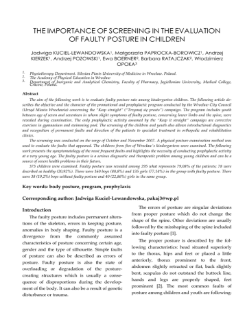 THE IMPORTANCE OF SCREENING IN THE EVALUATION OF FAULTY POSTURE IN CHILDREN Jadwiga KUCIEL-LEWANDOWSKA1, Małgorzata PAPROCKA-BOROWICZ1, Andrzej KIERZEK1, Andrzej POZOWSKI1, Ewa BOERNER2, Barbara RATAJCZAK2, Włodzimierz OPOKA3 1. 2. 3. Physiotherapy Department. Silesian Piasts University of Medicine in Wrocław. Poland. The Academy of Physical Education in Wrocław Department of Inorganic and Analytical Chemistry, Faculty of Pharmacy, Jagiellonian University, Medical College, Cracow, Poland. Abstract The aim of the following work is to evaluate faulty posture rate among kindergarten children. The following article describes the objective and the character of the promotional and prophylactic program conducted by the Wrocław City Council (Urząd Miasta Wrocławia) concerning the “Keep straight” (“Trzymaj się prosto”) campaign. The program includes youth between age of seven and seventeen in whom slight symptoms of faulty posture, concerning lower limbs and the spine, were revealed during examination. The only prophylactic activity assumed by the “Keep it straight” campaign are corrective exercises in gymnasium and swimming pool. The screening of the children and youth also allows introductional diagnostics and recognition of permanent faults and direction of the patients to specialist treatment in orthopedic and rehabilitation clinics. The screening was conducted on the verge of October and November 2007. A physical posture examination method was used to evaluate the faults that appeared. The children from five of Wrocław`s kindergartens were examined. The following work presents the symptomatology of the most frequent faults and highlights the necessity of conducting prophylactic activity at a very young age. The faulty posture is a serious diagnostic and therapeutic problem among young children and can be a source of severe health problems in their future. 373 children were examined. Faulty posture was revealed among 295 what represents 79,08% of the patients; 78 were described as healthy (20,92%). There were 160 boys (80,8%) and 135 girls (77,14%) in the group with faulty posture. There were 38 (19,2%) boys without faulty posture and 40 (22,86%) girls in the same group. Key words: body posture, program, prophylaxis Corresponding author: Jadwiga Kuciel-Lewandowska, [email protected] The errors of posture are singular deviations Introduction The faulty posture includes permanent alterations of the skeleton, errors in keeping posture, anomalies in body shaping. Faulty posture is a divergence from the commonly assumed characteristics of posture concerning certain age, gender and the type of silhouette. Simple faults of posture can also be described as errors of posture. Faulty posture is also the state of overloading or degradation of the posturecreating structures which is usually a consequence of disproportions during the development of the body. It can also be a result of genetic disturbance or trauma. from proper posture which do not change the shape of the spine. Other deviations are usually followed by the misshaping of the spine included into faulty posture [1]. The proper posture is described by the following characteristics: head situated superiorly to the thorax, hips and feet or placed a little anteriorly, thorax prominent to the front, abdomen slightly retracted or flat, back slightly bent, scapulas do not outstand the buttock line, hands and legs are properly shaped, feet prominent [2]. The most common faults of posture among children and youth are following: 1 26-a volumo MIR N-ro curvatures in the lateral and peroneal plane of the spine, knee faults with the advantage of valgity, platypodia and planovalgus feet [3]. 1 (100) Junio 2013 The resources and methods There were 373 children taken into examination, 198 boys and 175 girls. Faulty posture was Defining a proper posture has been a scien- revealed among 295 which represents 79,08% of tific and practical problem for many years. the patients; 78 were described as healthy ( Despite the commonly accepted patterns it is 20,92%). There were 160 boys (80,8%) and 135 often very difficult to define and qualify a girls (77,14%) in the group with faulty posture. posture as proper or faulty, especially when the There were 38 (19,2%) boys without faulty deviations are very slight and hard to observe. posture and 40 (22,86%) girls in the same group. The children in the kindergarten period are The most frequent faults revealed were fol- extremely lively (the somatic type) which is the lowing: planovalgus foot among 234 children, main factor that influences their posture. The which resulted as 62,74%; knee valgity among 54 curves of the spine are already shaped but not children – 14,47%, sinistral lumbar scoliosis yet stable. among 98 children – 26,27%, dextral lumbar The growing number of faulty posture cases scoliosis among 54 children – 14,47%, deepened is a serious social issue. The proper posture, thoracical kyfosis (the round back) among 16 apart from esthetical function, has a big influence children – 4,29%. on health [4]. The occurrence of faulty posture The next criterion of evaluation was the gen- can be a cause of various health contraindica- der. Among 198 boys the following faults were tions. It often influents the choice of the future revealed: planovalgus feet among 32 patients – profession. It has an important role in shaping (66,66%), knee valgity among 28 patients – the quality of life and work [5]. The occurrence of (14,14%), sinistral lumbar scoliosis among 46 faulty posture among children and teenagers is a patients – (23,33%), dextral lumbar scoliosis social problem. Many factors of pathogenesis among 30 patients – (15,15%), the round back and difficulties with revealing its symptoms are among 9 patients – (4,54%), no faults among 38 – highlighted [6]. The pathogenesis of postural (19,19%). Among 175 children the following anomalies factors faults were revealed: planovalgus feet a