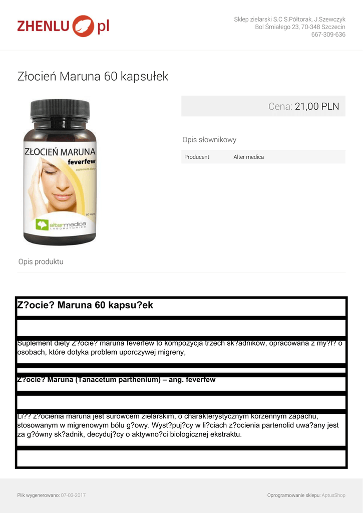 Sklep zielarski S.C S.Półtorak, J.Szewczyk Bol Śmiałego 23, 70-348 Szczecin 667-309-636 Złocień Maruna 60 kapsułek Cena: 21,00 PLN Opis słownikowy Producent Alter medica Opis produktu Z?ocie? Maruna 60 kapsu?ek Suplement diety Z?ocie? maruna feverfew to kompozycja trzech sk?adników, opracowana z my?l? o osobach, które dotyka problem uporczywej migreny, Z?ocie? Maruna (Tanacetum parthenium) – ang. feverfew Li?? z?ocienia maruna jest surowcem zielarskim, o charakterystycznym korzennym zapachu, stosowanym w migrenowym bólu g?owy. Wyst?puj?cy w li?ciach z?ocienia partenolid uwa?any jest za g?ówny sk?adnik, decyduj?cy o aktywno?ci biologicznej ekstraktu. Plik wygenerowano: 07-03-2017 Oprogramowanie sklepu: AptusShop Sklep zielarski S.C S.Półtorak, J.Szewczyk Bol Śmiałego 23, 70-348 Szczecin 667-309-636 Od lat z?ocie? wykorzystywany jest jako ?rodek niweluj?cy bóle migrenowe, menstruacyjne, artretyczne, reumatyczne, z?bów oraz dolegliwo?ci ?o??dkowo - jelitowe. Witamina B2 (ryboflawina) pomaga w prawid?owym funkcjonowaniu nerwów. Witamina B5 (kwas pantotenowy) przyczynia si? do zmniejszenia uczucia zm?czenia i znu?enia. Pomaga w utrzymaniu sprawno?ci umys?owej na prawid?owym poziomie. Zalecane spo?ycie: 1 kapsu?ka dziennie Sk?ad: ekstrakt ze z?ocienia maruny - 4 mg w tym partenolid (6% ) - 0,24 mg Plik wygenerowano: 07-03-2017 Oprogramowanie sklepu: AptusShop Sklep zielarski S.C S.Półtorak, J.Szewczyk Bol Śmiałego 23, 70-348 Szczecin 667-309-636 witamina B2 1,4 mg witamina B5 6 mg Producent: Altermedica, ?ywiec Plik wygenerowano: 07-03-2017 Powered by TCPDF (www.tcpdf.org) Oprogramowanie sklepu: AptusShop
