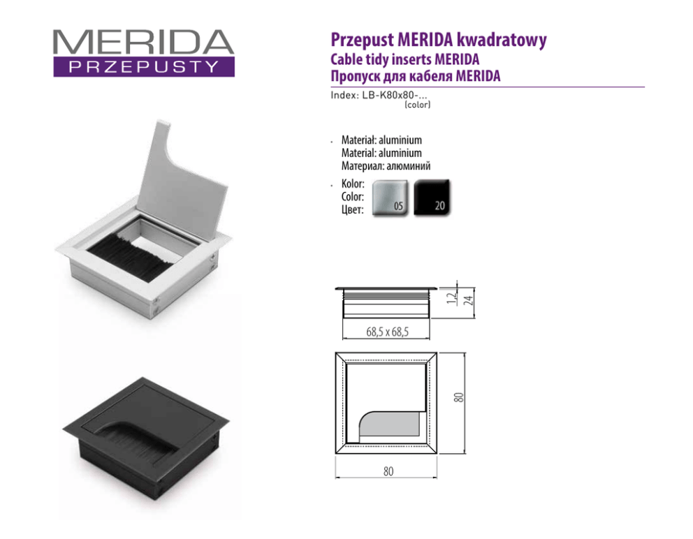 Przepust MERIDA kwadratowy Cable tidy inserts MERIDA Пропуск для кабеля MERIDA Index: LB-K80x80-... (color) Materiał: aluminium Material: aluminium Материал: алюминий • Kolor: Color: Цвет: 1,2 24 • 80 68,5 x 68,5 80