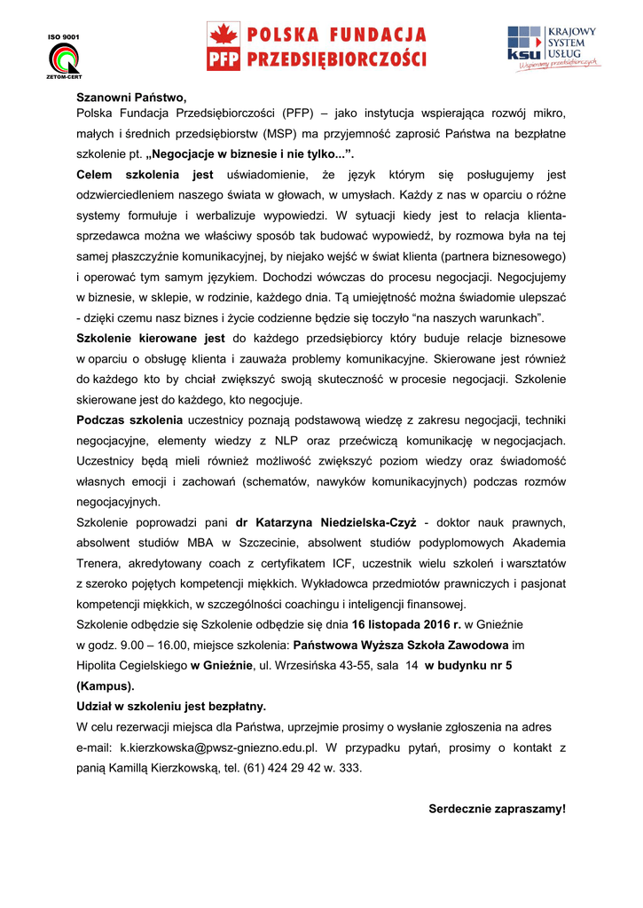 ISO 9001 ZETOM-CERT Szanowni Państwo, Polska Fundacja Przedsiębiorczości (PFP) – jako instytucja wspierająca rozwój mikro, małych i średnich przedsiębiorstw (MSP) ma przyjemność zaprosić Państwa na bezpłatne szkolenie pt. „Negocjacje w biznesie i nie tylko...”. Celem szkolenia jest uświadomienie, że język którym się posługujemy jest odzwierciedleniem naszego świata w głowach, w umysłach. Każdy z nas w oparciu o różne systemy formułuje i werbalizuje wypowiedzi. W sytuacji kiedy jest to relacja klientasprzedawca można we właściwy sposób tak budować wypowiedź, by rozmowa była na tej samej płaszczyźnie komunikacyjnej, by niejako wejść w świat klienta (partnera biznesowego) i operować tym samym językiem. Dochodzi wówczas do procesu negocjacji. Negocjujemy w biznesie, w sklepie, w rodzinie, każdego dnia. Tą umiejętność można świadomie ulepszać - dzięki czemu nasz biznes i życie codzienne będzie się toczyło “na naszych warunkach”. Szkolenie kierowane jest do każdego przedsiębiorcy który buduje relacje biznesowe w oparciu o obsługę klienta i zauważa problemy komunikacyjne. Skierowane jest również do każdego kto by chciał zwiększyć swoją skuteczność w procesie negocjacji. Szkolenie skierowane jest do każdego, kto negocjuje. Podczas szkolenia uczestnicy poznają podstawową wiedzę z zakresu negocjacji, techniki negocjacyjne, elementy wiedzy z NLP oraz przećwiczą komunikację w negocjacjach. Uczestnicy będą mieli również możliwość zwiększyć poziom wiedzy oraz świadomość własnych emocji i zachowań (schematów, nawyków komunikacyjnych) podczas rozmów negocjacyjnych. Szkolenie poprowadzi pani dr Katarzyna Niedzielska-Czyż - doktor nauk prawnych, absolwent studiów MBA w Szczecinie, absolwent studiów podyplomowych Akademia Trenera, akredytowany coach z certyfikatem ICF, uczestnik wielu szkoleń i warsztatów z szeroko pojętych kompetencji miękkich. Wykładowca przedmiotów prawniczych i pasjonat kompetencji miękkich, w szczególności coachingu i inteligencji finansowej. Szkolenie odbędzie się Szkolenie odbędzie się dnia 16 listopada 2016 r. w Gnieźnie w godz. 9.00 – 16.00, miejsce szkolenia: Państwowa Wyższa Szkoła Zawodowa im Hipolita Cegielskiego w Gnieźnie, ul. Wrzesińska 43-55, sala 14 w budynku nr 5 (Kampus). Udział w szkoleniu jest bezpłatny. W celu rezerwacji miejsca dla Państwa, uprzejmie prosimy o wysłanie zgłoszenia na adres e-mail: [email protected]. W przypadku pytań, prosimy o kontakt z panią Kamillą Kierzkowską, tel. (61) 424 29 42 w. 333. Serdecznie zapraszamy! ISO 9001 ZETOM-CERT Program szkolenia „Negocjacje w biznesie i nie tylko” Godzina Temat zajęć 9.00 – 9.15 Powitanie uczestników i wprowadzenie 9.15 – 10.30 Zintegrowanie grupy Dynamika negocjacji: -przygotowanie i planowanie w negocjacjach -uwzględnienie teoretycznych aspektów negocjacji – BATNA, ZOPA i CENA GRANICZNA 10.30 – 10.45 10.45 – 12.15 12.15 – 12.45 12.30 – 14.00 14.00 – 14.15 14.15 – 16.00 16.00 Przerwa Komunikacja w negocjacjach: -postawy negocjacyjne, -style w negocjacjach: win/win, negojacje miękkie/twarde) -cel negocjacji, np. typu SMART, a pozycja partnerów (cw. na wartości i umiejętność panowania nad emocjami, budowanie pewności siebie i asertywność negocjatora) . -komunikacja werbalna/niewerbalna; pytania otwarte/pytania zamknięte; język ciała w negocjacjach Przerwa Techniki wywierania wpływu w negocjacjach – przedstawienie oraz przećwiczenie w formie warsztatowej technik: -pierwsza oferta -”próbny balon” -wzbudzanie współczucia -wycofywanie się -bagatelizowanie/straszenie konkurencją itp. Przerwa Techniki wywierania wpływu w negocjacjach – przedstawienie oraz przećwiczenie w formie warsztatowej technik: -pierwsza oferta -”próbny balon” -wzbudzanie współczucia -wycofywanie się -bagatelizowanie/straszenie konkurencją itp. Zakończenie szkolenia