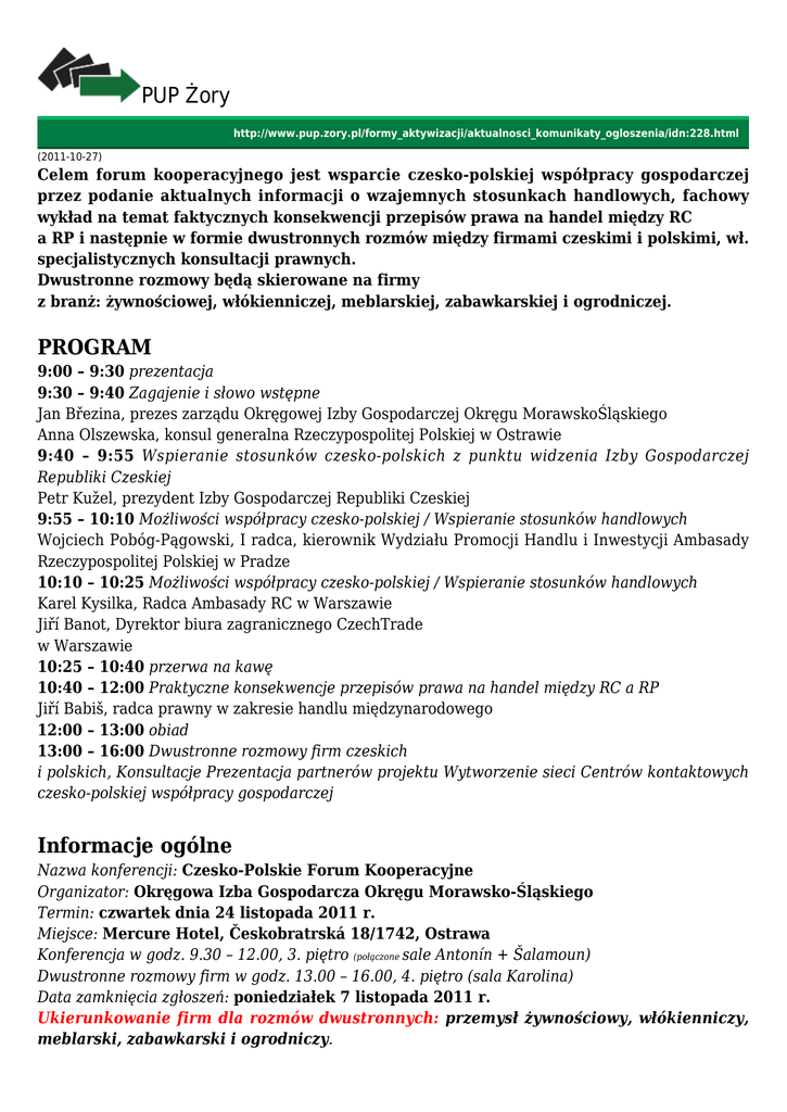 PUP Żory http://www.pup.zory.pl/formy_aktywizacji/aktualnosci_komunikaty_ogloszenia/idn:228.html (2011-10-27) Celem forum kooperacyjnego jest wsparcie czesko-polskiej współpracy gospodarczej przez podanie aktualnych informacji o wzajemnych stosunkach handlowych, fachowy wykład na temat faktycznych konsekwencji przepisów prawa na handel między RC a RP i następnie w formie dwustronnych rozmów między firmami czeskimi i polskimi, wł. specjalistycznych konsultacji prawnych. Dwustronne rozmowy będą skierowane na firmy z branż: żywnościowej, włókienniczej, meblarskiej, zabawkarskiej i ogrodniczej. PROGRAM 9:00 – 9:30 prezentacja 9:30 – 9:40 Zagajenie i słowo wstępne Jan Březina, prezes zarządu Okręgowej Izby Gospodarczej Okręgu MorawskoŚląskiego Anna Olszewska, konsul generalna Rzeczypospolitej Polskiej w Ostrawie 9:40 – 9:55 Wspieranie stosunków czesko-polskich z punktu widzenia Izby Gospodarczej Republiki Czeskiej Petr Kužel, prezydent Izby Gospodarczej Republiki Czeskiej 9:55 – 10:10 Możliwości współpracy czesko-polskiej / Wspieranie stosunków handlowych Wojciech Pobóg-Pągowski, I radca, kierownik Wydziału Promocji Handlu i Inwestycji Ambasady Rzeczypospolitej Polskiej w Pradze 10:10 – 10:25 Możliwości współpracy czesko-polskiej / Wspieranie stosunków handlowych Karel Kysilka, Radca Ambasady RC w Warszawie Jiří Banot, Dyrektor biura zagranicznego CzechTrade w Warszawie 10:25 – 10:40 przerwa na kawę 10:40 – 12:00 Praktyczne konsekwencje przepisów prawa na handel między RC a RP Jiří Babiš, radca prawny w zakresie handlu międzynarodowego 12:00 – 13:00 obiad 13:00 – 16:00 Dwustronne rozmowy firm czeskich i polskich, Konsultacje Prezentacja partnerów projektu Wytworzenie sieci Centrów kontaktowych czesko-polskiej współpracy gospodarczej Informacje ogólne Nazwa konferencji: Czesko-Polskie Forum Kooperacyjne Organizator: Okręgowa Izba Gospodarcza Okręgu Morawsko-Śląskiego Termin: czwartek dnia 24 listopada 2011 r. Miejsce: Mercure Hotel, Českobratrská 18/1742, Ostrawa Konferencja w godz. 9.30 – 12.00, 3. piętro (połączone sale Antonín + Šalamoun) Dwustronne rozmowy firm w godz. 13.00 – 16.00, 4. piętro (sala Karolina) Data zamknięcia zgłoszeń: poniedziałek 7 listopada 2011 r. Ukierunkowanie firm dla rozmów dwustronnych: przemysł żywnościowy, włókienniczy, meblarski, zabawkarski i ogrodniczy. Inne odbywające się imprezy: • wstęp wolny uczestników forum na 11. rocznik wystawy firm żywnościowych oraz konkursu uczniów w branży gastronomicznej Gastrofestival Ostrava, odbywającej się w dniach 24. – 26. 11. 2011 r. na Placu Wystawowym Czarna Łąka Ostrawa • konferencja prasowa o projekcie „Wytworzenie sieci Centrów kontaktowych czesko-polskiej współpracy handlowej“, odbywająca się w dniu 24. 11. 2011 r. w Mercure Hotelu. FORMULARZ ZGŁOSZENIOWY Gwarant fachowy: Magda Habrmanová tel.: +420 597 479 325 e-mail: [email protected] Osoby do kontaktu: Markéta Hippmannová tel.: +420 597 479 328 kom.: +420 724 613 916 fax: +420 597 479 324 e-mail: [email protected] Barbora Sikorová tel.: +420 597 479 332 kom.: +420 724 613 914 fax: +420 597 479 324 e-mail: [email protected] Okręgowa Izba Gospodarcza Okręgu Morawsko-Śląskiego Výstavní 2224/8, 709 00 Ostrava – Mariánské Hory http://www.khkmsk.cz zobacz wszystkie aktualności