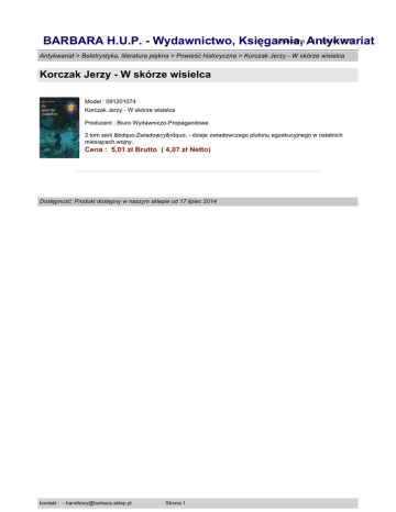 Utworzono Antykwariat : 07 marzec 2017 BARBARA H.U.P. - Wydawnictwo, Księgarnia, Antykwariat > Beletrystyka, literatura piękna > Powieść historyczna > Korczak Jerzy - W skórze wisielca Korczak Jerzy - W skórze wisielca Model : 091201074 Korczak Jerzy - W skórze wisielca Producent : Biuro Wydawniczo-Propagandowe 2 tom serii „Zwiadowcy” - dzieje zwiadowczego plutonu egzekucyjnego w ostatnich miesiącach wojny. Cena : 5,01 zł Brutto ( 4,07 zł Netto) Dostępność: Produkt dostępny w naszym sklepie od 17 lipiec 2014 kontakt : - [email protected] Strona 1