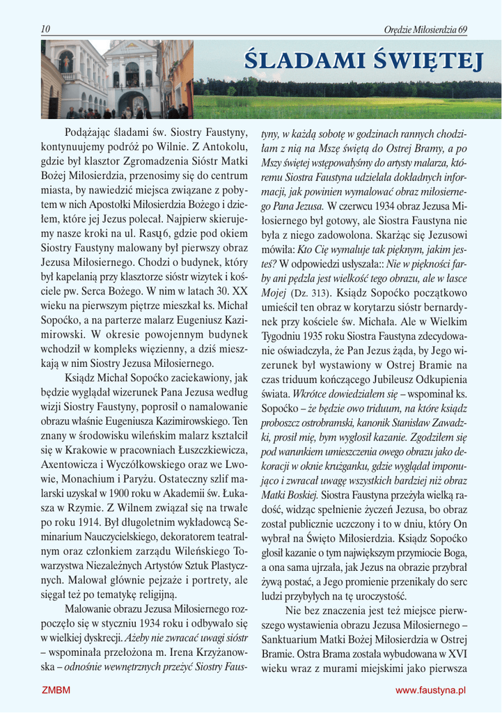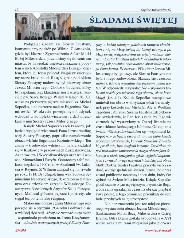 10 Orędzie Miłosierdzia 69 ŒLADAMI ŒWIÊTEJ Podążając śladami św. Siostry Faustyny, kontynuujemy podróż po Wilnie. Z Antokolu, gdzie był klasztor Zgromadzenia Sióstr Matki Bożej Miłosierdzia, przenosimy się do centrum miasta, by nawiedzić miejsca związane z pobytem w nich Apostołki Miłosierdzia Bożego i dziełem, które jej Jezus polecał. Najpierw skierujemy nasze kroki na ul. Ras 6, gdzie pod okiem Siostry Faustyny malowany był pierwszy obraz Jezusa Miłosiernego. Chodzi o budynek, który był kapelanią przy klasztorze sióstr wizytek i kościele pw. Serca Bożego. W nim w latach 30. XX wieku na pierwszym piętrze mieszkał ks. Michał Sopoćko, a na parterze malarz Eugeniusz Kazimirowski. W okresie powojennym budynek wchodził w kompleks więzienny, a dziś mieszkają w nim Siostry Jezusa Miłosiernego. Ksiądz Michał Sopoćko zaciekawiony, jak będzie wyglądał wizerunek Pana Jezusa według wizji Siostry Faustyny, poprosił o namalowanie obrazu właśnie Eugeniusza Kazimirowskiego. Ten znany w środowisku wileńskim malarz kształcił się w Krakowie w pracowniach Łuszczkiewicza, Axentowicza i Wyczółkowskiego oraz we Lwowie, Monachium i Paryżu. Ostateczny szlif malarski uzyskał w 1900 roku w Akademii św. Łukasza w Rzymie. Z Wilnem związał się na trwałe po roku 1914. Był długoletnim wykładowcą Seminarium Nauczycielskiego, dekoratorem teatralnym oraz członkiem zarządu Wileńskiego Towarzystwa Niezależnych Artystów Sztuk Plastycznych. Malował głównie pejzaże i portrety, ale sięgał też po tematykę religijną. Malowanie obrazu Jezusa Miłosiernego rozpoczęło się w styczniu 1934 roku i odbywało się w wielkiej dyskrecji. Ażeby nie zwracać uwagi sióstr – wspominała przełożona m. Irena Krzyżanowska – odnośnie wewnętrznych przeżyć Siostry FausZMBM tyny, w każdą sobotę w godzinach rannych chodziłam z nią na Mszę świętą do Ostrej Bramy, a po Mszy świętej wstępowałyśmy do artysty malarza, któremu Siostra Faustyna udzielała dokładnych informacji, jak powinien wymalować obraz miłosiernego Pana Jezusa. W czerwcu 1934 obraz Jezusa Miłosiernego był gotowy, ale Siostra Faustyna nie była z niego zadowolona. Skarżąc się Jezusowi mówiła: Kto Cię wymaluje tak pięknym, jakim jesteś? W odpowiedzi usłyszała:: Nie w piękności farby ani pędzla jest wielkość tego obrazu, ale w łasce Mojej (Dz. 313). Ksiądz Sopoćko początkowo umieścił ten obraz w korytarzu sióstr bernardynek przy kościele św. Michała. Ale w Wielkim Tygodniu 1935 roku Siostra Faustyna zdecydowanie oświadczyła, że Pan Jezus żąda, by Jego wizerunek był wystawiony w Ostrej Bramie na czas triduum kończącego Jubileusz Odkupienia świata. Wkrótce dowiedziałem się – wspominał ks. Sopoćko – że będzie owo triduum, na które ksiądz proboszcz ostrobramski, kanonik Stanisław Zawadzki, prosił mię, bym wygłosił kazanie. Zgodziłem się pod warunkiem umieszczenia owego obrazu jako dekoracji w oknie krużganku, gdzie wyglądał imponująco i zwracał uwagę wszystkich bardziej niż obraz Matki Boskiej. Siostra Faustyna przeżyła wielką radość, widząc spełnienie życzeń Jezusa, bo obraz został publicznie uczczony i to w dniu, który On wybrał na Święto Miłosierdzia. Ksiądz Sopoćko głosił kazanie o tym największym przymiocie Boga, a ona sama ujrzała, jak Jezus na obrazie przybrał żywą postać, a Jego promienie przenikały do serc ludzi przybyłych na tę uroczystość. Nie bez znaczenia jest też miejsce pierwszego wystawienia obrazu Jezusa Miłosiernego – Sanktuarium Matki Bożej Miłosierdzia w Ostrej Bramie. Ostra Brama została wybudowana w XVI wieku wraz z murami miejskimi jako pierwsza www.faustyna.pl styczeń, luty, marzec 2009 11 SIOSTRY FAUSTYNY (9) z bram miasta. Przez nią prowadził trakt do Miednik, Oszmiany i Mińska, stąd początkowo zwana była Bramą Miednicką, a także „Zaranną”. Później nazwano ją Ostrą ze względu na południowy kraniec miasta zwany właśnie Ostrym. W bramie umieszczono obraz Matki Bożej, który już w XVII wieku cieszył się wielką czcią. Opiekę nad nim przejęli karmelici posługujący w przylegającym do Ostrej Bramy kościele św. Teresy. W 1671 wybudowano drewnianą kaplicę, która po niespełna pięćdziesięciu latach spłonęła. Na jej miejscu w roku 1829 zbudowano nową, murowaną, w stylu neoklasycznym. O wielkiej miłości Wilnian do Matki Bożej Ostrobramskiej świadczą chociażby bardzo liczne wota. Już w XVIII wieku Matka Boża otrzymała, prawdopodobnie od cechu złotników, piękną suknię wykonaną z pozłacanego srebra. W wieku XX obraz był dwukrotnie koronowany papieskimi koronami, a Matce Bożej Ostrobramskiej nadano tytuł Matki Miłosierdzia. W marcu 1936 roku Siostra Faustyna na stałe wyjechała z Wilna, ale ks. Sopoćko kontynuował jej misję w tym mieście. Na wszelkie sposoby starał się propagować nabożeństwo do Bożego Miłosierdzia, a także zgłębiał teologiczną wiedzę na temat tej tajemnicy. W Wilnie pozostały więc inne miejsca związane nie tyle z samą Siostrą Faustyną, co z misją zleconą jej przez Pana Jezusa. Warto wspomnieć tu o kościele św. Michała Archanioła, gdyż to właśnie w nim, od 1937 roku do czasu zamknięcia kościoła w 1948 roku, wisiał obraz Jezusa Miłosiernego. W miejscu tego kościoła i klasztoru sióstr bernardynek znajdował się kiedyś średniowieczny pałac rodziny Sapiehów. Wielki hetman litewski i wojewoda wileński, Lew Sapieha, podarował pałac bernardynkom i dostosował budowlę do potrzeb klasztoru. W latach 1594-1596 zbudował przy klasztorze kościół ZMBM pod wezwaniem Świętego Michała Archanioła. W 1933 kościół i klasztor poddano renowacji, niestety w 1948 roku został zamknięty, a od 1956 pełni rolę muzeum architektury. Po zamknięciu kościoła św. Michała, jego wyposażenie, a więc także obraz Jezusa Miłosiernego, przeniesiono do k