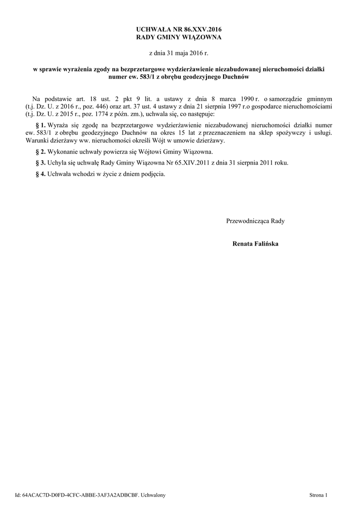 UCHWAŁA NR 86.XXV.2016 RADY GMINY WIĄZOWNA z dnia 31 maja 2016 r. w sprawie wyrażenia zgody na bezprzetargowe wydzierżawienie niezabudowanej nieruchomości działki numer ew. 583/1 z obrębu geodezyjnego Duchnów Na podstawie art. 18 ust. 2 pkt 9 lit. a ustawy z dnia 8 marca 1990 r. o samorządzie gminnym (t.j. Dz. U. z 2016 r., poz. 446) oraz art. 37 ust. 4 ustawy z dnia 21 sierpnia 1997 r.o gospodarce nieruchomościami (t.j. Dz. U. z 2015 r., poz. 1774 z późn. zm.), uchwala się, co następuje: § 1. Wyraża się zgodę na bezprzetargowe wydzierżawienie niezabudowanej nieruchomości działki numer ew. 583/1 z obrębu geodezyjnego Duchnów na okres 15 lat z przeznaczeniem na sklep spożywczy i usługi. Warunki dzierżawy ww. nieruchomości określi Wójt w umowie dzierżawy. § 2. Wykonanie uchwały powierza się Wójtowi Gminy Wiązowna. § 3. Uchyla się uchwałę Rady Gminy Wiązowna Nr 65.XIV.2011 z dnia 31 sierpnia 2011 roku. § 4. Uchwała wchodzi w życie z dniem podjęcia. Przewodnicząca Rady Renata Falińska Id: 64ACAC7D-D0FD-4CFC-ABBE-3AF3A2ADBCBF. Uchwalony Strona 1 Załącznik do Uchwały Nr 86.XXV.2016 Rady Gminy Wiązowna z dnia 31 maja 2016 r. Id: 64ACAC7D-D0FD-4CFC-ABBE-3AF3A2ADBCBF. Uchwalony Strona 2 Uzasadnienie Art. 18 ust. 2 pkt 9 lit a, ustawy z dnia 8 marca 1990 r. o samorządzie gminnym zastrzega do wyłącznej właściwości rady gminy podejmowanie uchwał w sprawach majątkowych gminy przekraczających zakres zwykłego zarządu, dotyczący zasad nabywania, zbywania i obciążania nieruchomości oraz ich wydzierżawiania lub wynajmowania na czas oznaczony dłuższy niż 3 lata lub na czas nieoznaczony. Natomiast art. 37 ust. 4 ustawy z dnia 21 sierpnia 1997 r. o gospodarce nieruchomościami upoważnia odpowiednią radę do wyrażenia zgody na odstąpienie od obowiązku przetargowego trybu zawarcia umów użytkowania, najmu lub dzierżawy. Teren dzierżawy przeznaczony będzie na wybudowanie nowego sklepu spożywczego. Obecnie sklep spożywczy znajduje się na działce 389 z obrębu Duchnów (grunt przekazany w darowiźnie na własność Gminy Wiązowna przez Wspólnotę Gruntową wsi Duchnów), który zgodnie z warunkami umowy darowizny może być prowadzony do 31.12.2017 r. W okresie przeszło 20 lat działalności, osoba prowadząca sklep spożywczy (na podstawie umowy najmu z Gminą Wiązowną od 01.02.1992 r.) wpisała się w lokalny rynek handlowy, czego dowodem jest stabilność prowadzonej działalności oraz liczne grono klientów. Przedsiębiorca nadal deklaruje wolę prowadzenia działalności gospodarczej, zaspokajającej lokalne potrzeby mieszkańców tj. sklep spożywczy, na co gotów jest ponieść stosowne nakłady. Po uzyskaniu pozwolenia na budowę, przedsiębiorca wybuduje na przedmiotowym terenie budynek, w którym prowadzić będzie sklep spożywczy. Po zakończeniu umowy dzierżawy, poniesione nakłady stanowić będą własność Gminy Wiązowna. Przewodnicząca Rady Renata Falińska Id: 64ACAC7D-D0FD-4CFC-ABBE-3AF3A2ADBCBF. Uchwalony Strona 1