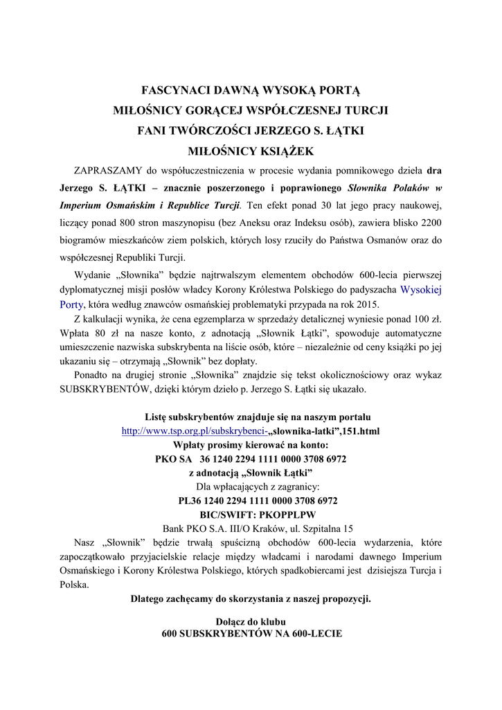FASCYNACI DAWNĄ WYSOKĄ PORTĄ MIŁOŚNICY GORĄCEJ WSPÓŁCZESNEJ TURCJI FANI TWÓRCZOŚCI JERZEGO S. ŁĄTKI MIŁOŚNICY KSIĄŻEK ZAPRASZAMY do współuczestniczenia w procesie wydania pomnikowego dzieła dra Jerzego S. ŁĄTKI – znacznie poszerzonego i poprawionego Słownika Polaków w Imperium Osmańskim i Republice Turcji. Ten efekt ponad 30 lat jego pracy naukowej, liczący ponad 800 stron maszynopisu (bez Aneksu oraz Indeksu osób), zawiera blisko 2200 biogramów mieszkańców ziem polskich, których losy rzuciły do Państwa Osmanów oraz do współczesnej Republiki Turcji. Wydanie „Słownika” będzie najtrwalszym elementem obchodów 600-lecia pierwszej dyplomatycznej misji posłów władcy Korony Królestwa Polskiego do padyszacha Wysokiej Porty, która według znawców osmańskiej problematyki przypada na rok 2015. Z kalkulacji wynika, że cena egzemplarza w sprzedaży detalicznej wyniesie ponad 100 zł. Wpłata 80 zł na nasze konto, z adnotacją „Słownik Łątki”, spowoduje automatyczne umieszczenie nazwiska subskrybenta na liście osób, które – niezależnie od ceny książki po jej ukazaniu się – otrzymają „Słownik” bez dopłaty. Ponadto na drugiej stronie „Słownika” znajdzie się tekst okolicznościowy oraz wykaz SUBSKRYBENTÓW, dzięki którym dzieło p. Jerzego S. Łątki się ukazało. Listę subskrybentów znajduje się na naszym portalu http://www.tsp.org.pl/subskrybenci-„slownika-latki”,151.html Wpłaty prosimy kierować na konto: PKO SA 36 1240 2294 1111 0000 3708 6972 z adnotacją „Słownik Łątki” Dla wpłacających z zagranicy: PL36 1240 2294 1111 0000 3708 6972 BIC/SWIFT: PKOPPLPW Bank PKO S.A. III/O Kraków, ul. Szpitalna 15 Nasz „Słownik” będzie trwałą spuścizną obchodów 600-lecia wydarzenia, które zapoczątkowało przyjacielskie relacje między władcami i narodami dawnego Imperium Osmańskiego i Korony Królestwa Polskiego, których spadkobiercami jest dzisiejsza Turcja i Polska. Dlatego zachęcamy do skorzystania z naszej propozycji. Dołącz do klubu 600 SUBSKRYBENTÓW NA 600-LECIE