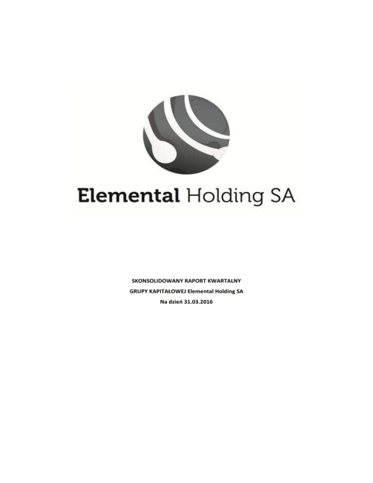 SKONSOLIDOWANY RAPORT KWARTALNY GRUPY KAPITAŁOWEJ Elemental Holding SA Na dzień 31.03.2016 Spis Treści A. OŚWIADCZENIE ZARZĄDU B. WYBRANE DANE FINANSOWE C. KWARTALNE SKONSOLIDOWANE SPRAWOZDANIE FINANSOWE GRUPY KAPITAŁOWEJ ELEMENTAL HOLDING SA D. KWARTALNE SKRÓCONE SPRAWOZDANIE FINANSOWE ELEMENTAL HOLDING SA Strona 2 z 73 A. OŚWIADCZENIE ZARZĄDU Na podstawie rozporządzenia Ministra Finansów z dnia 19 lutego 2009 roku w sprawie informacji bieżących i okresowych przekazywanych przez emitentów papierów wartościowych oraz warunków uznawania za równoważne informacji wymaganych przepisami prawa państwa niebędącego państwem członkowskim (Dz.U.2014.133), dalej jako „Rozporządzenie”, Zarząd Spółki dominującej oświadcza, że wedle swojej najlepszej wiedzy, niniejsze skonsolidowane sprawozdanie finansowe i dane porównywalne oraz jednostkowe sprawozdanie i dane porównywalne Emitenta sporządzone zostały zgodnie z obowiązującymi Grupę zasadami rachunkowości oraz że odzwierciedlają w sposób prawdziwy, rzetelny i jasny sytuację majątkową i finansową Grupy Kapitałowej oraz jej wynik finansowy. Niniejsze skonsolidowane sprawozdanie finansowe zostało przygotowane przy zastosowaniu zasad rachunkowości, zgodnie z Międzynarodowymi Standardami Sprawozdawczości Finansowej, które zostały zatwierdzone przez Unię Europejska oraz w zakresie wymaganym przez Rozporządzenie. Sprawozdanie to obejmuje okres od 01 stycznia do 31 marca 2016 roku i okresy porównywalne od 01 stycznia do 31 marca 2015 roku. Zgodnie z przyjętymi zasadami ładu korporacyjnego Rada Nadzorcza dokonała dnia 05 kwietnia 2016 roku wyboru biegłego rewidenta. Dokonując powyższego wyboru miała na uwadze zagwarantowanie pełnej niezależności i obiektywizmu samego wyboru. Strona 3 z 73 SKONSOLIDOWANE SPRAWOZDANIE FINANSOWE GRUPY KAPITAŁOWEJ Elemental Holding S.A. za okres 01.01.– 31.03.2016 r. oraz okres porównywalny za 01.01.-31.03.2015 r. (wszystkie kwoty podane są w tys. złotych o ile nie podano inaczej) B. WYBRANE DANE FINANSOWE INFORMACJE OGÓLNE I. Dane jednostki dominującej z prawnego punktu widzenia: Nazwa: Elemental Holding SA Forma prawna: spółka akcyjna Siedziba: Kraj rejestracji: ul. Traugutta 42A, 05-825 Grodzisk Mazowiecki Polska Podstawowy przedmiot działalności: Zasadniczym przedmiotem działalności Spółki dominującej jest działalność rachunkowo-księgowa, doradztwo podatkowe oraz działalność firm centralnych i holdingów Organ prowadzący rejestr: Numer statystyczny REGON: NIP: Sąd Rejonowy dla miasta stołecznego Warszawy w Warszawie XIV Wydział Gospodarczy – KRS pod numerem KRS 0000375737 141534442 5291756419 Spółka dominująca została utworzona aktem notarialnym z dnia 14 sierpnia 2008 roku pod firmą Synergis Metalrecycling spółka z ograniczoną odpowiedzialnością. Spółka Synergis Metalrecycling sp. z o.o. została przekształcona w spółkę Elemental Holding SA na podstawie Uchwały nr 1 Nadzwyczajnego Zgromadzenia Wspólników Synergis Metalrecycling sp. z o.o. z dnia 14 grudnia 2010 roku. II. Czas trwania grupy kapitałowej: Spółka dominująca Elemental Holding SA i pozostałe jednostki Grupy Kapitałowej zostały utworzone na czas nieoznaczony. III. Okresy prezentowane Historyczne skonsolidowane informacje finansowe zawierają dane za okres od 01 stycznia 2016 roku do 31 marca 2016 roku. Dane porównawcze prezentowane są według stanu na dzień 31 marca 2015 roku dla skonsolidowanego sprawozdania z sytuacji finansowej, za okres od 01 stycznia 2015 roku do 31 marca 2015 roku dla skonsolidowanego rachunku zysków i strat, skonsolidowanego sprawozdania z całkowitych dochodów, skonsolidowanego sprawozdania z przepływów pieniężnych oraz sprawozdania ze zmian w skonsolidowanym kapitale własnym. IV. Skład organów jednostki dominującej według stanu na dzień 31.03.2016 r : Zarząd: Na dzień 31.03.2016 r.: Paweł Jarski-PREZES ZARZĄDU Jarosław Michalik-WICEPREZES ZARZĄDU W prezentowanym okresie nie było zmian w składzie zarządu. SKONSOLIDOWANE SPRAWOZDANIE FINANSOWE GRUPY KAPITAŁOWEJ Elemental Holding S.A. za okres 01.01.– 31.03.2016 r. oraz okres porównywalny za 01.01.-31.03.2015 r. (wszystkie kwoty podane są w tys. złotych o ile nie podano inaczej) Rada Nadzorcza 31.03.2016 Kadencja Agata Jarska Przewodnicząca Rady Nadzorczej 11.06.2015 – 10.06.2018 Sylwia Błaszczak Członek Rady Nadzorczej 11.06.2015 – 10.06.2018 Paweł Błaszczak Członek Rady Nadzorczej 09.09.2015 – 10.06.2018 Tomasz Malinowski Członek Rady Nadzorczej 11.06.2015 – 10.06.2018 Aleksander Baryś Członek Rady Nadzorczej Sekretarz Rady Nadzorczej 09.09.2015 – 10.06.2018 30.09.2015 – 10.06.2018 Krzysztof Szymański Członek Rady Nadzorczej 09.09.2015 – 10.06.2018 Zmiany w składzie Rady Nadzorczej w prezentowanym okresie Dnia 22 stycznia 2016 roku Pan Rafał Bator złożył rezygnację z pełnienia funkcji członka Rady Nadzorczej Emitenta. Przyczyny rezygnacji nie zostały podane. V. Znaczący akcjonariusze jednostki dominującej: Według stanu na dzień 31.03.2016 r. akcjonariuszami posiadającymi istotny udział głosów na Walnym Zgromadzeniu byli: Akcjonariusz Liczba akcji % kapitału akcyjnego Liczba głosów % głosów Reventon FIZ* 45 128 721 26,47% 45 128 721 26,47% Ibah Holdings Limited 22 196 257 13,02% 22 196 257 13,02% EVF I Investments S.a.r.l.** 15 714 712 9,22% 15 714 712 9,22% OFE Nationale Nederlanden (ING OFE) 15 400 000 9,03% 15 400 000 9,03% Pozostali 72 026 375 42,26% 72 026 375 42,26% 170 466 065 100,00% 170 466 065 100,00% Razem Dane na dzień 31.03.2016 r. * Reventon Fundusz Inwestycyjny Zamknięty, zarządzany przez ALTUS Towarzystwo Funduszy Inwestycyjnych S.A. ** fundusz venture capital w grupie Enterprise Investors Strona 5 z 73 SKONSOLIDOWANE SPRAWOZDANIE FINANSOWE GRUPY KAPITAŁOWEJ Elemental Holding S.A. za okres 01.01.– 31.03.2016 r. oraz okres porównywalny za 01.01.-31.03.2015 r. (wszystkie k