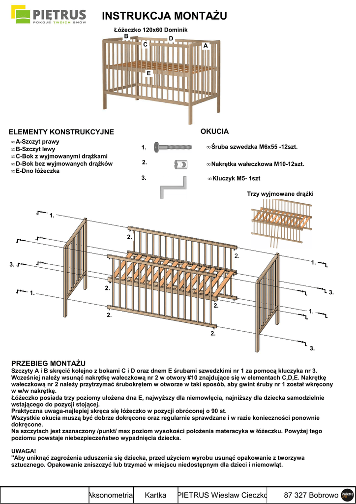 INSTRUKCJA MONTAŻU Łóżeczko 120x60 Dominik B D BB DD B C A D C CC AA EE E OKUCIA ELEMENTY KONSTRUKCYJNE • • • • • A-Szczyt prawy B-Szczyt lewy C-Bok z wyjmowanymi drążkami D-Bok bez wyjmowanych drążków E-Dno łóżeczka 1. • Śruba szwedzka M6x55 -12szt. 2. • Nakrętka wałeczkowa M10-12szt. 3. • Kluczyk M5- 1szt Trzy wyjmowane drążki 3. 1. 1. 1. 2. 2. 2. 3. 3. 3. 1. 2.2. 2. 1. 1. 1. 1. 2.2. 2. 1. 1. 1. 3.3. 1. 2. 2.2. 2. 2. 2. 2.2.2. 1. 1. 3. 1. 1. 3. 3. PRZEBIEG MONTAŻU Szczyty A i B skręcić kolejno z bokami C i D oraz dnem E śrubami szwedzkimi nr 1 za pomocą kluczyka nr 3. Wcześniej należy wsunąć nakrętkę wałeczkową nr 2 w otwory #10 znajdujące się w elementach C,D,E. Nakrętkę wałeczkową nr 2 należy przytrzymać śrubokrętem w otworze w taki sposób, aby gwint śruby nr 1 został wkręcony w w/w nakrętkę. Łóżeczko posiada trzy poziomy ułożena dna E, najwyższy dla niemowlęcia, najniższy dla dziecka samodzielnie wstającego do pozycji stojącej. Praktyczna uwaga-najlepiej skręca się łóżeczko w pozycji obróconej o 90 st. Wszystkie okucia muszą być dobrze dokręcone oraz regularnie sprawdzane i w razie konieczności ponownie dokręcone. Na szczytach jest zaznaczony /punkt/ max poziom wysokości położenia materacyka w łóżeczku. Powyżej tego poziomu powstaje niebezpieczeństwo wypadnięcia dziecka. UWAGA! "Aby uniknąć zagrożenia uduszenia się dziecka, przed użyciem wyrobu usunąć opakowanie z tworzywa sztucznego. Opakowanie zniszczyć lub trzymać w miejscu niedostępnym dla dzieci i niemowląt. Aksonometria Kartka PIETRUS Wieslaw Cieczko 87 327 Bobrowo