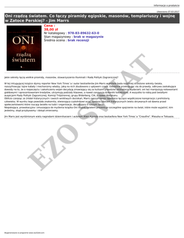 Informacje o produkcie Utworzono 07-03-2017 Oni rządzą światem. Co łączy piramidy egipskie, masonów, templariuszy i wojnę w Zatoce Perskiej? - Jim Marrs Cena : 38,00 zł IA T Nr katalogowy : 978-83-89632-63-0 Stan magazynowy : brak w magazynie Średnia ocena : brak recenzji Jakie sekrety łączą wielkie piramidy, masonów, stowarzyszenia Illuminati i Radę Polityki Zagranicznej? ŚW W tej intrygującej książce słynny reporter New York Times`a i autor bestsellerów Jim Marrs wnikliwie bada najpilniej strzeżone sekrety świata, rozszyfrowując tajne kabały i mechanizmy władzy, jaką na nich zbudowano z upływem czasu. Odważnie przekopując się do prawdy, odkrywa zaskakujące dowody na to, że o rozpoczęciu i zakończeniu wojen decydują zmawiający się za kulisami prawdziwi animatorzy wydarzeń; oni też manipulują notowaniami giełdowymi i oprocentowaniem kredytów, utrzymują podziały klasowe, a nawet cenzurują dzienniki telewizyjne. A wszystko to robią pod światłymi auspicjami Rady Polityki Zagranicznej, Komisji Trójstronnej, grupy Bilderberg, CIA, a nawet Watykanu. Obficie czerpiąc ze źródeł historycznych i swoich wnikliwych dociekań, Marrs rozszyfrowuje tajemnice łączące współczesne konspiracje z prehistorią człowieka. W wyniku tego powstała znakomita, otwierająca czytelnikowi oczy, synteza zdarzeń historycznych (wielu skrywanych od dawna przed społeczeństwem) które rzucają światło na ludzi i organizacje, decydujące o naszym życiu. Niepokojąca, prowokacyjna i zmuszająca do myślenia książka Oni rządzą światem prezentuje szczególne spojrzenie na świat, które może wyjaśnić, kim jesteśmy, skąd przybywamy i dokąd zmierzamy. EZ O Jim Marrs jest wyróżnionym wielu nagrodami dziennikarzem i autorem Alien Agenda oraz bestsellera New York Times`a "Crossfire". Mieszka w Teksasie. Wygenerowano w programie www.oscGold.com