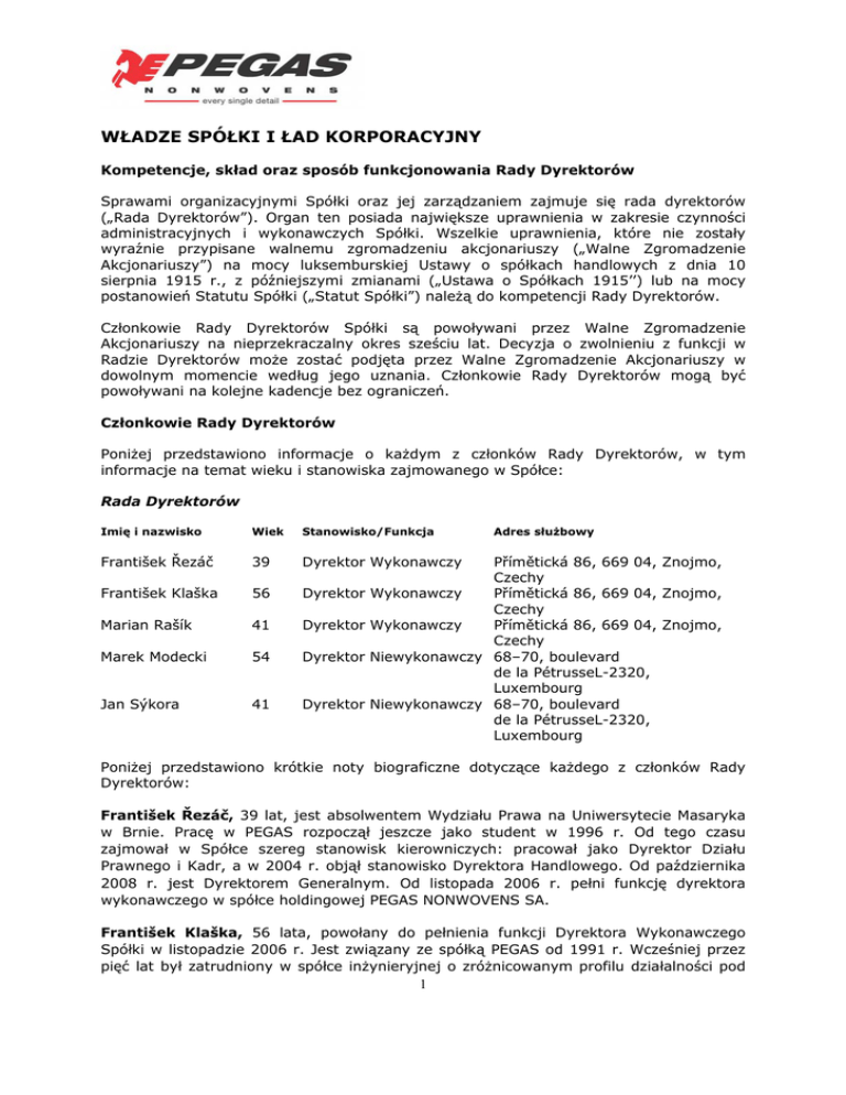 WŁADZE SPÓŁKI I ŁAD KORPORACYJNY Kompetencje, skład oraz sposób funkcjonowania Rady Dyrektorów Sprawami organizacyjnymi Spółki oraz jej zarządzaniem zajmuje się rada dyrektorów („Rada Dyrektorów”). Organ ten posiada największe uprawnienia w zakresie czynności administracyjnych i wykonawczych Spółki. Wszelkie uprawnienia, które nie zostały wyraźnie przypisane walnemu zgromadzeniu akcjonariuszy („Walne Zgromadzenie Akcjonariuszy”) na mocy luksemburskiej Ustawy o spółkach handlowych z dnia 10 sierpnia 1915 r., z późniejszymi zmianami („Ustawa o Spółkach 1915’’) lub na mocy postanowień Statutu Spółki („Statut Spółki”) należą do kompetencji Rady Dyrektorów. Członkowie Rady Dyrektorów Spółki są powoływani przez Walne Zgromadzenie Akcjonariuszy na nieprzekraczalny okres sześciu lat. Decyzja o zwolnieniu z funkcji w Radzie Dyrektorów może zostać podjęta przez Walne Zgromadzenie Akcjonariuszy w dowolnym momencie według jego uznania. Członkowie Rady Dyrektorów mogą być powoływani na kolejne kadencje bez ograniczeń. Członkowie Rady Dyrektorów Poniżej przedstawiono informacje o każdym z członków Rady Dyrektorów, w tym informacje na temat wieku i stanowiska zajmowanego w Spółce: Rada Dyrektorów Imię i nazwisko Wiek Stanowisko/Funkcja František Řezáč 39 Dyrektor Wykonawczy František Klaška 56 Marian Rašík 41 Marek Modecki 54 Jan Sýkora 41 Adres służbowy Přímětická 86, 669 04, Znojmo, Czechy Dyrektor Wykonawczy Přímětická 86, 669 04, Znojmo, Czechy Dyrektor Wykonawczy Přímětická 86, 669 04, Znojmo, Czechy Dyrektor Niewykonawczy 68–70, boulevard de la PétrusseL-2320, Luxembourg Dyrektor Niewykonawczy 68–70, boulevard de la PétrusseL-2320, Luxembourg Poniżej przedstawiono krótkie noty biograficzne dotyczące każdego z członków Rady Dyrektorów: František Řezáč, 39 lat, jest absolwentem Wydziału Prawa na Uniwersytecie Masaryka w Brnie. Pracę w PEGAS rozpoczął jeszcze jako student w 1996 r. Od tego czasu zajmował w Spółce szereg stanowisk kierowniczych: pracował jako Dyrektor Działu Prawnego i Kadr, a w 2004 r. objął stanowisko Dyrektora Handlowego. Od października 2008 r. jest Dyrektorem Generalnym. Od listopada 2006 r. pełni funkcję dyrektora wykonawczego w spółce holdingowej PEGAS NONWOVENS SA. František Klaška, 56 lata, powołany do pełnienia funkcji Dyrektora Wykonawczego Spółki w listopadzie 2006 r. Jest związany ze spółką PEGAS od 1991 r. Wcześniej przez pięć lat był zatrudniony w spółce inżynieryjnej o zróżnicowanym profilu działalności pod 1 nazwą Zbrojovka Brno. Na obecnie zajmowane stanowisko Dyrektora ds. Technicznych i Rozwoju PEGAS NONWOVENS s.r.o. awansował w 2001 r. Jest absolwentem Politechniki Czeskiej. Marian Rašík, 41 lat, powołany na stanowisko Dyrektora Finansowego PEGAS NONWOVENS s.r.o. w grudniu 2009 r. Wcześniej pracował w firmie doradztwa finansowego Corpin Partners, gdzie był odpowiedzialny za transakcje finansowania przedsiębiorstw. W latach 2003–2005 pełnił funkcję Dyrektora Finansowego w spółce Vítkovice Strojírenství a.s. Wcześniej pracował również w praskim oddziale VÚB Bank, ABN AMRO. Karierę zawodową rozpoczynał jako biegły rewident w firmie Coopers & Lybrand. Marian Rašík jest absolwentem wydziału ekonomii Politechniki Ostrawskiej. Marek Modecki, 54 lat, powołany do pełnienia funkcji Dyrektora Niewykonawczego w kwietniu 2008 r. Pan Marek Modecki pełni funkcję Senior Banker oraz członka Rady Nadzorczej Concordia Espirito Santo Investment Ltd. w Polsce, odpowiedzialnego za transakcje połączeń i przejęć oraz bankowość prywatną. Uzyskał stopień magistra prawa na Uniwersytecie Warszawskim. Studiował także prawo międzynarodowe w Instytucie Maxa Plancka w Hamburgu oraz prawo na Uniwersytecie w Hamburgu. Jan Sýkora, 41 lat, powołany na stanowisko Dyrektora Niewykonawczego z dniem 7 maja 2012 r. Obecnie p. Jan Sýkora pełni funkcję Prezesa Rady Dyrektorów Wood & Company - czołowego, niezależnego banku inwestycyjnego z Europy ŚrodkowoWschodniej, z którym jest związany od 1994 r. Zasiada również w organach spółek publicznych i organizacji non-profit (wśród których są Giełda Papierów Wartościowych w Pradze, szkoła International School of Prague, Amrest i stowarzyszenie Young Presidents Organization). Jest absolwentem Rochester Institute of Technology. Poniżej przedstawiono zestawienie stanowisk w organach zarządzających innych podmiotów, zajmowanych przez członków Rady Dyrektorów Spółki w okresie ostatnich pięciu lat. Imię i nazwisko Marek Modecki Zajmowane stanowiska W przeszłości członek organów zarządzających i nadzorczych w spółkach: Concordia Espirito Santo Investment Ltd. (Członek Rady Nadzorczej) Prokom Software S.A. (Członek Rady Nadzorczej) Metalexport S.A. (Członek Rady Nadzorczej) Petrolinvest S.A. (Członek Rady Nadzorczej) Polnord S.A. (Członek Rady Nadzorczej) Obecnie członek organów zarządzających i nadzorczych w spółkach: Concordia Ltd. (Partner Zarządzający) Immobel S.A. (Niewykonawczy członek Zarządu) 21 Concordia Ltd. (Partner Zarządzający od 1 lutego 2011 r.) 2 Empik Media & Fashion S.A. (Członek Rady Dyrektorów od czerwca 2012 r.) Ablon Group Plc (Dyrektor Niewykonawczy od 5 grudnia 2012 r. do 31 stycznia 2013 r.) Jan Sýkora W przeszłości członek organów zarządzających i nadzorczych w spółkach: Obecnie członek organów zarządzających i nadzorczych w spółkach: WOOD & Company* – Przewodniczący Rady Dyrektorów AmRest International School of Prague The Duke of Edinbourghs International Awards Czech Republic Foundation, o.p.s. – Przewodniczący Rady Nadzorczej Giełda Papierów Wartościowych w Pradze SUNCORE ENERGY, a.s. All-Star Holding Limited Window Holding Limited Gruman Holding Limited Casiana, s.r.o. CD ESTATES, s.r.o. Renaissance finance S.A. * Pan. Jan Sýkora zajmuje stanowiska w 