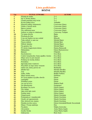 Lista podkładów RÓśNE Lp. 1. 2. 3. 4. 5. 6. 7. 8. 9. 10. 11. 12. 13. 14. 15. 16. 17. 18. 19. 20. 21. 22. 23. 24. 25. 26. 27. 28. 29. 30. 31. 32. 33. 34. 35. 36. 37. 38. 39. 40. 41. 42. 43. 44. 45. 46. 47. 48. 49. 50. TYTUŁ UTWORU Windą do nieba Iść w stronę słońca Chodź pomaluj mój świat Kwiat jednej nocy Historia jednej znajomości Niebo z moich stron Barwy jesieni Nie zadzieraj nosa Jedyne co mam to złudzenia Ta sama chwila Piechotą do lata Czas nie będzie na nas czekał Taka miłość w sam raz Nasza miłość Miłość idealna Na granicy łez W moim magicznym domu Skłamałam Batumi śyj kolorowo I znów księŜniczka Anna spadła z konia Moje serce to jest muzyk Podaruj mi trochę słońca Pomidory Sprzedaj mnie wiatrowi Wyszłam za mąŜ zaraz wracam Gdzie ten, który powie mi Miałeś być Ten Jolka, Jolka Moje miasto nocą W Ŝyciu piękne są tylko chwile Autsajder Wehikuł czasu Au sza la la la Na falochronie Kocham Cię Ŝycie Nie Ŝałuję Jaka róŜa taki cierń Szukaj mnie Niepewność Pomarańcze i mandarynki Ocalić od zapomnienia Dni, których nie znamy Dumka na dwa serca Moja i Twoja nadzieja Na plaŜy Ale jestem Joszko broda Zakręcona AUTOR 2+1 2+1 2+1 Alibabki Czerwone Gitary Czerwone Gitary Czerwone Gitary Czerwone Gitary Czerwony Tulipan Bajm Bajm Blucafe Michał Bajor Michał Bjor Michał Bajor Michał Bajor Hanna Banaszak Edyta Bartosiewicz Filipinki Ewa Bem Ewa Bem Ewa Bem Ewa Bem Ewa Bem Ewa Bem Ewa Bem Brathanki Monika Brodka Monika Brodka Budka Suflera DeMono DŜem DŜem DŜem Shakin Dudi Emigranci Edyta Gepert Edyta Gepert Edyta Gepert Edyta Gepert Marek Grechuta Marek Grechuta Marek Grechuta Marek Grechuta Edyta Górniak&Mietek Szcześniak Hey Majka JeŜowska Anna Maria Jopek Anna Maria Jopek Reni Jusis 51. 52. 53. 54. 55. 56. 57. 58. 59. 60. 61. 62. 63. 64. 65. 66. 67. 68. 69. 70. 71. 72. 73. 74. 75. 76. 77. 78. 79. 80. 81. 82. 83. 84. 85. 86. 87. 88. 89. 90. 91. 92. 93. 94. 95. 96. 97. 98. 99. 100. 101. 102. 103. Zabiorę Cię Co moŜe przynieść nowy dzień Jak rzecz Wyrzuć ten gniew Pieprz i sól Fleciki Supermenka Baw mnie Słodkiego, miłego Ŝycia Bo tutaj jest jak jest Tyle słońca w całym mieście Zakochani Światło Dłoń Wszystko się moŜe zdarzyć Zawsze tam, gdzie Ty Zostawcie Titanica PrzeŜyj to sam Szklana pogoda Czas nas uczy pogody Oczy szeroko zamknięte Gdybyś był Bez Ciebie umieram Cykady na cykladach Długość dźwięku samotności Dla Ciebie Jej portret Kiedy powiem sobie dość Teraz juŜ wiem Nie mogę Ci wiele dać Nie płacz Ewka Niech moje serce kołysze Ciebie do snu Jesteś lekiem na całe zło W Ŝółtych płomieniach liści Przyjaciel potrzebny od zaraz Małgośka Niech Ŝyje bal Rozmowa przez ocean Remedium Natalii Dziewczyny lubią brąz Nie budźcie marzeń gdy śpią Walc Ambara Ktoś mnie pokochał Prześliczna wiolonczelistka Autostop Cichosza Między ciszą a ciszą Dmuchawce, latawce, wiatr Idę na plaŜę Oczarowanie Z Tobą chcę oglądać świat Bądź moim natchnieniem Kancelaria Kasia Kowalska Kasia Kowalska Kasia Kowalska Kasia Kowalska Kayah Kayah Seweryn Krajewski Kombi Paweł Kukiz Natalia Kukulska Natalia Kukulska Natalia Kukulska Natalia Kukulska Anita Lipnicka Lady Pank Lady Pank Lombard Lombard GraŜyna Łobaszewska Łzy Łzy Maanam Maanam Myslovitz Myslovitz Bogusław Mec O.N.A. O.N.A. Perfect Perfect Krystyna Prońko Krystyna Prońko Łucja Prus&Skaldowie Kaja Paschalska Maryla Rodowicz Maryla Rodowicz Maryla Rodowicz Maryla Rodowicz Ryszard Rynkowski Ryszard Rynkowski Ryszard Rynkowski Irena Santor Skaldowie Skaldowie Karin Stanek Grzegorz Turanu Grzegorz Turnau Urszula Video Zbigniew Wodecki Zbigniew Wodecki Andrzej Zaucha