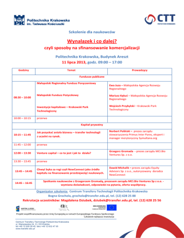 Szkolenie dla naukowców Wynalazek i co dalej? czyli sposoby na sfinansowanie komercjalizacji Politechnika Krakowska, Budynek Areszt 11 lipca 2013, godz. 09:00 – 17:00 Godziny Temat Prowadzący Fundusze publiczne Małopolski Regionalny Fundusz Poręczeniowy 08:30 – 10:00 10:00 – 10:15 Ewa Juza – Małopolska Agencja Rozwoju Regionalnego Małopolski Fundusz Pożyczkowy Mariusz Kękuś – Małopolska Agencja Rozwoju Regionalnego Inwestycje kapitałowe – Krakowski Park Technologiczny Wojciech Przybylski – Krakowski Park Technologiczny przerwa Kapitał prywatny 10:15 – 11:45 Jak pozyskać anioła biznesu – transfer technologii z uczelni na rynek. 11:45 – 12:00 przerwa 12:00 – 13:30 Venture capital – co to jest i jak to działa? 13:30 – 13:45 przerwa 13:45 – 14:45 14:45 – 16:45 Chwyć byka za rogi czyli NewConnect jako źródło kapitału na finansowanie przedsięwzięć naukowych. Norbert Poliński – prezes zarządu stowarzyszenia Primus Inter Pares, ekspert i manager merytoryczny Symultana.org Grzegorz Gromada - prezes zarządu MCI.Bio Ventures Sp. z o.o. Dawid Michalik – prezes zarządu Equity Advisors Sp. z o.o., autoryzowany doradca NewConnect Spotkanie naukowców z Grzegorzem Gromadą, prezesem zarządu MCI.Bio Ventures Sp z o.o. wymiana doświadczeń, odpowiedzi na pytania, oferta współpracy. Organizator szkolenia: Centrum Transferu Technologii Politechnika Krakowska Bogna Grochola, [email protected], tel. (12) 628 25 88 Rekrutacja uczestników: Magdalena Dziubek, [email protected], tel. (12) 628 25 56 Projekt współfinansowany przez Unię Europejską w ramach Europejskiego Funduszu Społecznego Człowiek-najlepsza inwestycja Centrum Transferu Technologii Politechnika Krakowska ul. Warszawska 24, 31-155 Kraków tel.+48 12 628 28 45, faks +48 12 632 47 95 www.transfer.edu.pl