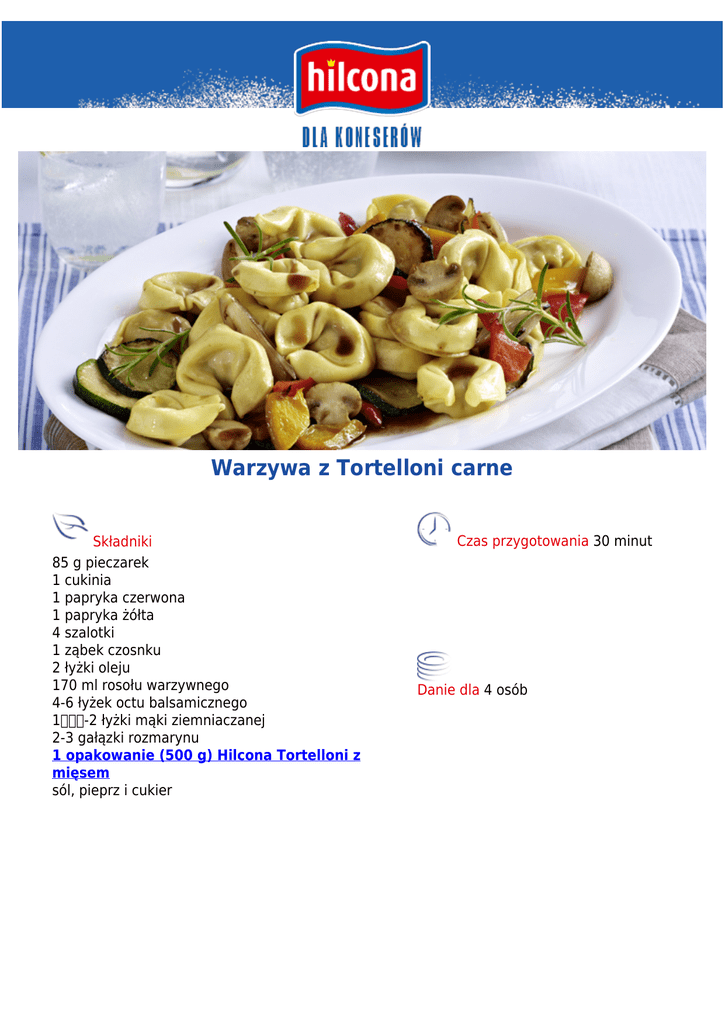 Warzywa z Tortelloni carne Składniki 85 g pieczarek 1 cukinia 1 papryka czerwona 1 papryka żółta 4 szalotki 1 ząbek czosnku 2 łyżki oleju 170 ml rosołu warzywnego 4-6 łyżek octu balsamicznego 1-2 łyżki mąki ziemniaczanej 2-3 gałązki rozmarynu 1 opakowanie (500 g) Hilcona Tortelloni z mięsem sól, pieprz i cukier Czas przygotowania 30 minut Danie dla 4 osób Przygotowanie Oczyść pieczarki i przekrój na pół. Umytą cukinię przekrój wzdłuż i pokrój w plastry. Papryki umyj i pokrój w kostkę. Następnie obierz szalotki i pokrój w ćwiartki. Obierz czosnek i drobno posiekaj. Rozgrzej olej na patelni i smaż na niej warzywa, zaczynając od czosnku i szalotki, przez ok. 5 minut. Całość dopraw solą i pieprzem. Umyj rozmaryn i potnij część igieł na drobne kawałki. Jedną gałązkę zostaw do dekoracji. Wymieszaj wywar z octem balsamicznym, mąką ziemniaczaną i rozmarynem. Warzywa zalej i doprowadź do wrzenia, a następnie gotuj przez ok. 1 minutę na wolnym ogniu. Tortelloni wrzuć do gotującej się, osolonej wody, i ugotuj zgodnie z instrukcją na opakowaniu. Po ugotowaniu odcedź i dodaj do warzyw. Całość wymieszaj, dopraw do smaku solą, pieprzem, cukrem i octem balsamicznym. Na koniec przełóż tortelloni z warzywami na talerze i udekoruj rozmarynem