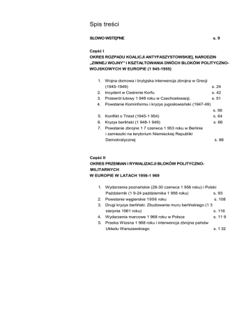Spis treści SŁOWO WSTĘPNE s. 9 Część I OKRES ROZPADU KOALICJI ANTYFASZYSTOWSKIE], NARODZIN „ZIMNEJ WOJNY" I KSZTAŁTOWANIA DWÓCH BLOKÓW POLITYCZNOWOJSKOWYCH W EUROPIE (1 945-1955) 1. Wojna domowa i brytyjska interwencja zbrojna w Grecji (1945-1949) s. 24 2. Incydent w Cieśninie Korfu s. 42 3. Przewrót lutowy 1 948 roku w Czechosłowacji. s. 51 4. Powstanie Kominformu i kryzys jugosłowiański (1947-49) s. 56 5. Konflikt o Triest (1945-1 954) s. 64 6. Kryzys berliński (1 948-1 949) s. 66 7. Powstanie zbrojne 1 7 czerwca 1 953 roku w Berlinie i zamieszki na terytorium Niemieckiej Republiki Demokratycznej s. 88 Część II OKRES PRZEMIAN I RYWALIZACJI BLOKÓW POLITYCZNOMILITARNYCH W EUROPIE W LATACH 1956-1 969 1. Wydarzenia poznańskie (28-30 czerwca 1 956 roku) i Polski Październik (1 9-24 października 1 956 roku) 2. Powstanie węgierskie 1956 roku s. 93 s. 108 3. Drugi kryzys berliński. Zbudowanie muru berlińskiego (1 3 sierpnia 1961 roku) 4. Wydarzenia marcowe 1 968 roku w Polsce s. 116 s. 11 9 5. Praska Wiosna 1 968 roku i interwencja zbrojna państw Układu Warszawskiego s. 1 32 Część III OKRES POSTĘPÓW POKOJOWEGO WSPÓŁISTNIENIA I PRZEJŚCIOWYCH NAWROTÓW „ZIMNEJ WOJNY" (1 970-1990) 1. Wydarzenia na Wybrzeżu w grudniu 1 970 roku. Upadek Władysława Gomułki s. 144 2. Terrorystyczne działania zbrojne w krajach Europy Zachodniej: a. Irlandzka Armia Republikańska - IRA s. 155 b. Baskijski Kraj i Wolność - ETA s. 1 58 c. s. 1 61 Frakcja Czerwonej Armii - RAF d. Czerwone Brygady e. Działalność ekstremistów korsykańskich s. 163 s. 165 3. Wydarzenia 1976 roku w Radomiu i Ursusie. Powstanie zorganizowanej opozycji w PRL s. 1 67 4. Konflikt cypryjski. Grecko-tureckie spory graniczne s. 1 72 5. Rewolucja „Czerwonych Goździków" w Portugalii s. 1 75 6. Wydarzenia 1 980-1 981 roku w Polsce. Stan wojenny w Polsce 7. Spór Polski i NRD w Zatoce Pomorskiej 8. s. 1 79 s. 1 92 Okrągły Stół - polski model transformacji ustrojowej s. 195 9. Jesień narodów" w 1 989 roku w krajach Europy Wschodniej i Środkowej a. Węgry - Trójkątny Stół s. 206 s. 209 b. Czecho-Słowacja - Aksamitna Rewolucja s. 211 c. s. 213 Powstanie grudniowe 1989 roku w Rumunii d. Bułgaria - upadek dyktatury Todora Żiwkowa e. Albania - początek reform f. Przemiany w NRD. Upadek muru berlińskiego i zjednoczenie Niemiec s. 21 6 s. 218 s. 219 Część IV OKRES ROZPADU BLOKÓW I PRZEMIAN SPOŁECZNO-POLITYCZNYCH W EUROPIE W LATACH 1 991 -2007 1. Rozpad Jugosławii. Wojna domowa i interwencja zbrojna NATO s. 228 2. Czeczenia - walka o niepodległość i wojna domowa s. 242 Zakończenie s. 249 Indeks nazwisk s. 253 Bibliografia s. 264