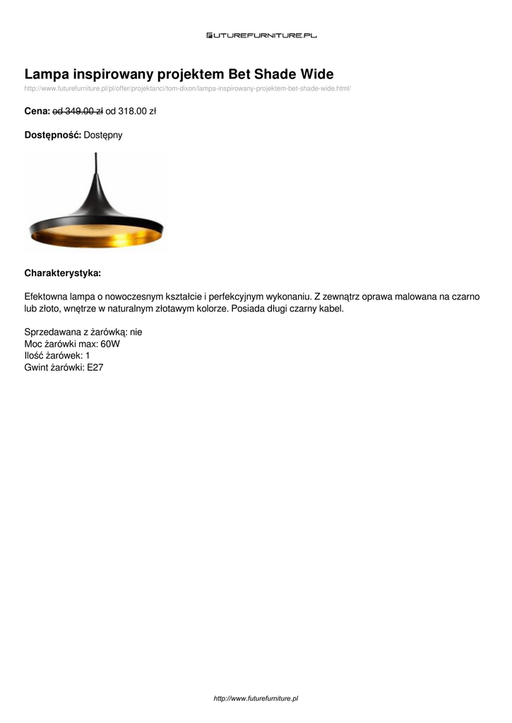 Lampa inspirowany projektem Bet Shade Wide http://www.futurefurniture.pl/pl/offer/projektanci/tom-dixon/lampa-inspirowany-projektem-bet-shade-wide.html/ Cena: od 349.00 zł od 318.00 zł Dostępność: Dostępny Charakterystyka: Efektowna lampa o nowoczesnym kształcie i perfekcyjnym wykonaniu. Z zewnątrz oprawa malowana na czarno lub złoto, wnętrze w naturalnym złotawym kolorze. Posiada długi czarny kabel. Sprzedawana z żarówką: nie Moc żarówki max: 60W Ilość żarówek: 1 Gwint żarówki: E27 http://www.futurefurniture.pl Dostępne wersje produktu: nazwa produktu Lampa inspirowany projektem Bet Shade Wide Lampa inspirowany projektem Bet Shade Wide Lampa inspirowany projektem Bet Shade Wide warianty cena model I, śr. 36 cm w. 349.00zł 318.00zł 18 cm, kolor czarny dostępne Dostępny model I, śr. 36 cm w. 349.00zł 318.00zł 18 cm, kolor biały Dostępny model II, śr. 35 cm w. 349.00zł 339.00zł 18 cm, kolor biały Dostępny http://www.futurefurniture.pl Zdjęcia produktu: http://www.futurefurniture.pl http://www.futurefurniture.pl Powered by TCPDF (www.tcpdf.org)