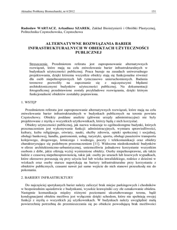 Aktualne Problemy Biomechaniki, nr 6/2012 151 Radosław WARTACZ, Arkadiusz SZAREK, Zakład Bioinżynierii i Obróbki Plastycznej, Politechnika Częstochowska, Częstochowa ALTERNATYWNE ROZWIĄZANIA BARIER INFRASTRUKTURALNYCH W OBIEKTACH UŻYTECZNOŚCI PUBLICZNEJ Streszczenie. Przedmiotem referatu jest zaproponowanie alternatywnych rozwiązań, które mają na celu zniwelowanie barier infrastrukturalnych w budynkach użyteczności publicznej. Praca bazuje na zasadach uniwersalnego projektowania, dzięki któremu wszystkie obiekty stają się funkcjonalne również dla osób niepełnosprawnych lub tymczasowo unieruchomionych. Badania terenowe pozwoliły na zapoznanie się z najczęstszymi błędami architektonicznymi budynków użyteczności publicznej. Na dokumentacji fotograficznej przedstawione zostały przykładowe rozwiązania, dzięki którym funkcjonalność obiektów zostałaby poprawiona. 1. WSTĘP Przedmiotem referatu jest zaproponowanie alternatywnych rozwiązań, które mają na celu zniwelowanie barier infrastrukturalnych w budynkach publicznych na terenie powiatu Częstochowy. Obiekty poddane analizie (głównie urzędy administracyjne) nie były projektowane z myślą o wszystkich użytkownikach, którzy będą z nich korzystać. Obiekty użyteczności publicznej, jak nazwa wskazuje to ogólnodostępne budynki, których przeznaczeniem jest wykonywanie funkcji: administracyjnych, wymiaru sprawiedliwości, kultury, kultu religijnego, oświaty, nauki, służby zdrowia, opieki społecznej i socjalnej, obsługi bankowej, handlu, gastronomii, usług, turystyki, sportu, obsługi pasażerów transportu kolejowego, drogowego, lotniczego i wodnego, poczty i telekomunikacji oraz obiekty charakteryzujące się podobnym przeznaczeniem [11]. Widoczna niedoskonałość budynków w sferze architektoniczno-urbanistycznej, uniemożliwia jednakowe korzystanie wszystkim osobom z dóbr, jakie oferują wyżej wymienione obiekty. Osoby niepełnosprawne, ale także ludzie z czasową niepełnosprawnością, takie jak: osoby po urazach lub losowych wypadkach, które okresowo poruszają się przy użyciu kul lub wózka inwalidzkiego, rodzice z dziećmi w wózkach oraz osoby starsze napotykają na bariery infrastrukturalne przy korzystaniu z obiektów publicznych, czasami nawet już samo wejście do nich stanowi przeszkodę nie do pokonania. 2. BARIERY INFRASTRUKTURY Do najczęściej spotykanych barier należy zaliczyć brak miejsc parkingowych i chodników w bezpośrednim sąsiedztwie z budynkami, wysokie krawężniki czy złe oznakowanie obiektu. Następnie komunikacja między różnymi poziomami ukształtowanego terenu, bądź kondygnacjami obiektu możliwa jest wyłącznie dzięki schodom, które nie spełniają swojej funkcji z myślą o wszystkich jej użytkownikach. W budynkach należy uwzględnić małą powierzchnię potrzebną do przemieszczania się po obiekcie powodującą brak możliwości 152 R. Wartacz, A. Szarek manewru, a także wąską oścież oraz wystające progi w drzwiach powodujące kłopoty w wejściu do pomieszczeń. Do najgorszych przypadków zaliczyć można: całkowitą niedostępność, brak wind uniemożliwiający komunikację pionową, niedostosowane WC dla potrzeb osób niepełnosprawnych oraz brak oznakowania i informacji [7]. Problem ten zawsze istniał, lecz dopiero w drugiej połowie XX wieku zauważono, z jakimi barierami w codziennej egzystencji borykają się osoby z dysfunkcjami i do czego one prowadzą. Dane GUS z 2004 roku podają, że w Polsce żyje 6,2 miliona osób niepełnosprawnych, co stanowi aż 14% ludności kraju. Oznacza to, że problem niepełnosprawności dotyczy wcale nie małej grupy społeczeństwa, gdy doda się jeszcze do tego osoby o czasowych dysfunkcjach okaże się, że jest to naprawdę duży odsetek społeczeństwa [7]. Oczywiście, funkcjonowały już wcześniej zapisy normujące sytuację osób niepełnosprawnych zawarte chociażby w konstytucji RP oraz aktach prawnych [13]. Chronią one osoby niepełnosprawne przed wynaturzeniem społecznym. Mianowicie każdy obywatel ma prawo do korzystania z dóbr i usług umożliwiających pełne uczestnictwo w życiu społecznym. Dlatego też nie sposób nie wspomnieć o projektowaniu uniwersalnym, które pod względem architektoniczno-urbanistycznym pomaga pod względem fizycznym usprawniać udział osób niepełnosprawnych w żuciu publicznym. 3.PROJEKTOWANIE UNIWERSALNE Pojęcie uniwersalnego projektowania miało ścisły związek z zabieganiem osób niepełnosprawnych o uwzględnienie ich potrzeb w planowaniu życia społecznego. Pierwotnie zjawisko to zaczęło się rozpowszechniać na terenie Stanów Zjednoczonych i tam w 1963 roku pojawiła się książka Selwyna Goldsmitha pod tytułem Designing for the disabled: The new paradigm. Michale Bednar, amerykański architekt, jako pierwszy podkreślił, że usunięcie przeszkód natury środowiskowej w dużym stopniu zwiększa kompetencje funkcjonalne każdego użytkownika, co więcej zasugerował konieczność przeformułowania pojęcia dostępności w kierunku większej uniwersalności dostępu [8]. Innymi słowy projektowanie uniwersalne, nazywane jest projektowaniem dla wszystkich (design for all), albo projektowaniem w cyklu życia (lifespan design). Dopiero w 1997 roku opracowano siedem najważniejszych reguł projektowania dla wszystkich. Należą do nich: równe szanse dla wszystkich (equitable use); elastyczność w użyciu (flexibility in use); prostota i intuicyjność w użyciu (simple, intuitive use); postrzegalność informacji (perceptible information); tolerancja błędu (tolerance for error); niewielki wysiłek fizyczny podczas użycia (low physical effort); rozmiar i przestrzeń wystarczające do użycia (size and space for approach and use) [8]. Wraz z wprowadzaniem w użycie metod projektowania uniwersalnego oraz zgodnie z wymogami obowiązującego prawa można zauważyć pewne zmiany w budowaniu nowych obiektów oraz przebud
