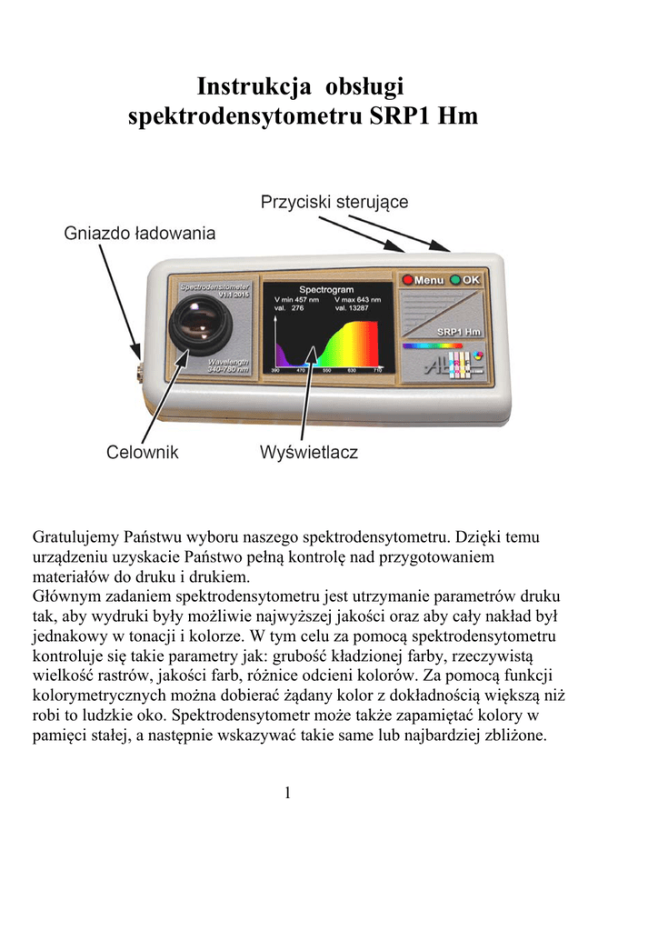 Instrukcja obsługi spektrodensytometru SRP1 Hm Gratulujemy Państwu wyboru naszego spektrodensytometru. Dzięki temu urządzeniu uzyskacie Państwo pełną kontrolę nad przygotowaniem materiałów do druku i drukiem. Głównym zadaniem spektrodensytometru jest utrzymanie parametrów druku tak, aby wydruki były możliwie najwyższej jakości oraz aby cały nakład był jednakowy w tonacji i kolorze. W tym celu za pomocą spektrodensytometru kontroluje się takie parametry jak: grubość kładzionej farby, rzeczywistą wielkość rastrów, jakości farb, różnice odcieni kolorów. Za pomocą funkcji kolorymetrycznych można dobierać żądany kolor z dokładnością większą niż robi to ludzkie oko. Spektrodensytometr może także zapamiętać kolory w pamięci stałej, a następnie wskazywać takie same lub najbardziej zbliżone. 1 Ekran główny densytometru: Ekran główny densytometru składa się z pola informacji o wybranym lub wykrytym w trybie automatycznym kolorze, pola informacji trybu (tryb automatycznego rozpoznawania koloru lub tryb ręcznego wyboru koloru), pola wybranych jednostek (density D lub procent %), pola głównej zmierzonej wartości, oraz pól wartosci pozostałych kolorów. Dodatkowe informacje to rodzaj wybranych filtrów, czy pomiar jest absolutny, czy względem odcienia papieru, stan baterii. W innych funkcjach pomiarów jak trapping, kontrast itd. wygląd ekranu jest odpowiednio dostosowany. Włączanie urządzenia. Aby włączyć densytometr, należy nacisnąć przycisk OK. Wyłączanie densytometru odbywa się automatycznie – jeżeli nie jest używany (nie naciskany żaden przycisk), następuje po ustawionym czasie. 2 Wybór rodzaju jednostek (% lub D): Naciskając klawisz 'MENU' należy przejść do funkcji - Jednostki -. Następnie wybrać ją krótkim naciśnięciem klawisza „Ok”, dalej klawiszem 'MENU' wybrać odpowiednią jednostkę ( % Procent lub D Density) i zatwierdzić klawiszem „Ok”. Od tego momentu densytometr będzie mierzył w wybranych jednostkach. Celownik: Celownik typu lupka jest bardzo wygodny. W porównaniu z celownikami ‘klapkowymi’ ma tą zaletę, że nie posiada elementów zużywających się. Celownik posiada zespół soczewek, dających powiększenie obrazu ok. 1,5x. Dzięki takiej konstrukcji celownika, nawet kostki wielkości otworu pomiarowego nie sprawiają kłopotu, pokrycie jest widoczne bardzo dobrze (dla prawidłowego pomiaru cały otwór pomiarowy musi być na mierzonej kostce). Nawet bardzo niewielka część białego papieru wchodzącego na otwór pomiarowy daje duże błędy pomiaru, co często się zdarza przy celownikach ‘klapkowych’ i innych. Aby można było korzystać z tego typu celownika, podczas trzymania naciśniętego klawisza „OK”, włączone jest światło podświetlające. Trzymając ten klawisz wciśnięty można łatwo i precyzyjnie naprowadzić otwór pomiarowy na mierzoną kostkę. Procedura kalibracji w trybie (%): Przed pierwszym pomiarem rastrów, densytometr należy skalibrować na aktualnie drukowanych arkuszach. Kalibracja trybu pomiaru rastrów zależy od rodzaju użytych farb, papieru, rodzaju maszyny, dlatego nie jest przeprowadzana fabrycznie i trzeba ją wykonać samemu. Kalibrację należy także przeprowadzić na aktualnych, własnych wydrukach, po zmianie używanych farb, maszyny, rodzaju papieru lub gęstości optycznych (grubości) farb. 3 Densytometr powinien mieć włączony tryb (%). Jeżeli jest w trybie jednostek D, należy przełączyć jednostki na %. Najpierw należy densytometr wyzerować na biel papieru. Następnie lewym przyciskiem 'MENU' wybrać opcję „Kalibracja” , nacisnąć i przytrzymać przycisk „OK” ( powyżej 3 sekund ) do momentu aż na wyświetlaczu pojawi się pole <Cyan> , wtedy należy głowicę pomiarową umieścić na kostce 100% CYAN wydrukowanego arkusza i przycisnąć przycisk „OK” przez ok. 3 sek., aż wyświetlacz 'mrugnie' dwa razy, co oznacza poprawną kalibrację. Puścić przycisk „OK”. Urządzenie automatycznie przejdzie do procedury kalibracji następnego koloru <Magenta> - ponownie głowicę pomiarową umieścić na kostce 100% MAGENTA, przycisnąć i przytrzymać przycisk „OK” do mrugnięcia ekranu. Urządzenie automatycznie przejdzie do procedury kalibracji koloru <Yellow> - ponownie głowicę pomiarową umieścić na kostce 100% YELLOW i przycisnąć przycisk „OK” jak poprzednio, urządzenie przejdzie do kalibracji koloru black - <Black> - po kalibracji black urządzenie przełączy się w tryb AUTO. Jeżeli należy skalibrować tylko jeden kolor a inne pozostawić bez zmian, to kolory które nie mają być zmieniane można w trakcie kalibracji pominąć klawiszem 'MENU'. Uwaga: aby uniknąć zafałszowania pomiarów, należy unikać sytuacji w których silne zewnętrzne światło trafia do celownika (np. lampa bezpośrednio nad celownikiem), lub celownik optyczny densytometru zasłonić dłonią, jednocześnie dociskając przyrząd do podłoża. 4 Od tej chwili urządzenie jest zaprogramowane i gotowe do pracy. Po właściwym zaprogramowaniu nie ma już potrzeby ponownej kalibracji jedynie należy „zerować” densytometr na biel papieru. Procedura pomiaru gęstości optycznych i rastrów w trybie AUTO: 1. „zerowanie„ papieru Densytometr położyć na czystym nie zadrukowanym papierze i wcisnąć przycisk „OK” (jak do pomiaru w trybie AUTO lub któregoś koloru), trzymając go wciśnięty wcisnąć także na chwilę „'MENU'. Pojawi się napis „Papier”. Teraz można puścić kl. 'MENU'. Trzymając nadal kl. „OK” cały czas dokonuje się pomiar bieli. Po jego puszczeniu następuje zapamiętanie wartości bieli papieru. Od tego momentu densytometr uwzględnia w pomiarze odcień bieli drukowanego papieru, jeżeli jest włączony tryb -Paper. W trybie Absolute densytometr nie uwzględnia odcienia papieru i pomiar następuje względem bieli absolutnej. Zerowanie papieru można takż