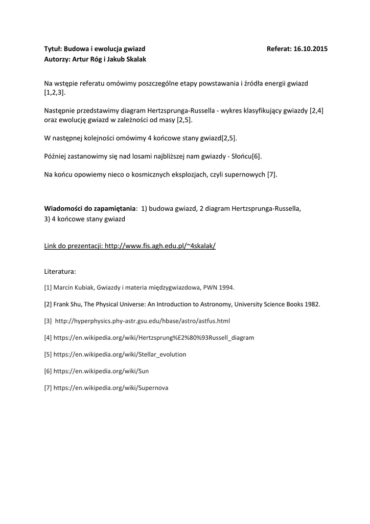 Tytuł: Budowa i ewolucja gwiazd Referat: 16.10.2015 Autorzy