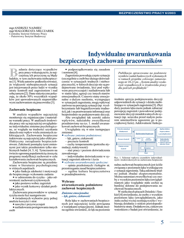 BEZPIECZEÑSTWO PRACY 6/2003 mgr ANDRZEJ NAJMIEC mgr MA£GORZATA MILCZAREK Centralny Instytut Ochrony Pracy – Pañstwowy Instytut Badawczy Indywidualne uwarunkowania bezpiecznych zachowañ pracowników adania dotycz¹ce wypadków przy pracy wskazuj¹ na to, ¿e najczêstsz¹ ich przyczyn¹ s¹ b³êdy ludzkie, w tym zachowania niebezpieczne [1]. Wielu autorów podkreœla równie¿, ¿e wiêkszoœæ niebezpiecznych sytuacji jest inicjowanych przez ludzi w wyniku utraty kontroli nad zagro¿eniem i nad sob¹ samym [2]. Dane statystyczne pokazuj¹, ¿e oko³o 50% wszystkich wypadków jest spowodowanych nieprawid³owym zachowaniem siê pracownika [3]. Zachowania bezpieczne W analizie wypadków najczêœciej monitoruje siê organizacyjne i materialne warunki pracy. W analizach œrodowiska pracy nie s¹ najczêœciej uwzglêdniane indywidualne zmienne psychologiczne, ze wzglêdu na trudnoœci uzyskania danych oraz wp³yw wielu zmiennych zak³ócaj¹cych. Zachowania bezpieczne traktowane s¹ najczêœciej jako efekt profilaktyczny zarz¹dzania bezpieczeñstwem. Zale¿noœæ pomiêdzy tymi zmiennymi jest tak¿e przedmiotem tylko nielicznych badañ [4, 5, 6]. Tymczasem na œwiecie ogromn¹ popularnoœci¹ ciesz¹ siê programy modyfikacji zachowañ w celu kszta³towania zachowañ bezpiecznych. Zachowania bezpieczne s¹ przedstawiane w literaturze psychologicznej w ró¿nych aspektach: • jako funkcja zdolnoœci i motywacji do bezpiecznego wykonania zadania • w odniesieniu do ryzyka – jako odwrotnoœæ zachowañ ryzykownych • jako postawa wobec zagro¿eñ • jako wynik koñcowy dzia³añ profilaktycznych. Zachowanie pracowników w sytuacji ryzyka mo¿e byæ nastêpstwem: • œwiadomych wyborów przy pe³nej analizie korzyœci i strat • nawyku i przyzwyczajeñ • naœladowania postêpowania innych osób • podporz¹dkowania siê zasadom i normom [4]. Zagro¿enia powoduj¹ czêsto sytuacje (szczególnie u osób bez du¿ego doœwiadczenia w sytuacjach trudnych i niebezpiecznych), w których decyzje nie s¹ podejmowane œwiadomie, lecz pod wp³ywem przyzwyczajeñ i naœladowania lub w stanie lêku, agresji czy innych stanów emocjonalnych. Czasowe stany emocjonalne o du¿ym nasileniu, wystêpuj¹ce w sytuacjach zagro¿enia, mog¹ wp³ywaæ zarówno na percepcjê sytuacji (np. wyolbrzymianie lub bagatelizowanie trudnoœci), jak i na przetwarzanie informacji oraz bezpoœrednio na podejmowanie decyzji. Aby uwzglêdniæ tak szeroki zakres wp³ywów, nale¿a³oby zweryfikowaæ przedstawiony na rys. 1. model uwarunkowañ zachowañ bezpiecznych. Uwzglêdnia siê w nim nastêpuj¹ce zmienne: wybrane zmienne podmiotowe: – lêk, gniew, ciekawoœæ – poczucie kontroli – cechy temperamentu (potrzeba stymulacji, reaktywnoœæ) – sta¿ pracy i poziom doœwiadczenia zawodowego – indywidualne doœwiadczenie w sytuacji zagro¿eñ zdrowia i ¿ycia wybrane uwarunkowania spo³eczne: – opinia prze³o¿onych i kolegów nt. przestrzegania zasad bezpieczeñstwa – ogólna kultura bezpieczeñstwa w przedsiêbiorstwie. Publikacja opracowana na podstawie wyników zadañ badawczych wykonanych w ramach projektu celowego zamawianego nr 16-21 pn. „System analizy wydarzeñ wypadkowych w œrodowisku pracy dla potrzeb profilaktyki” œrednim sprzyja podejmowaniu decyzji odpowiednich do sytuacji i dzia³a mobilizuj¹co w sytuacjach zagro¿enia [5]. Zbyt du¿y poziom lêku mo¿e jednak zaburzaæ percepcjê zagro¿eñ i powodowaæ podejmowanie decyzji nieadekwatnych do sytuacji (np. ucieczka przed ma³ym po¿arem uniemo¿liwia ugaszenie go w pocz¹tkowej fazie). Adekwatnoœæ funkcjo- • • Wybrane uwarunkowania podmiotowe zachowañ bezpiecznych Zmienne emocjonalne – lêk, gniew, ciekawoœæ Rola lêku w zachowaniach bezpiecznych jest najczêœciej œciœle powi¹zana z warunkami sytuacyjnymi. Jednak mo¿na ogólnie stwierdziæ, ¿e lêk na poziomie Rys. 1. Schemat wp³ywu czynników indywidualnych i œrodowiskowych na zachowania bezpieczne nalna zachowañ bezpiecznych jest œciœle zwi¹zana z poziomem lêku wynikaj¹cym z sytuacji zagro¿enia. Tak¹ zale¿noœæ trudno jednak zbadaæ eksperymentalnie. Mo¿na natomiast zweryfikowaæ czy osoby z wysokim poziomem lêku (uwzglêdnianym jako wzglêdnie sta³a cecha) s¹ bardziej sk³onne do podejmowania zachowañ bezpiecznych. W nielicznych pracach Dziedzic i Szukiel [4] stwierdzono, ¿e osoby z wysokim poziomem lêku (uwzglêdnianym, jako sta³a cecha) wy¿ej oceniaj¹ ryzyko i wybieraj¹ dzia³ania o niskim prawdopodobieñstwie straty. Dodatkowym, ciekawym wnioskiem z badañ jest stwierdzenie, ¿e 5 BEZPIECZEÑSTWO PRACY 6/2003 preferencja akceptowanego ryzyka u czêœci osób by³a uzale¿niona od sytuacji (70% badanych), a u pozosta³ej czêœci od zmiennych osobowoœciowych (30% badanych). Inn¹ zale¿noœæ pomiêdzy lêkiem, doœwiadczeniem zawodowym a wypadkowoœci¹ w górnictwie stwierdzi³ Studenski [5]. Zmiany w zakresie lêku, w zale¿noœci od sta¿u pracy w kopalniach, przebiega³y ró¿nie w zale¿noœci od stopnia wypadkowoœci. Wyniki pokaza³y, ¿e lêk spada³ wraz ze wzrostem doœwiadczenia w kopalniach o wysokiej wypadkowoœci. W kopalniach o wypadkowoœci niskiej, œredniej i bardzo wysokiej poziom lêku wzrasta³ wraz z doœwiadczeniem. Wyniki pokaza³y, ¿e lêk mo¿e podlegaæ zmianom w zale¿noœci od potencjalnych zagro¿eñ na jakie s¹ nara¿eni pracownicy. Spadek poziomu lêku nastêpuje najczêœciej wraz ze wzrostem doœwiadczenia. Dokonuje siê to zarówno przez systematyczne obni¿anie poziomu zagro¿eñ, jak i przez lepsz¹ samoocenê w³asnych umiejêtnoœci. Zachowania bezpieczne spowodowane zwiêkszonym lêkiem u pracowników mog¹ byæ redukowane wraz ze wzrastaj¹cym sta¿em pracy, jeœli nie prowadz¹ do zwiêkszenia bezpieczeñstwa, tzn. jeœli poziom wypadkowoœci zwiêksza siê lub nie zmienia. Jest to poœredni wniosek z cytowanych badañ, wymagaj¹cy jednak potwierdzenia. Z punktu widzenia tych badañ ciekawe j
