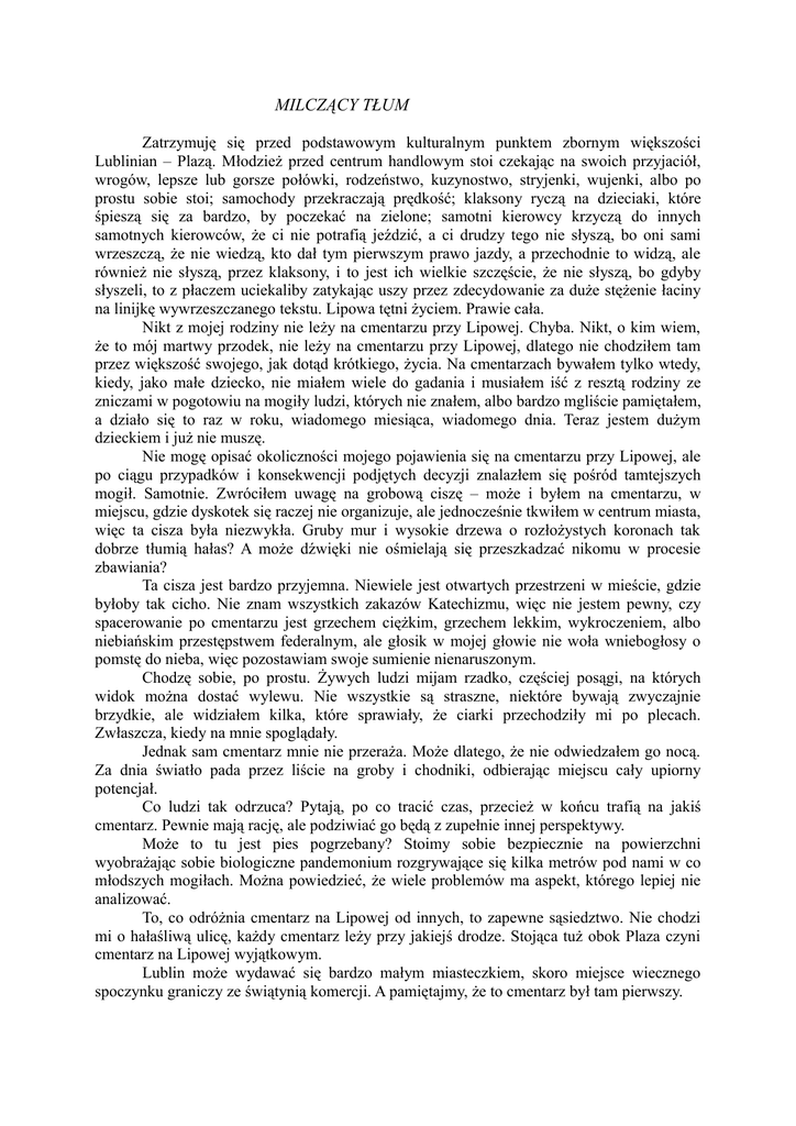 MILCZĄCY TŁUM Zatrzymuję się przed podstawowym kulturalnym punktem zbornym większości Lublinian – Plazą. Młodzież przed centrum handlowym stoi czekając na swoich przyjaciół, wrogów, lepsze lub gorsze połówki, rodzeństwo, kuzynostwo, stryjenki, wujenki, albo po prostu sobie stoi; samochody przekraczają prędkość; klaksony ryczą na dzieciaki, które śpieszą się za bardzo, by poczekać na zielone; samotni kierowcy krzyczą do innych samotnych kierowców, że ci nie potrafią jeździć, a ci drudzy tego nie słyszą, bo oni sami wrzeszczą, że nie wiedzą, kto dał tym pierwszym prawo jazdy, a przechodnie to widzą, ale również nie słyszą, przez klaksony, i to jest ich wielkie szczęście, że nie słyszą, bo gdyby słyszeli, to z płaczem uciekaliby zatykając uszy przez zdecydowanie za duże stężenie łaciny na linijkę wywrzeszczanego tekstu. Lipowa tętni życiem. Prawie cała. Nikt z mojej rodziny nie leży na cmentarzu przy Lipowej. Chyba. Nikt, o kim wiem, że to mój martwy przodek, nie leży na cmentarzu przy Lipowej, dlatego nie chodziłem tam przez większość swojego, jak dotąd krótkiego, życia. Na cmentarzach bywałem tylko wtedy, kiedy, jako małe dziecko, nie miałem wiele do gadania i musiałem iść z resztą rodziny ze zniczami w pogotowiu na mogiły ludzi, których nie znałem, albo bardzo mgliście pamiętałem, a działo się to raz w roku, wiadomego miesiąca, wiadomego dnia. Teraz jestem dużym dzieckiem i już nie muszę. Nie mogę opisać okoliczności mojego pojawienia się na cmentarzu przy Lipowej, ale po ciągu przypadków i konsekwencji podjętych decyzji znalazłem się pośród tamtejszych mogił. Samotnie. Zwróciłem uwagę na grobową ciszę – może i byłem na cmentarzu, w miejscu, gdzie dyskotek się raczej nie organizuje, ale jednocześnie tkwiłem w centrum miasta, więc ta cisza była niezwykła. Gruby mur i wysokie drzewa o rozłożystych koronach tak dobrze tłumią hałas? A może dźwięki nie ośmielają się przeszkadzać nikomu w procesie zbawiania? Ta cisza jest bardzo przyjemna. Niewiele jest otwartych przestrzeni w mieście, gdzie byłoby tak cicho. Nie znam wszystkich zakazów Katechizmu, więc nie jestem pewny, czy spacerowanie po cmentarzu jest grzechem ciężkim, grzechem lekkim, wykroczeniem, albo niebiańskim przestępstwem federalnym, ale głosik w mojej głowie nie woła wniebogłosy o pomstę do nieba, więc pozostawiam swoje sumienie nienaruszonym. Chodzę sobie, po prostu. Żywych ludzi mijam rzadko, częściej posągi, na których widok można dostać wylewu. Nie wszystkie są straszne, niektóre bywają zwyczajnie brzydkie, ale widziałem kilka, które sprawiały, że ciarki przechodziły mi po plecach. Zwłaszcza, kiedy na mnie spoglądały. Jednak sam cmentarz mnie nie przeraża. Może dlatego, że nie odwiedzałem go nocą. Za dnia światło pada przez liście na groby i chodniki, odbierając miejscu cały upiorny potencjał. Co ludzi tak odrzuca? Pytają, po co tracić czas, przecież w końcu trafią na jakiś cmentarz. Pewnie mają rację, ale podziwiać go będą z zupełnie innej perspektywy. Może to tu jest pies pogrzebany? Stoimy sobie bezpiecznie na powierzchni wyobrażając sobie biologiczne pandemonium rozgrywające się kilka metrów pod nami w co młodszych mogiłach. Można powiedzieć, że wiele problemów ma aspekt, którego lepiej nie analizować. To, co odróżnia cmentarz na Lipowej od innych, to zapewne sąsiedztwo. Nie chodzi mi o hałaśliwą ulicę, każdy cmentarz leży przy jakiejś drodze. Stojąca tuż obok Plaza czyni cmentarz na Lipowej wyjątkowym. Lublin może wydawać się bardzo małym miasteczkiem, skoro miejsce wiecznego spoczynku graniczy ze świątynią komercji. A pamiętajmy, że to cmentarz był tam pierwszy. Robiąc zakupy w Plazie nigdy nie myślałem o tym, że tuż obok mnie znajduje się kawał ziemi, w której zakopano wielu, wielu martwych ludzi. Nigdy mi to nie przyszło do głowy ani w kinie, ani w żadnym sklepie, ani na podziemnym parkingu, gdzie miła pani ostrzega przez głośniki przed zbyt dużym stężeniem dwutlenku węgla. O naturalnych rzeczach jak śmierć nie myśli się w sztucznym wesołym miasteczku, nawet jeśli tuż obok tego lunaparku kwitnie ogród z owocami Żniwiarza. Za to na cmentarzu przy Lipowej, tkwiąc wśród nagrobków ludzi, którzy kiedyś oglądali filmy (o ile za ich czasów były kina), czytali książki, stroili się i mieli problemy ze znalezieniem miejsca parkingowego, zawsze myślałem o tych, którzy stawiali tego rodzaju wyzwaniom czoła w tej chwili, po drugiej stronie ulicy. Czego by nie zrobili, czego nie widzieli i nie czytali, i tak wylądują w pozycji horyzontalnej w takim miejscu jak to tutaj. No, i ja też. A nad nami też ktoś będzie stał. Chyba. Jerzy Skwarzyński III Liceum Ogólnokształcące im. Unii Lubelskiej w Lublinie