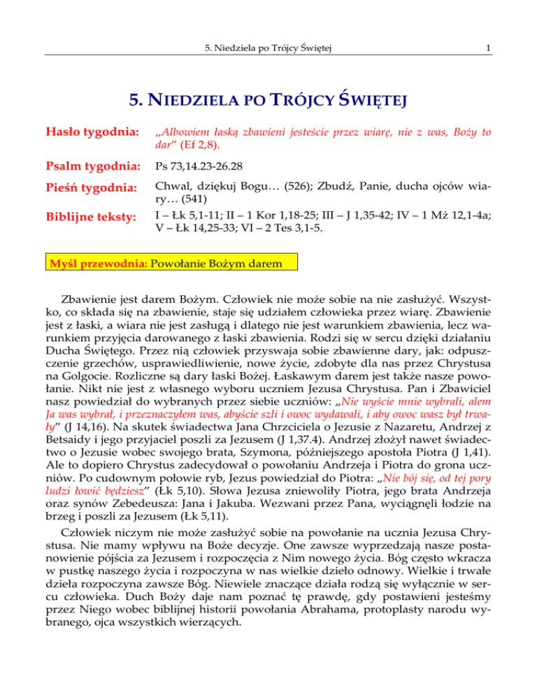 5. Niedziela po Trójcy Świętej 1 5. NIEDZIELA PO TRÓJCY ŚWIĘTEJ Hasło tygodnia: „Albowiem łaską zbawieni jesteście przez wiarę, nie z was, Boży to dar” (Ef 2,8). Psalm tygodnia: Ps 73,14.23-26.28 Pieśń tygodnia: Chwal, dziękuj Bogu… (526); Zbudź, Panie, ducha ojców wiary… (541) Biblijne teksty: I – Łk 5,1-11; II – 1 Kor 1,18-25; III – J 1,35-42; IV – 1 Mż 12,1-4a; V – Łk 14,25-33; VI – 2 Tes 3,1-5. Myśl przewodnia: Powołanie Bożym darem Zbawienie jest darem Bożym. Człowiek nie może sobie na nie zasłużyć. Wszystko, co składa się na zbawienie, staje się udziałem człowieka przez wiarę. Zbawienie jest z łaski, a wiara nie jest zasługą i dlatego nie jest warunkiem zbawienia, lecz warunkiem przyjęcia darowanego z łaski zbawienia. Rodzi się w sercu dzięki działaniu Ducha Świętego. Przez nią człowiek przyswaja sobie zbawienne dary, jak: odpuszczenie grzechów, usprawiedliwienie, nowe życie, zdobyte dla nas przez Chrystusa na Golgocie. Rozliczne są dary łaski Bożej. Łaskawym darem jest także nasze powołanie. Nikt nie jest z własnego wyboru uczniem Jezusa Chrystusa. Pan i Zbawiciel nasz powiedział do wybranych przez siebie uczniów: „Nie wyście mnie wybrali, alem Ja was wybrał, i przeznaczyłem was, abyście szli i owoc wydawali, i aby owoc wasz był trwały” (J 14,16). Na skutek świadectwa Jana Chrzciciela o Jezusie z Nazaretu, Andrzej z Betsaidy i jego przyjaciel poszli za Jezusem (J 1,37.4). Andrzej złożył nawet świadectwo o Jezusie wobec swojego brata, Szymona, późniejszego apostoła Piotra (J 1,41). Ale to dopiero Chrystus zadecydował o powołaniu Andrzeja i Piotra do grona uczniów. Po cudownym połowie ryb, Jezus powiedział do Piotra: „Nie bój się, od tej pory ludzi łowić będziesz” (Łk 5,10). Słowa Jezusa zniewoliły Piotra, jego brata Andrzeja oraz synów Zebedeusza: Jana i Jakuba. Wezwani przez Pana, wyciągnęli łodzie na brzeg i poszli za Jezusem (Łk 5,11). Człowiek niczym nie może zasłużyć sobie na powołanie na ucznia Jezusa Chrystusa. Nie mamy wpływu na Boże decyzje. One zawsze wyprzedzają nasze postanowienie pójścia za Jezusem i rozpoczęcia z Nim nowego życia. Bóg często wkracza w pustkę naszego życia i rozpoczyna w nas wielkie dzieło odnowy. Wielkie i trwałe dzieła rozpoczyna zawsze Bóg. Niewiele znaczące działa rodzą się wyłącznie w sercu człowieka. Duch Boży daje nam poznać tę prawdę, gdy postawieni jesteśmy przez Niego wobec biblijnej historii powołania Abrahama, protoplasty narodu wybranego, ojca wszystkich wierzących. 2 5. Niedziela po Trójcy Świętej Bóg, realizując swoje plany, wybrał Abrahama na ojca narodu, który według postanowienia Bożego miał otrzymać wszystkie obietnice zbawienia. Abraham wyłania się z historii jako postać nieznana i zagadkowa. Kim był Abraham? Jakie myśli nurtowały jego serce? Dlaczego podjął z rodziną swoją wędrówkę z Ur do Haranu? Z Biblii zdaje się wynikać, że on i jego rodzina w Haranie służyli bożkom (por. 1 Mż 31,19). Bóg, który objawił się Abrahamowi, był dla niego Kimś nieznanym, niepojętym, ale budzącym zaufanie. Bóg wkroczył w życie Abrahama nagle i niespodziewanie. Z historii powołania Abrahama wynika, że wyboru dokonał Bóg, a nie Abraham. Wybór nie został dokonany na podstawie kwalifikacji moralnych protoplasty narodu wybranego. Bóg, dokonując wyboru Abrahama, rozpoczął dzieło kształtowania jego wiary. Powołanie rozpoczynało proces przemiany. Postępowanie Abrahama jeszcze długo po powołaniu budziło wiele zastrzeżeń. Powołanie było początkiem wielkiego dzieła Bożego w życiu Abrahama i jego potomków. Decyzja Boga była suwerenna, niczym nieuwarunkowana. Bóg jednak domagał się odpowiedzi. Boża obietnica: „Uczynię z ciebie naród wielki i będę ci błogosławił, i uczynię sławnym imię twoje, tak że staniesz się błogosławieństwem” (1 Mż 12,2) nie została skierowana w próżnię. Ze słowem Bożej obietnicy związana była moc, która otwarła serce Abrahama na nieznanego mu Boga. Boży wybór i powołanie domagają się decyzji. Odpowiedź Abrahama była pozytywna. Niewątpliwie Abrahamowe „tak” było także ryzykiem, gdyż Abraham otrzymując polecenie wyjścia z domu swojego ojca, nie otrzymał żadnych gwarancji, lecz tylko obietnice. Na Boże „Wyjdź z ziemi swojej…”, Abraham odpowiedział zaufaniem. Jeśli na Bożą ingerencję w nasze życie, na wezwanie do upamiętania, odnowienia życia i naśladowania Chrystusa, nie odpowiemy ufnym oddaniem się Bogu, powierzeniem się Jemu i oczekiwaniem na dalsze zbawienne działanie, to nasza bezczynność, obojętność i postawa oczekiwania będzie niczym innym jak tylko naszym „nie” na Boży dar i Boże pójdź. Być dzieckiem Bożym i uczniem Jezusa oznacza: ufnie poddać się wezwaniu Boga, otworzyć się na Boże działanie, zapomnieć o swoich walorach i kwalifikacjach moralnych. Myśleć jedynie o Bożym dziele, które dokonuje się tu i teraz w mocy Ducha Świętego przez słowo żywego Boga. Jakie jest zadanie ucznia Jezusa Chrystusa? Ewangelista Jan świadczy, że Andrzej po spotkaniu z Jezusem, odnalazł swojego brata, Szymona, i powiedział do niego: „Znaleźliśmy Mesjasza” (J 1,41). Prawdziwy uczeń Jezusa bez zbędnych słów składa świadectwo o Chrystusie. Powinno to być świadectwo poznania godności Tego, który mówi „pójdź”, świadectwo żywej wiary, wyrażającej się w znienawidzeniu swojego grzechu a umiłowaniu Boga, obdarzającego człowieka łaską i godnością dziecka Bożego. Prawdziwy uczeń Jezusa zrywa z tym, co go odwodzi od Nauczyciela, nie pozwala Go miłować i służyć Jemu. Jeśli jest to dom i rodzina, Jezusowe „pójdź” prowadzić winno do rozwiązania wszelkich więzów, chociażby miało to spowodować obciążenie krzyżem. Być uczniem Jezusa, 5. Niedziela po Trójcy Świętej 3 znaczy dźwigać krzy