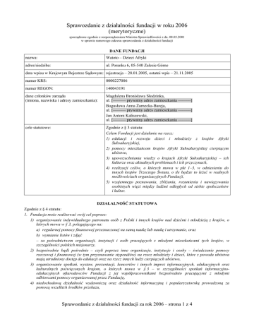 Sprawozdanie z działalności fundacji w roku 2006 (merytoryczne) sporządzone zgodnie z rozporządzeniem Ministra Sprawiedliwości z dn. 08.05.2001 w sprawie ramowego zakresu sprawozdania z działalności fundacji DANE FUNDACJI nazwa: Watoto – Dzieci Afryki adres/siedziba: ul. Poranku 6, 05-540 Zalesie Górne data wpisu w Krajowym Rejestrze Sądowym: rejestracja – 28.01.2005, ostatni wpis – 21.11.2005 numer KRS: 0000227006 numer REGON: 140043191 dane członków zarządu (imiona, nazwiska i adresy zamieszkania): Magdalena Bronisława Słodzinka, ul. [–––––– prywatny adres zamieszkania ––––––] Bogusława Anna Żarnecka-Bareja, ul. [–––––– prywatny adres zamieszkania ––––––] Jan Antoni Kaliszewski, ul. [–––––– prywatny adres zamieszkania ––––––] cele statutowe: Zgodnie z § 3 statutu: Celem Fundacji jest działanie na rzecz: 1) edukacji i rozwoju dzieci i młodzieży z krajów Afryki Subsaharyjskiej, 2) pomocy mieszkańcom krajów Afryki Subsaharyjskiej cierpiącym ubóstwo, 3) upowszechniania wiedzy o krajach Afryki Subsaharyjskiej – ich kulturze oraz aktualnych problemach i ich przyczynach, 4) realizacji celów, o których mowa w pkt 1–3, w odniesieniu do innych krajów Trzeciego Świata, o ile będzie to leżeć w realnych możliwościach organizacyjnych Fundacji, 5) wzajemnego poznawania, zbliżania, rozumienia i nawiązywania osobistych więzi między ludźmi odległych od siebie społeczeństw i kultur. DZIAŁALNOŚĆ STATUTOWA Zgodnie z § 4 statutu: 1. Fundacja może realizować swój cel poprzez: 1) organizowanie indywidualnego patronatu osób z Polski i innych krajów nad dziećmi i młodzieżą z krajów, o których mowa w § 3, polegającego na: a) regularnej pomocy finansowej przeznaczonej na samą naukę lub naukę i utrzymanie, oraz b) wymianie listów i zdjęć – za pośrednictwem organizacji, instytucji i osób pracujących z młodymi mieszkańcami tych krajów, w szczególności polskich misjonarzy, 2) bezpośrednie bądź pośrednie – czyli poprzez inne organizacje, instytucje i osoby – świadczenie pomocy rzeczowej i finansowej (w tym przyznawanie stypendiów) na rzecz młodzieży i dzieci, które z powodu ubóstwa mają utrudniony dostęp do edukacji oraz na rzecz innych ludzi cierpiących ubóstwo, 3) organizowanie spotkań, wystaw, prezentacji, koncertów i innych imprez informacyjnych, edukacyjnych oraz kulturalnych poświęconych krajom, o których mowa w § 3 – w szczególności spotkań informacyjnoedukacyjnych ofiarodawców Fundacji z jej współpracownikami bezpośrednio pracującymi z młodymi odbiorcami pomocy organizowanej przez Fundację, 4) niedochodową działalność wydawniczą oraz działalność informacyjną i popularyzatorską prowadzoną za pomocą wszelkich środków przekazu, Sprawozdanie z działalności fundacji za rok 2006 – strona 1 z 4 5) sprzedaż przedmiotów wytworzonych przez odbiorców pomocy organizowanej przez Fundację lub darów otrzymanych od ofiarodawców Fundacji – prowadzoną jako odpłatną działalność pożytku publicznego w rozumieniu art. 8 ust. 1 zdanie 2 ustawy o działalności pożytku publicznego i o wolontariacie z dnia 24 kwietnia 2003 roku (Dz.U. 2003 nr 96 poz. 873, z późniejszymi zmianami), zwanej dalej „ustawą o działalności pożytku publicznego”, 6) współpracę z innymi organizacjami, instytucjami i osobami o celach działania zbieżnych z celem Fundacji, wspieranie ich organizacyjnie, rzeczowo i finansowo. 2. Działania, o których mowa: 1) w ust. 1 pkt 1 – prowadzi się jako nieodpłatną działalność pożytku publicznego zawierającą się w zakresie, którego dotyczą kody PKD (Polskiej Klasyfikacji Działalności): 85.32.C oraz 91.33.Z, 2) w ust. 1 pkt 2 – prowadzi się jako nieodpłatną działalność pożytku publicznego zawierającą się w zakresie, którego dotyczą kody PKD: 85.32.C oraz 91.33.Z, 3) w ust. 1 pkt 3 – prowadzi się jako nieodpłatną lub odpłatną działalność pożytku publicznego zawierającą się w zakresie, którego dotyczą kody PKD: 80.42.B, 91.33.Z, 92.13.Z, 92.31.A, 92.31.C, 92.31.D, 92.31.E, 92.31.F, 4) w ust. 1 pkt 4 – prowadzi się jako nieodpłatną lub odpłatną działalność pożytku publicznego zawierającą się w zakresie, którego dotyczą kody PKD: 22.11.Z, 22.15.Z, 72.40.Z, 91.33.Z, 92.13.Z, 5) w ust. 1 pkt 5 – prowadzi się w zakresie, którego dotyczą kody PKD: 52.61.Z, 52.63.A, 52.63.B, 6) w ust. 1 pkt 6 – prowadzi się jako nieodpłatną lub odpłatną działalność pożytku publicznego zawierającą się w zakresie, którego dotyczy kod PKD 91.33.Z, z zastrzeżeniem że postanowienie to nie ogranicza możliwości współpracy z innymi podmiotami polegającej na prowadzeniu przez Fundację działań, o których mowa w ust. 1 pkt 1–5 i odpowiednio pkt 1–5 niniejszego ustępu. Zgodnie z § 5 statutu: Działalność, o której mowa w §§ 3 i 4, jest wyłączną działalnością Fundacji. Sąd rejestrowy wpisał do KRS rodzaje działalności o wyżej podanych kodach PKD jako odpowiednio odpłatną i/lub nieodpłatną działalność pożytku publicznego fundacji, z wyjątkiem działalności o kodach: 52.61.Z, 52.63.A, 52.63.B oraz 72.40.Z, które zdaniem sądu wykraczają poza działalność pożytku publicznego w rozumieniu art. 4 ust. 1 ustawy o działalności pożytku publicznego. Decyzję tę zarząd fundacji interpretuje jako uznanie, że: 1) dopuszczona statutem sprzedaż przedmiotów, o której mowa w § 4 ust. 1 pkt 5 statutu (w ustawie wyraźnie określona jako odpłatna działalność pożytku publicznego), z myślą o której wpisano do statutu PKD 52.61.Z, 52.63.A, 52.63.B – mieści się w działalności o kodzie PKD 91.33.Z, 2) posiadanie przez fundację własnej strony internetowej (co w przypadku działalności wymagającej pozyskiwania indywidualnych ofiarodawców jest oczywistą koniecznością), z myślą o której wpi
