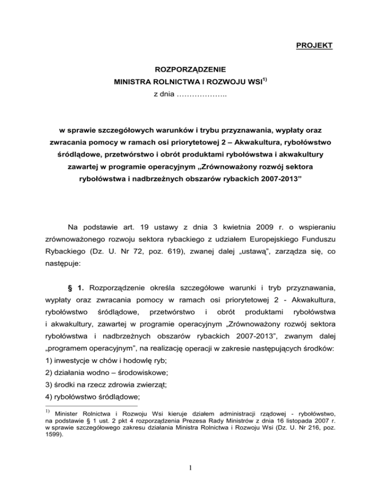 PROJEKT ROZPORZĄDZENIE MINISTRA ROLNICTWA I ROZWOJU WSI1) z dnia ……………….. w sprawie szczegółowych warunków i trybu przyznawania, wypłaty oraz zwracania pomocy w ramach osi priorytetowej 2 – Akwakultura, rybołówstwo śródlądowe, przetwórstwo i obrót produktami rybołówstwa i akwakultury zawartej w programie operacyjnym „ZrównowaŜony rozwój sektora rybołówstwa i nadbrzeŜnych obszarów rybackich 2007-2013” Na podstawie art. 19 ustawy z dnia 3 kwietnia 2009 r. o wspieraniu zrównowaŜonego rozwoju sektora rybackiego z udziałem Europejskiego Funduszu Rybackiego (Dz. U. Nr 72, poz. 619), zwanej dalej „ustawą”, zarządza się, co następuje: § 1. Rozporządzenie określa szczegółowe warunki i tryb przyznawania, wypłaty oraz zwracania pomocy w ramach osi priorytetowej 2 - Akwakultura, rybołówstwo śródlądowe, przetwórstwo i obrót produktami rybołówstwa i akwakultury, zawartej w programie operacyjnym „ZrównowaŜony rozwój sektora rybołówstwa i nadbrzeŜnych obszarów rybackich 2007-2013”, zwanym dalej „programem operacyjnym”, na realizację operacji w zakresie następujących środków: 1) inwestycje w chów i hodowlę ryb; 2) działania wodno – środowiskowe; 3) środki na rzecz zdrowia zwierząt; 4) rybołówstwo śródlądowe; 1) Minister Rolnictwa i Rozwoju Wsi kieruje działem administracji rządowej - rybołówstwo, na podstawie § 1 ust. 2 pkt 4 rozporządzenia Prezesa Rady Ministrów z dnia 16 listopada 2007 r. w sprawie szczegółowego zakresu działania Ministra Rolnictwa i Rozwoju Wsi (Dz. U. Nr 216, poz. 1599). 1 5) inwestycje w zakresie przetwórstwa i obrotu. § 2. 1. Pomoc na realizację środka inwestycje w chów i hodowlę ryb, z wyłączeniem ryb akwariowych, przysługuje na: 1) rozwój i modernizację obiektów chowu lub hodowli organizmów wodnych; 2) dywersyfikację produkcji organizmów wodnych w kierunku perspektywicznych lub nowych gatunków i wprowadzanie nowych technologii; 3) rozwój zrównowaŜonego chowu lub hodowli organizmów wodnych. 2. Pomoc finansowa przysługuje, jeŜeli: 1) operacja w zakresie chowu i hodowli ryb dotyczy obiektu chowu lub hodowli, w którym wykorzystuje się techniki zwiększające produkcję organizmów wodnych ponad naturalne moŜliwości środowiska, a organizmy te pozostają własnością beneficjenta przez cały okres chowu lub hodowli oraz w czasie odłowu; 2) wartość netto operacji jest wyŜsza od 10 000 zł. 3. Obiektem chowu lub hodowli, o którym mowa w ust. 1, są budynki, budowle, urządzenia wodne lub inne obiekty budowlane i urządzenia będące miejscem prowadzenia działalności polegającej na wylęganiu, chowie lub hodowli organizmów wodnych. § 3. 1. Rozwój i modernizacja obiektów chowu lub hodowli organizmów wodnych, o których mowa w § 2 ust. 1 pkt 1, obejmuje: 1) budowę i wyposaŜenie w maszyny, urządzenia techniczne nowego obiektu chowu lub hodowli, w tym środki transportu wewnętrznego i specjalistyczne środki transportu zewnętrznego, 2) odbudowę, rozbudowę lub przebudowę istniejącego obiektu chowu lub hodowli lub 3) adaptację, remont, wymianę, naprawę lub wyposaŜenie istniejącego obiektu chowu lub hodowli w urządzenia techniczne, w tym środki transportu wewnętrznego i specjalistyczne środki transportu zewnętrznego - słuŜące wzrostowi moŜliwości produkcyjnych tego obiektu, poprawie jakości chowu i hodowli organizmów wodnych, podniesieniu efektywności wykorzystania dostępnych zasobów wodnych, poprawie oddziaływania obiektu na środowisko lub poprawie warunków socjalnych. 2 2. Rozwój obiektów chowu lub hodowli moŜe obejmować zakup materiału obsadowego na potrzeby pierwszego cyklu hodowlanego. 3. Modernizacja istniejącego obiektu chowu lub hodowli moŜe obejmować zakup materiału obsadowego na potrzeby pierwszego cyklu hodowlanego, jeŜeli: 1) powiatowy lekarz weterynarii nakazał beneficjentowi zabicie chorych lub podejrzanych o zakaŜenie organizmów wodnych w celu zlikwidowania choroby zakaźnej lub 2) beneficjent i inni uprawnieni do rybactwa, którzy posiadają obiekty chowu lub hodowli, korzystający z wód tego samego cieku wodnego, podjęli wspólne działania w celu wyeliminowania lub zmniejszenia zagroŜenia wystąpienia choroby zakaźnej. § 4. Dywersyfikacja produkcji organizmów wodnych, o której mowa w § 2 ust. 1 pkt 2, obejmuje wprowadzenie nowych, w danym obiekcie chowu lub hodowli, gatunków organizmów wodnych z dobrymi perspektywami rynkowymi oraz wykorzystanie nowych technologii lub działań mających na celu zwiększenie wartości dodanej produktów rybnych. § 5. 1. Rozwój zrównowaŜonego chowu lub hodowli, o którym mowa w § 2 ust. 1 pkt 3, obejmuje produkcję ryb w stawach typu: 1) karpiowego - nie przekraczającą 4 ton ryb z 1 ha powierzchni uŜytkowej stawu; 2) pstrągowego - nie przekraczającą 1 tony ryb przy poborze wody wynoszącym w miejscu jej ujęcia litr wody na sekundę. 2. Zakres pomocy obejmuje w szczególności zakup sprzętu, maszyn, urządzeń technicznych i montaŜ instalacji obniŜających negatywny wpływ lub wspierających pozytywny wpływ na środowisko w zakresie chowu lub hodowli organizmów wodnych. § 6. Pomoc na realizację operacji w zakresie chowu i hodowli organizmów wodnych moŜe być przyznana beneficjentowi, który zgłosił zamiar prowadzenia działalności w zakresie chowu lub hodowli organizmów wodnych w rozumieniu ustawy z dnia 11.03.2004 r. o ochronie zdrowia zwierząt oraz zwalczaniu chorób zakaźnych zwierząt (Dz. U. nr 69, poz. 625 z późn.zm.) lub taką działalność prowadzi i: 3 1) jest posiadaczem gruntu, na którym planowana jest realizacja operacji; 2) jest uprawnionym do rybactwa w rozumieniu ustawy z dnia 18 kwietnia 1985 r. o rybactwie śródlądowym (Dz. U. z 1999 r. Nr 66, poz. 750, z późn. zm.)2); 3) wydano mu zezwolenie na prowadzenie chowu lub hodowli w polskich obszarach morskich na podstawie przepisów o rybołówstwie