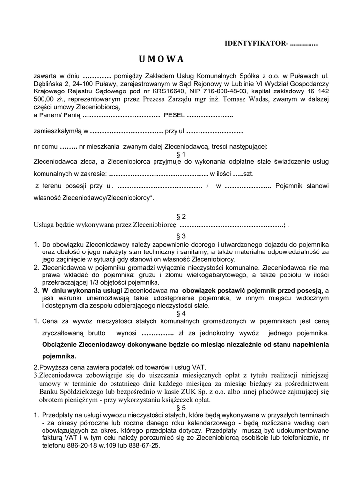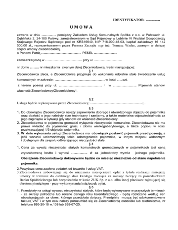 IDENTYFIKATOR- ………….. UMOWA zawarta w dniu ………… pomiędzy Zakładem Usług Komunalnych Spółka z o.o. w Puławach ul. Dęblińska 2, 24-100 Puławy, zarejestrowanym w Sąd Rejonowy w Lublinie VI Wydział Gospodarczy Krajowego Rejestru Sądowego pod nr KRS16640, NIP 716-000-48-03, kapitał zakładowy 16 142 500,00 zł., reprezentowanym przez Prezesa Zarządu mgr inż. Tomasz Wadas, zwanym w dalszej części umowy Zleceniobiorcą, a Panem/ Panią …………………………… PESEL ……………….. zamieszkałym/łą w …………………………. przy ul …………………… nr domu …….. nr mieszkania zwanym dalej Zleceniodawcą, treści następującej: §1 Zleceniodawca zleca, a Zleceniobiorca przyjmuje do wykonania odpłatne stałe świadczenie usług komunalnych w zakresie: …………………………………… w ilości …..szt. z terenu posesji przy ul. ……………………………… / w ……………….. Pojemnik stanowi własność Zleceniodawcy/Zleceniobiorcy*. §2 Usługa będzie wykonywana przez Zleceniobiorcę: ……………………………………..; . §3 1. Do obowiązku Zleceniodawcy należy zapewnienie dobrego i utwardzonego dojazdu do pojemnika oraz dbałość o jego należyty stan techniczny i sanitarny, a także materialna odpowiedzialność za jego zaginięcie w sytuacji gdy stanowi on własność Zleceniobiorcy. 2. Zleceniodawca w pojemniku gromadzi wyłącznie nieczystości komunalne. Zleceniodawca nie ma prawa wkładać do pojemnika: gruzu i złomu wielkogabarytowego, a także popiołu w ilości przekraczającej 1/3 objętości pojemnika. 3. W dniu wykonania usługi Zleceniodawca ma obowiązek postawić pojemnik przed posesją, a jeśli warunki uniemożliwiają takie udostępnienie pojemnika, w innym miejscu widocznym i dostępnym dla zespołu odbierającego nieczystości stałe. §4 1. Cena za wywóz nieczystości stałych komunalnych gromadzonych w pojemnikach jest ceną zryczałtowaną brutto i wynosi ………….. zł za jednokrotny wywóz jednego pojemnika. Obciążenie Zleceniodawcy dokonywane będzie co miesiąc niezależnie od stanu napełnienia pojemnika. 2.Powyższa cena zawiera podatek od towarów i usług VAT. 3.Zleceniodawca zobowiązuje się do uiszczania miesięcznych opłat z tytułu realizacji niniejszej umowy w terminie do ostatniego dnia każdego miesiąca za miesiąc bieżący za pośrednictwem Banku Spółdzielczego lub bezpośrednio w kasie ZUK Sp. z o.o. albo innej placówce zajmującej się obrotem pieniężnym - przy wykorzystaniu książeczek opłat. §5 1. Przedpłaty na usługi wywozu nieczystości stałych, które będą wykonywane w przyszłych terminach - za okresy półroczne lub roczne danego roku kalendarzowego - będą rozliczane według cen obowiązujących za okres, którego przedpłata dotyczy. Przedpłaty muszą być udokumentowane fakturą VAT i w tym celu należy porozumieć się ze Zleceniobiorcą osobiście lub telefonicznie, nr telefonu 886-20-18 w.109 lub 888-67-25. 2. Należności za faktury, o których mowa w pkt.1 można realizować za pośrednictwem Banku Spółdzielczego lub bezpośrednio w kasie ZUK Sp. z o.o. ul. Dęblińska 2 z wykorzystaniem książeczek opłat i z powołaniem się na numer wystawionej faktury. §6 Niedotrzymanie terminu płatności spowoduje naliczenie ustawowych odsetek. §7 1. Zleceniobiorca zobowiązany jest do terminowego zgodnie z harmonogramem wywozu nieczystości oraz postawienia pojemnika na miejsce, z którego został zabrany celem opróżnienia. 2. Jeśli termin wywozu przypada na dzień świąteczny lub wolny od pracy ustala się termin wywozu na najbliższy dzień roboczy. §8 1. Zmiany cen podawane będą w formie obwieszczenia na tablicach ogłoszeń w Urzędzie Gminy, Banku Spółdzielczym na terenie miejscowości, której umowa dotyczy. 2. Odmowa przyjęcia nowych cen wymaga formy pisemnej i równoznaczna będzie z wypowiedzeniem umowy przez Zleceniodawcę z zachowaniem okresu wypowiedzenia, o którym mowa w § 10 umowy. §9 1. Umowa niniejsza obowiązuje z dniem podpisania i jest zawarta na czas nieokreślony. 2. Wszelkie zmiany umowy wymagają formy pisemnej pod rygorem nieważności, za wyjątkiem zmiany cen o której mowa w § 8 ust.1. § 10 Wypowiedzenie umowy może nastąpić przez każdą ze stron z zachowaniem jednomiesięcznego okresu wypowiedzenia. Zleceniobiorca może rozwiązać umowę bez wypowiedzenia w przypadku nieuregulowania przez Zleceniodawcę należności określonych w § 4 i w terminie ustalonym w § 4 pkt. 2 niniejszej umowy. W przypadku rozwiązania umowy, w sytuacji gdy właścicielem pojemnika jest Zleceniobiorca, Zleceniodawca jest zobowiązany dostarczyć pojemnik jego właścicielowi. § 11 Wszelkie spory wynikające z niniejszej umowy podlegają orzecznictwu Sądu Rejonowego w Puławach. § 12 W sprawach nieuregulowanych w niniejszej umowie mają zastosowanie przepisy Kodeksu Cywilnego. § 13 Umowa niniejsza została sporządzona w dwóch jednobrzmiących egzemplarzach, po jednym dla każdej ze stron. ZLECENIOBIORCA: ZLECENIODAWCA: Oświadczenie Oświadczam, że zgadzam się na przetwarzanie przez Zakład Usług Komunalnych Spółka z o.o. w Puławach danych osobowych zawartych w umowie dla potrzeb związanych z realizacją umowy (podstawa prawna-ustawa z dnia 29.08.1997 r. o ochronie danych osobowych). ........................................................... Podpis