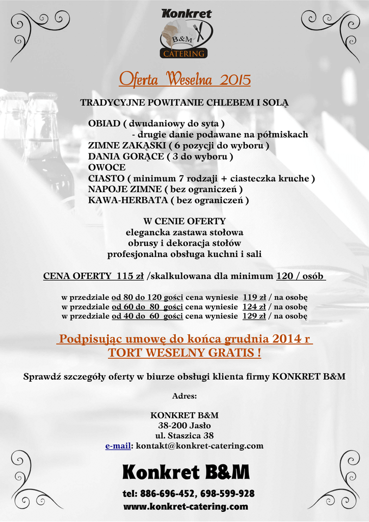 Oferta Weselna 2015 TRADYCYJNE POWITANIE CHLEBEM I SOLĄ OBIAD ( dwudaniowy do syta ) - drugie danie podawane na półmiskach ZIMNE ZAKĄSKI ( 6 pozycji do wyboru ) DANIA GORĄCE ( 3 do wyboru ) OWOCE CIASTO ( minimum 7 rodzaji + ciasteczka kruche ) NAPOJE ZIMNE ( bez ograniczeń ) KAWA-HERBATA ( bez ograniczeń ) W CENIE OFERTY elegancka zastawa stołowa obrusy i dekoracja stołów profesjonalna obsługa kuchni i sali CENA OFERTY 115 zł /skalkulowana dla minimum 120 / osób w przedziale od 80 do 120 gości cena wyniesie 119 zł / na osobę w przedziale od 60 do 80 gości cena wyniesie 124 zł / na osobę w przedziale od 40 do 60 gości cena wyniesie 129 zł / na osobę Podpisując umowę do końca grudnia 2014 r TORT WESELNY GRATIS ! Sprawdź szczegóły oferty w biurze obsługi klienta firmy KONKRET B&M Adres: KONKRET B&M 38-200 Jasło ul. Staszica 38 e-mail: [email protected]