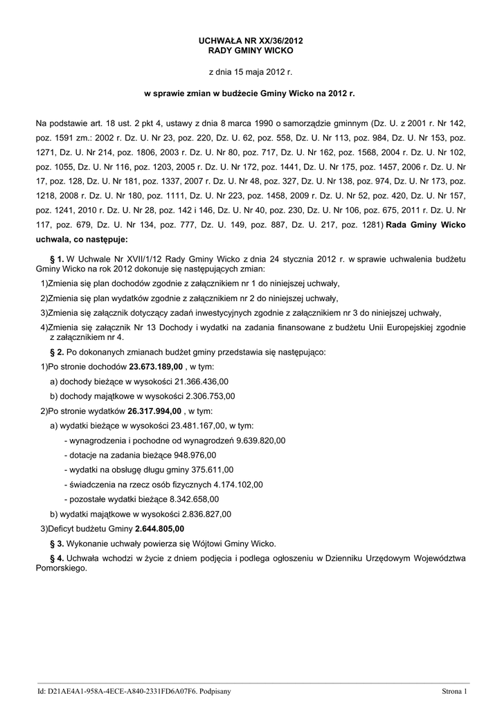 UCHWAŁA NR XX/36/2012 RADY GMINY WICKO z dnia 15 maja 2012 r. w sprawie zmian w budżecie Gminy Wicko na 2012 r. Na podstawie art. 18 ust. 2 pkt 4, ustawy z dnia 8 marca 1990 o samorządzie gminnym (Dz. U. z 2001 r. Nr 142, poz. 1591 zm.: 2002 r. Dz. U. Nr 23, poz. 220, Dz. U. 62, poz. 558, Dz. U. Nr 113, poz. 984, Dz. U. Nr 153, poz. 1271, Dz. U. Nr 214, poz. 1806, 2003 r. Dz. U. Nr 80, poz. 717, Dz. U. Nr 162, poz. 1568, 2004 r. Dz. U. Nr 102, poz. 1055, Dz. U. Nr 116, poz. 1203, 2005 r. Dz. U. Nr 172, poz. 1441, Dz. U. Nr 175, poz. 1457, 2006 r. Dz. U. Nr 17, poz. 128, Dz. U. Nr 181, poz. 1337, 2007 r. Dz. U. Nr 48, poz. 327, Dz. U. Nr 138, poz. 974, Dz. U. Nr 173, poz. 1218, 2008 r. Dz. U. Nr 180, poz. 1111, Dz. U. Nr 223, poz. 1458, 2009 r. Dz. U. Nr 52, poz. 420, Dz. U. Nr 157, poz. 1241, 2010 r. Dz. U. Nr 28, poz. 142 i 146, Dz. U. Nr 40, poz. 230, Dz. U. Nr 106, poz. 675, 2011 r. Dz. U. Nr 117, poz. 679, Dz. U. Nr 134, poz. 777, Dz. U. 149, poz. 887, Dz. U. 217, poz. 1281) Rada Gminy Wicko uchwala, co następuje: § 1. W Uchwale Nr XVII/1/12 Rady Gminy Wicko z dnia 24 stycznia 2012 r. w sprawie uchwalenia budżetu Gminy Wicko na rok 2012 dokonuje się następujących zmian: 1)Zmienia się plan dochodów zgodnie z załącznikiem nr 1 do niniejszej uchwały, 2)Zmienia się plan wydatków zgodnie z załącznikiem nr 2 do niniejszej uchwały, 3)Zmienia się załącznik dotyczący zadań inwestycyjnych zgodnie z załącznikiem nr 3 do niniejszej uchwały, 4)Zmienia się załącznik Nr 13 Dochody i wydatki na zadania finansowane z budżetu Unii Europejskiej zgodnie z załącznikiem nr 4. § 2. Po dokonanych zmianach budżet gminy przedstawia się następująco: 1)Po stronie dochodów 23.673.189,00 , w tym: a) dochody bieżące w wysokości 21.366.436,00 b) dochody majątkowe w wysokości 2.306.753,00 2)Po stronie wydatków 26.317.994,00 , w tym: a) wydatki bieżące w wysokości 23.481.167,00, w tym: - wynagrodzenia i pochodne od wynagrodzeń 9.639.820,00 - dotacje na zadania bieżące 948.976,00 - wydatki na obsługę długu gminy 375.611,00 - świadczenia na rzecz osób fizycznych 4.174.102,00 - pozostałe wydatki bieżące 8.342.658,00 b) wydatki majątkowe w wysokości 2.836.827,00 3)Deficyt budżetu Gminy 2.644.805,00 § 3. Wykonanie uchwały powierza się Wójtowi Gminy Wicko. § 4. Uchwała wchodzi w życie z dniem podjęcia i podlega ogłoszeniu w Dzienniku Urzędowym Województwa Pomorskiego. ————————————————————————————————————————————————————————— Id: D21AE4A1-958A-4ECE-A840-2331FD6A07F6. Podpisany Strona 1 ZMIANA PLANU DOCHODÓW BUDŻETU GMINY WICKO NA 2012 R. Załącznik Nr 1 do Uchwały Nr XX/36/2012 Rady Gminy Wicko z dnia 15 maja 2012 r. Dział 630 Rozdział Paragraf 63003 6207 0970 756 75621 758 75801 801 80101 Dotacje celowe w ramach programów finansowanych z udziałem środków europejskich oraz środków o których mowa w art.5 ust.1 pkt 3 oraz ust. 3 pkt 5 i 6 ustawy, lub płatności w ramach budżetu środków europejskich Dotacje celowe w ramach programów finansowanych z udziałem środków europejskich oraz środków, o których mowa w art.5 ust.1 pkt. 3 oraz ust. 3 pkt 5 i 6 ustawy, lub płatności w ramach budżetu środków europejskich 0010 2920 0690 0960 0970 0,00 0,00 Po zmianie 31 031,00 31 031,00 - 19 180,00 11 851,00 0,00 19 180,00 19 180,00 2 310 041,00 - 81 836,00 2 228 205,00 903 112,00 - 81 836,00 821 276,00 Administracja publiczna 907 630,00 - 750 000,00 157 630,00 Wpływy z różnych dochodów 831 580,00 - 750 000,00 81 580,00 Dochody z najmu i dzierżawy składników majątkowych Skarbu Państwa, jednostek samorządu terytorialnego lub innych jednostek zaliczanych do sektora finansów publicznych oraz innych umów o podobnym charakterze Pozostała działalność 2 099 012,00 831 580,00 - 81 836,00 - 750 000,00 2 017 176,00 81 580,00 Dochody od osób prawnych, od osób fizycznych i od innych jednostek nieposiadających osobowości prawnej oraz wydatki związane z ich poborem 6 686 883,00 - 69 613,00 6 617 270,00 Udziały gmin w podatkach stanowiących dochód budżetu państwa Podatek dochodowy od osób fizycznych 1 752 252,00 1 682 639,00 Różne rozliczenia 1 740 252,00 - 69 613,00 5 702 554,00 901 449,00 6 604 003,00 Subwencje ogólne z budżetu państwa 4 478 063,00 Część oświatowa subwencji ogólnej dla jednostek samorządu terytorialnego 4 478 063,00 Oświata i wychowanie 482 782,00 Szkoły podstawowe 3 296,00 Wpływy z różnych opłat 0,00 Otrzymane spadki, zapisy i darowizny w postaci pieniężnej 0,00 Wpływy z różnych dochodów 1 716,00 Razem: BeSTia 31 031,00 Zmiana 31 031,00 Gospodarka gruntami i nieruchomościami 0750 75095 31 031,00 Gospodarka mieszkaniowa 70005 750 Przed zmianą Zadania w zakresie upowszechniania turystyki 2007 700 Turystyka Treść 23 659 992,00 - 69 613,00 901 449,00 901 449,00 13 197,00 13 197,00 81,00 1 670 639,00 5 379 512,00 5 379 512,00 495 979,00 16 493,00 81,00 12 600,00 12 600,00 13 197,00 23 673 189,00 516,00 2 232,00 Strona 1 ———————————————————————————————————————————————————————————————————————————————————— Id: D21AE4A1-958A-4ECE-A840-2331FD6A07F6. Podpisany Strona 1 ZMIANA PLANU WYDATKÓW BUDŻETU GMINY WICKO NA 2012 R. Załącznik Nr 2 do Uchwały Nr XX/36/2012 Rady Gminy Wicko z 15 maja 2012 r. Dział 600 Rozdział 60016 Paragraf 4210 6050 630 63003 4300 4307 4309 6050 6057 6059 700 70005 750 75023 75095 754 75412 801 80101 BeSTia 6050 4210 6060 4210 6050 Transport i łączność Treść Drogi publiczne gminne Zakup materiałów i wyposażenia Wydatki inwestycyjne jednostek budżetowych Turystyka Zadania w zakresie upowszechniania turystyki Zakup usług pozostałych Zakup usług pozostałych Przed zmianą 1 048 4