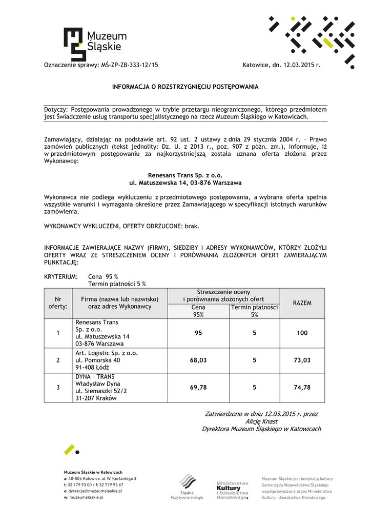 Oznaczenie sprawy: MŚ-ZP-ZB-333-12/15 Katowice, dn. 12.03.2015 r. INFORMACJA O ROZSTRZYGNIĘCIU POSTĘPOWANIA Dotyczy: Postępowania prowadzonego w trybie przetargu nieograniczonego, którego przedmiotem jest Świadczenie usług transportu specjalistycznego na rzecz Muzeum Śląskiego w Katowicach. Zamawiający, działając na podstawie art. 92 ust. 2 ustawy z dnia 29 stycznia 2004 r. – Prawo zamówień publicznych (tekst jednolity: Dz. U. z 2013 r., poz. 907 z późn. zm.), informuje, iż w przedmiotowym postępowaniu za najkorzystniejszą została uznana oferta złożona przez Wykonawcę: Renesans Trans Sp. z o.o. ul. Matuszewska 14, 03-876 Warszawa Wykonawca nie podlega wykluczeniu z przedmiotowego postępowania, a wybrana oferta spełnia wszystkie warunki i wymagania określone przez Zamawiającego w specyfikacji istotnych warunków zamówienia. WYKONAWCY WYKLUCZENI, OFERTY ODRZUCONE: brak. INFORMACJE ZAWIERAJĄCE NAZWY (FIRMY), SIEDZIBY I ADRESY WYKONAWCÓW, KTÓRZY ZŁOŻYLI OFERTY WRAZ ZE STRESZCZENIEM OCENY I PORÓWNANIA ZŁOŻONYCH OFERT ZAWIERAJĄCYM PUNKTACJĘ: KRYTERIUM: Nr oferty: 1 2 3 Cena 95 % Termin płatności 5 % Firma (nazwa lub nazwisko) oraz adres Wykonawcy Renesans Trans Sp. z o.o. ul. Matuszewska 14 03-876 Warszawa Art. Logistic Sp. z o.o. ul. Pomorska 40 91-408 Łódź DYNA – TRANS Władysław Dyna ul. Siemaszki 52/2 31-207 Kraków Streszczenie oceny i porównania złożonych ofert Cena Termin płatności 95% 5% RAZEM 95 5 100 68,03 5 73,03 69,78 5 74,78 Zatwierdzono w dniu 12.03.2015 r. przez Alicję Knast Dyrektora Muzeum Śląskiego w Katowicach