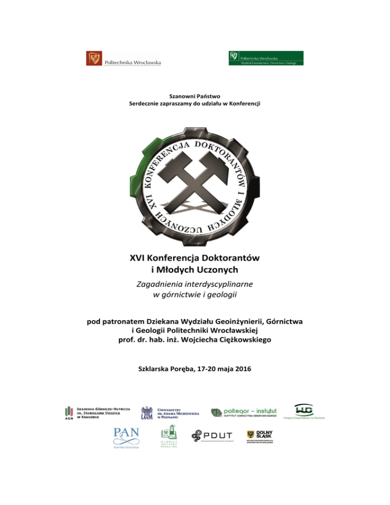 Szanowni Państwo Serdecznie zapraszamy do udziału w Konferencji XVI Konferencja Doktorantów i Młodych Uczonych Zagadnienia interdyscyplinarne w górnictwie i geologii pod patronatem Dziekana Wydziału Geoinżynierii, Górnictwa i Geologii Politechniki Wrocławskiej prof. dr. hab. inż. Wojciecha Ciężkowskiego Szklarska Poręba, 17-20 maja 2016 ZAPROSZENIE Doktoranci oraz pracownicy Wydziału Geoinżynierii, Górnictwa i Geologii Politechniki Wrocławskiej mają przyjemność zaprosić na XVI Konferencję Doktorantów i Młodych Uczonych, która odbędzie się w Szklarskiej Porębie w dniach 17-20 maja 2016. Konferencja stanowi wspaniałą okazję do wymiany doświadczeń i nawiązywania kontaktów zarówno pod kątem przyszłej współpracy naukowej jak i towarzyskim. MIEJSCE I DATA Nadchodząca XVI Konferencja tradycyjnie odbędzie się w Ośrodku Konferencyjno-Szkoleniowym „Radość” Politechniki Wrocławskiej w Szklarskiej Porębie w dniach 17-20 maja 2016. Jest to miasto położone u stóp Szrenicy stanowiącej jeden ze szczytów Karkonoszy. Znane jest przede wszystkim z piękna otaczającej przyrody oraz unikalnego klimatu, często porównywanego z alpejskim. Wszystkie te elementy sprawiają, że jest ona wręcz doskonałym punktem wyjścia do zwiedzania zarówno polskich i czeskich Karkonoszy oraz Gór Izerskich. PROGRAM Program naukowy XVI Konferencji Doktorantów i Młodych Uczonych skupiać się będzie wokół trzech paneli tematycznych: 1. Górnictwo (problemy zabezpieczenia, ochrony i wykorzystania pozostałości dawnych robót górniczych, górnictwo podziemne, górnictwo odkrywkowe, przeróbka kopalin i odpadów, maszyny górnicze, transport kopalniany, ekonomika w górnictwie, aerologia górnicza, wentylacja i klimatyzacja kopalń) 2. Nauki o Ziemi i Kosmosie (geologia, hydrogeologia, ochrona środowiska, surowce pozaziemskie, wody podziemne i lecznicze, inżynieria i ochrona środowiska, geoturystyka) 3. Geoinformacja (geodezja górnicza, GIS, fotogrametria i teledetekcja, modelowanie geodanych). Każda z wymienionych sesji tematycznych zostanie poprzedzona wprowadzeniem w formie wykładu zamawianego. Wszystkie zakwalifikowane przez Komitet Naukowo-Organizacyjny zgłoszenia otrzymają możliwość ustnego wystąpienia. Dla uczestników zgłaszających postery przewidziana jest sesja picoprezentacji (krótkie, 3-minutowe wystąpienia, optymalnie 3-5 slajdów, z czego pierwszy tytułowy, a ostatni – literatura). Oficjalnymi językami dla każdego panelu są język polski oraz angielski. W ramach Konferencji odbędzie się wycieczka dydaktyczna wzdłuż udostępnionych do zwiedzania tras kopalni uranu w Kowarach oraz warsztaty terenowe z zakresu geologii i geoinformatyki. ZGŁOSZENIA UDZIAŁU Osoby zainteresowane udziałem w Konferencji prosimy o wypełnienie formularza Karty Zgłoszeniowej dostępnego na stronie internetowej Konferencji kdimu.pwr.wroc.pl lub przesłanie drogą elektroniczną wersji dołączonej do I Komunikatu (dokument dostępny również na stronie Konferencji) na adres [email protected]. KOSZTY UCZESTNICTWA Opłata konferencyjna (z VAT) wynosi: - 650 zł (przy dokonaniu wpłaty do 31.03.2016) - 700 zł (przy dokonaniu wpłaty do 29.04.2016). Obejmuje ona udział w sesjach, wydawnictwo i materiały konferencyjne, wyżywienie (od kolacji 17.05.2016 do obiadu 20.05.2016), noclegi, wycieczkę oraz warsztaty terenowe, a także Biesiadę Górniczą. WPŁATY Wpłaty należy dokonać na konto: Politechnika Wrocławska Wydział Geoinżynierii, Górnictwa i Geologii Wybrzeże Wyspiańskiego 27 50-370 Wrocław Nr konta: 37 1090 2402 0000 0006 1000 0434 (z dopiskiem „XVI KDiMU, imię i nazwisko uczestnika”) PUBLIKACJA Artykuły, które pozytywnie przejdą etap recenzji zostaną opublikowane jako zeszyt specjalny czasopisma Mining Science, które znajduje się na liście czasopism punktowanych Ministerstwa Nauki i Szkolnictwa Wyższego (wykaz B, pozycja 995, 8 pkt). Artykuły, które nie uzyskają pozytywnej opinii Komitetu Naukowo-Organizacyjnego będą odsyłane do Autora wraz z uwagami. Po korekcie i uwzględnieniu uwag recenzentów redakcja dopuszcza ich przyjęcie do regularnego numeru czasopisma Mining Science lub też kolejnego zeszytu specjalnego. Artykuły zarówno do regularnego numeru czasopisma Mining Science jak i zeszytu specjalnego można przesyłać w ciągu całego roku kalendarzowego bez deklaracji udziału w Konferencji, przy czym koszt publikacji w zeszycie specjalnym w takiej sytuacji wynosi 400 zł. Zeszyt specjalny Mining Science zawierający artykuły nadesłane przez uczestników Konferencji zostanie opublikowany nie później niż we wrześniu 2016 r. Każdy artykuł w momencie uzyskania statusu „przyjęty do druku” będzie automatycznie umieszczany w wersji elektronicznej w serwisie Mining Science http://www.miningscience.pwr.edu.pl TERMINARZ Nadsyłanie zgłoszeń i abstraktów wystąpień 15.04.2016 Opłata konferencyjna 29.04.2016 Nadsyłanie artykułów 06.06.2016 PATRONAT HONOROWY prof. dr hab. inż. Tadeusz Więckowski, Rektor Politechniki Wrocławskiej prof. dr hab. inż. Tadeusz Słomka, Rektor Akademii Górniczo-Hutniczej w Krakowie prof. dr hab. Bronisław Marciniak, Rektor Uniwersytetu im. Adama Mickiewicza w Poznaniu dr hab. inż. Jacek Szczepiński, Dyrektor „Poltegor-Instytut” Instytut Górnictwa Odkrywkowego mgr inż. Robert Podolski, Dyrektor Okręgowego Urzędu Górniczego we Wrocławiu Polska Akademia Nauk – Komitet Górnictwa, Przewodniczący prof. dr hab. inż. Antoni Tajduś dr hab. inż. Stanisław Prusek, prof. GIG, Naczelny Dyrektor Głównego Instytutu Górnictwa Porozumienie Doktorantów Uczelni Technicznych, Przewodniczący mgr inż. Łukasz Krzyśko mgr inż. Cezary Przybylski, Marszałek Województwa Dolnośląskiego KOMITET NAUKOWO-ORGANIZACYJNY prof. dr hab. inż. Wojciech Ciężkowski, Dziekan Wydziału Geoinżynierii, Górnictwa i Geologii Politechniki Wrocławskiej prof. dr hab. in