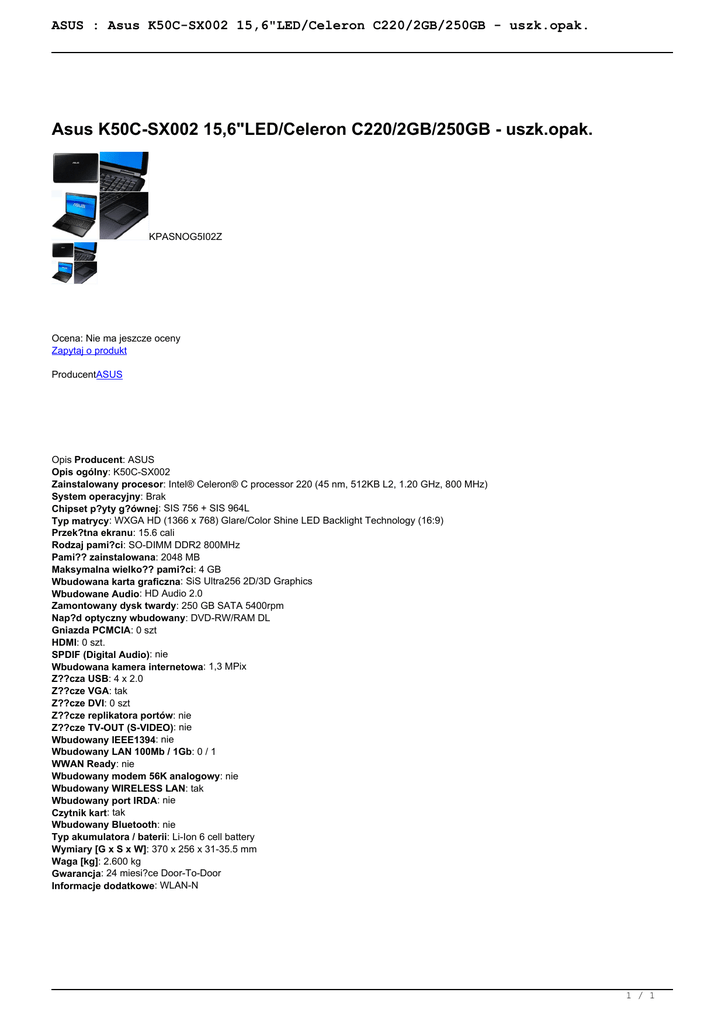 ASUS : Asus K50C-SX002 15,6"LED/Celeron C220/2GB/250GB - uszk.opak. Asus K50C-SX002 15,6"LED/Celeron C220/2GB/250GB - uszk.opak. KPASNOG5I02Z Ocena: Nie ma jeszcze oceny Zapytaj o produkt ProducentASUS Opis Producent: ASUS Opis ogólny: K50C-SX002 Zainstalowany procesor: Intel® Celeron® C processor 220 (45 nm, 512KB L2, 1.20 GHz, 800 MHz) System operacyjny: Brak Chipset p?yty g?ównej: SIS 756 + SIS 964L Typ matrycy: WXGA HD (1366 x 768) Glare/Color Shine LED Backlight Technology (16:9) Przek?tna ekranu: 15.6 cali Rodzaj pami?ci: SO-DIMM DDR2 800MHz Pami?? zainstalowana: 2048 MB Maksymalna wielko?? pami?ci: 4 GB Wbudowana karta graficzna: SiS Ultra256 2D/3D Graphics Wbudowane Audio: HD Audio 2.0 Zamontowany dysk twardy: 250 GB SATA 5400rpm Nap?d optyczny wbudowany: DVD-RW/RAM DL Gniazda PCMCIA: 0 szt HDMI: 0 szt. SPDIF (Digital Audio): nie Wbudowana kamera internetowa: 1,3 MPix Z??cza USB: 4 x 2.0 Z??cze VGA: tak Z??cze DVI: 0 szt Z??cze replikatora portów: nie Z??cze TV-OUT (S-VIDEO): nie Wbudowany IEEE1394: nie Wbudowany LAN 100Mb / 1Gb: 0 / 1 WWAN Ready: nie Wbudowany modem 56K analogowy: nie Wbudowany WIRELESS LAN: tak Wbudowany port IRDA: nie Czytnik kart: tak Wbudowany Bluetooth: nie Typ akumulatora / baterii: Li-Ion 6 cell battery Wymiary [G x S x W]: 370 x 256 x 31-35.5 mm Waga [kg]: 2.600 kg Gwarancja: 24 miesi?ce Door-To-Door Informacje dodatkowe: WLAN-N 1 / 1 Powered by TCPDF (www.tcpdf.org)