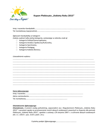 Kupon Plebiscytu „Kobiety Roku 2015” Imię i nazwisko Kandydatki…………..…………………………………………………………………………………… Tel. kontaktowy (opcjonalnie)……………………………………………………………… Zgłaszam Kandydatkę w kategorii: (należy wybrać tylko jedną kategorię, wstawiając w okienku znak x) kategoria Polityk/Samorządowiec, kategoria Działacz Społeczny/Kulturalny, kategoria Sportowiec, kategoria Pedagog, kategoria Kobieta Biznesu. Uzasadnienie wyboru ………………….………………………………………………………………........................................................................... …………………………………………………………………………………………………………………………………………………………….. …………………………………………………………………………………………………………………………………………………………….. …………………………………………………………………………………………………………………………………………………………….. …………………………………………………………………………………………………………………………………………………………….. …………………………………………………………………………………………………………………………………………………………….. …………………………………………………………………………………………………………………………………………………………….. …………………………………………………………………………………………………………………………………………………………….. …………………………………………………………………………………………………………………………………………………………….. ……………………………………………………………………………………………………………………………………………………………. ……………………………………………………………………………………………………………………………………………………………. Dane Zgłaszającego Imię i nazwisko…………………………….……………………………………………………………………............. Adres zamieszkania…………………………………..………………………………….................................. Tel. kontaktowy……………………………………………………………………………... Oświadczenie Zgłaszającego Oświadczam, iż jestem osobą pełnoletnią, zapoznałem się z Regulaminem Plebiscytu „Kobiety Roku 2015” i wyrażam zgodę na przetwarzanie moich danych osobowych zawartych w Kuponie dla potrzeb Plebiscytu „Kobiety Roku 2015”, zgodnie z ustawą z 29 sierpnia 1997 r. o ochronie danych osobowych (Dz. U. z 2015 r. poz. 2135 z późn. zm.). Czytelny podpis Zgłaszającego………………………………………