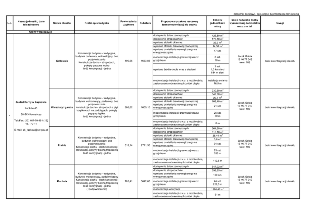 załącznik do SIWZ - opis części X przedmiotu zamówienia L.p. Nazwa jednostki, dane teleadresowe Nazwa obiektu Krótki opis budynku Powierzchnia użytkowa Kubatura Proponowany zakres rzeczowy termomodernizacji do audytu Ilości w jednostkach miary Imię i nazwisko osoby wyznaczonej do kontaktu wraz z nr tel. Uwagi OISW w Rzeszowie Kotłownia Konstrukcja budynku - tradycyjna, budynek parterowy, wolnostojący, bez podpiwniczenia Konstrukcja dachu - stropodach, pokryty papą na lepiku Ilość kondygnacji - jedna 190,65 1653,83 docieplenie ścian zewnętrznych docieplenie stropodachów wymiana stolarki okiennej wymiana stolarki drzwiowej zewnętrznej wymiana oświetlenia wewnętrznego na energooszczędne 426,80 m 2 170,10 m 2 36,9 m 2 14,36 m 2 modernizacja instalacji grzewczej wraz z grzejnikami 8 szt. 10 m wymiana źródła ciepła wraz z sieciami modernizacja instalacji c.w.u. z możliwością zastosowania odnawialnych źródeł ciepła Zakład Karny w Łupkowie Łupków 45 1 Warsztaty i garaże 38-543 Komańcza Konstrukcja budynku - tradycyjna, budynek wolnostojący, parterowy, bez podpiwniczenia Konstrukcja dachu - stropodach z płyt korytkowych na podciągach, pokryty papą na lepiku, Ilość kondygnacji - jedna 366,62 1605,10 Tel./Fax: (13) 467-70-49 / (13) 467-70-11 E-mail: [email protected] Pralnia Konstrukcja budynku - tradycyjna, budynek wolnostojący, bez podpiwniczenia Konstrukcja dachu - dach konstrukcji drewnianej, pokryty blachą trapezową Ilość kondygnacji - jedna 518,14 2711,30 modernizacja instalacji grzewczej wraz z grzejnikami 25 szt. 30 m modernizacja instalacji grzewczej wraz z grzejnikami Kuchnia 785,41 3042,00 21 szt. 564,60 m 2 518,10 m 2 26,44 m 2 3,6 m 2 94 szt. Jacek Gołda 13 46 77 049 wew. 102 brak inwentaryzacji obiektu 112,5 m 547,02 m 2 392,65 m 2 modernizacja instalacji c.w.u. z możliwością zastosowania odnawialnych źródeł ciepła brak inwentaryzacji obiektu 25 szt. 286 m docieplenie stropodachów wymiana oświetlenia wewnętrznego na energooszczędne modernizacja wentylacji Jacek Gołda 13 46 77 049 wew. 102 6m docieplenie ścian zewnętrznych modernizacja instalacji grzewczej wraz z grzejnikami brak inwentaryzacji obiektu instalacja solarna 76,5 m 230,60 m 2 349,90 m 2 20,7 m 2 108,40 m 2 modernizacja instalacji c.w.u. z możliwością zastosowania odnawialnych źródeł ciepła docieplenie ścian zewnętrznych docieplenie stropodachów wymiana stolarki okiennej wymiana stolarki drzwiowej zewnętrznej wymiana oświetlenia wewnętrznego na energooszczędne Jacek Gołda 13 46 77 049 wew. 102 2 szt. 1,3 km sieci 834 m sieci docieplenie ścian zewnętrznych docieplenie stropodachów wymiana stolarki okiennej wymiana stolarki drzwiowej zewnętrznej wymiana oświetlenia wewnętrznego na energooszczędne modernizacja instalacji c.w.u. z możliwością zastosowania odnawialnych źródeł ciepła Konstrukcja budynku - tradycyjna, budynek wolnostojący, podpiwniczony Konstrukcja dachu - dach konstrukcji drewnianej, pokryty balchą trapezową Ilość kondygnacji - jedna (+podpiwniczenie) 17 szt. 100 szt. 24 szt. 228,5 m 1386,46 m 3 61 m Jacek Gołda 13 46 77 049 wew. 102 brak inwentaryzacji obiektu Wartownia Zakład Karny w Łupkowie Oddział Zewnętrzny w Moszczańcu Warsztaty i garaże Moszczaniec 14 2 Konstrukcja budynku - budynek wolnostojący, bez podpiwniczenia, ławy żelbetowe na gł. 1,2 m, ściany zewnętrzne z cegły pełnej, ściany działowe z cegły pełnej i z cegły dziurawki, Konstrukcja dachu - stropodach jednospadowy i dwuspadowy, konstrukcji ciężkiej, wykonany z płyt żelbetowych żebrowych pokryty papą na lepiku , Ilość kondygnacji - jedna Konstrukcja budynku - budynek wolnostojący, parterowy, bez podpiwniczenia, ściany zewnętrzne, wewnętrzne i działowe z cegły pełnej, Konstrukcja dachu - stropodach dwuspadowy, konstrukcji ciężkiej, wykonany z płyt żelbetowych żebrowych pokryty papą na lepiku, Ilość kondygnacji - jedna 217,81 326,80 1065,60 1299,10 Tel./Fax: (13) 466-35-14/ (13) 466-35-14 w. 220 Kuchnia Konstrukcja budynku - tradycyjna, budynek wolnostojący, podpiwniczony Konstrukcja dachu - stropodach pokryty papą na lepiku, Ilość kondygnacji - jedna (+ podpiwniczenie) 259,9 m 2 docieplenie stropodachów 279,1 m 2 wymiana oświetlenia wewnętrznego na energooszczędne 23 szt. modernizacja instalacji grzewczej wraz z grzejnikami 25 szt. 130 m modernizacja instalacji c.w.u. z możliwością zastosowania odnawialnych źródeł ciepła docieplenie ścian zewnętrznych docieplenie stropodachów wymiana stolarki drzwiowej zewnętrznej wymiana oświetlenia wewnętrznego na energooszczędne modernizacja instalacji grzewczej wraz z grzejnikami modernizacja instalacji c.w.u. z możliwością zastosowania odnawialnych źródeł ciepła 38-543 Komańcza E-mail: [email protected] docieplenie ścian zewnętrznych 712,68 3142,16 Dyżurka bramowego Konstrukcja budynku - budynek wolnostojący, parterowy, bez podpiwniczenia, ściany zewnętrzne i wewnętrzne z cegły pełnej i pustaka, Konstrukcja dachu - stropodach jednospadowy konstrukcji lekkiej, wykonany z desek pokryty papą na lepiku, Ilość kondygnacji - jedna 9,78 40,88 412,1 m 2 31,2 m 2 23 szt. 7 szt. 108 m modernizacja instalacji grzewczej wraz z grzejnikami 24 szt. 250 m 80 szt. brak inwentaryzacji obiektu Jacek Gołda 13 46 77 049 wew. 102 brak inwentaryzacji obiektu 1351,75 m 3 61,5 m docieplenie ścian zewnętrznych 44,40 m 2 docieplenie stropodachów 14,80 m 2 wymiana oświetlenia wewnętrznego na energooszczędne Jacek Gołda 13 46 77 049 wew. 102 2 szt. punktów czerpalnych 476,3 m 2 508,4 m 2 2,2 m 2 modernizacja instalacji c.w.u. z możliwością zastosowania odnawialnych źródeł ciepła brak inwentaryzacji obiektu 4 szt. punktów czerpalnych, 284,8 m 2 docieplenie ścian zewnętrznych docieplenie stropodachów wymiana stolarki drzwiowej zewnętrznej wymiana oświetlenia wewnętrznego na energooszczędne modernizacja wentylacji Jacek Gołda 13 46 77 04