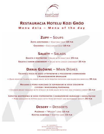 R ESTAURACJA H OTELU K OZI G RÓD Menudnia–Menuoftheday Z UPY – S OUPS Z U P A JA R Z Y N O W A – V E G E T A B L E S O U P 10 P L N C H Ł O D N IK – C O L D S E R V E D S O U P 10 P L N S AŁATY – S ALADS S A ŁA T A Z R O S T B E F E M – S A L A D W I T H R O A S T B E E F 25 P L N S A ŁA T A Z S E R E M C A M E M B E R T – S A L A D W I T H C H E E S E C A M E M B E R T 25 P L N D ANIA G ŁÓWNE – M AIN D ISHES T O L A P IA Z P IE C A W S O S IE C Y T R Y N O W Y M Z P IE C Z O N Y M IZ IE M N IA K A M I IB L A N S Z O W A N Y M B R O K U Ł E M – O V E R - R O A S T E D T I L A P I A I N L E M O N S A U C E W I T H R O A S T E D P O T A T O E S A N D B L A N C H E D B R O C C O L I 35 P L N R O L A D K A Z P IE R S IK U R C Z A K A Z E S Z P IN A K IE M W S O S IE Z IO ŁO W Y M Z R Y Ż E M IM A R C H E W K Ą P A R O W A N Ą – C H I C K E N B R E A S T R O U L A D E W I T H S P I N A C H I N H E R B S A U C E W I T H R I C E A N D S T E A M E D C A R R O T 35 P L N Ł O P A T K A W IE P R Z O W A W S O S IE P IE P R Z O W Y M Z Z A S M A Ż O N Y M IB U R A K A M IIK A S Z Ą P Ę C Z A K – P O R K S H O U L D E R I N P E P P E R S A U C E W I T H F R I E D B E E T R O O T A N D B U C K W H E A T G R O A T S 35 P L N D ESERY – D ESSERTS P L E Ś N IA K – “M O L D Y ” C A K E 15 P L N K O S T K A K A W O W A – C O F F E E C A K E 15 P L N ul.Leśników3 83-047Pomlewok/Gdańska +48601610453 www.kozigrod.pl;[email protected]