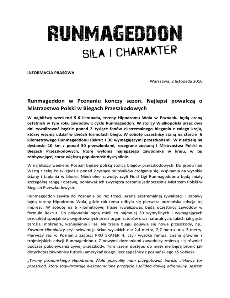 INFORMACJA PRASOWA Warszawa, 2 listopada 2016 Runmageddon w Poznaniu kończy sezon. Najlepsi powalczą o Mistrzostwo Polski w Biegach Przeszkodowych W najbliższy weekend 5-6 listopada, tereny Hipodromu Wola w Poznaniu będą areną ostatnich w tym roku zawodów z cyklu Runmageddon. W stolicy Wielkopolski przez dwa dni rywalizować będzie ponad 2 tysiące fanów ekstremalnego biegania z całego kraju, którzy wezmą udział w dwóch formułach biegu. W sobotę uczestnicy staną na starcie 6 kilometrowego Runmageddonu Rekrut z 30 wymagającymi przeszkodami. W niedzielę na dystansie 10 km z ponad 50 przeszkodami, rozegrane zostaną I Mistrzostwa Polski w Biegach Przeszkodowych, które wyłonią najlepszego zawodnika w kraju, w tej zdobywającej coraz większą popularność dyscyplinie. W najbliższy weekend Poznań będzie polską stolicą biegów przeszkodowych. Do grodu nad Wartą z całej Polski zjedzie ponad 2 tysiące miłośników czołgania się, wspinania na wysokie ściany i taplania w błocie. Niedzielne zawody, czyli Finał Ligi Runmageddonu będą miały szczególną rangę i oprawę, ponieważ ich zwycięzca zostanie jednocześnie Mistrzem Polski w Biegach Przeszkodowych. Runmageddon zawita do Poznania po raz trzeci. Areną ekstremalnej rywalizacji i zabawy będą tereny Hipodromu Wola, gdzie rok temu odbyła się pierwsza poznańska edycja tej imprezy. W sobotę na 6 kilometrowej trasie rywalizować będą uczestnicy zawodów w formule Rekrut. Do pokonania będą mieli co najmniej 30 wymyślnych i wymagających przeszkód specjalnie przygotowanych przez organizatorów oraz naturalnych, takich jak gęste zarośla, mokradła, wzniesienia i las. Na trasie biegu pojawią się nowe przeszkody, np.; Koszmar Himalaisty czyli sekwencja ścian wysokich na: 2,4 metra, 2,7 metra oraz 3 metry. Pierwszy raz w Poznaniu zagości PRO SKATER 4, czyli wysoka rampa, znana głównie z trójmiejskich edycji Runmageddonu. Z nowymi doznaniami zawodnicy zmierzą się również podczas pokonywania żywej przeszkody. Tym razem dostępu do mety nie będą bronić jak dotychczas zawodnicy futbolu amerykańskiego, lecz zapaśnicy z poznańskiego KS Sobieski. „Tereny poznańskiego Hipodromu Wola pozwoliły nam przygotować bardzo ciekawy tor przeszkód, który zagwarantuje niezapomniane przeżycia i solidną dawkę adrenaliny. Jestem przekonany, że urozmaicenie terenu w połączeniu z przygotowanymi przez nas przeszkodami sprawią, że nawet najbardziej wymagający fani ekstremalnego biegania docenią wysoki poziom trudności trasy poznańskiego Runmageddonu. Pomysłowe przeszkody sprawdzą siłę i charakter uczestników oraz wyłonią najlepszego zawodnika w kraju, podczas pierwszej edycji Mistrzostw Polski w Biegach Przeszkodowych. Widzimy, że zawody cieszą się dużą popularnością wśród fanów biegów przeszkodowych z całej Polski. Do startu w poznańskim Runmageddonie zachęcamy nie tylko fanów biegania, ale każdego, kto lubi sprawdzać granice swoich możliwości.” – powiedział Bartosz Galiński, Dyrektor Marketingu Runmageddonu. W niedzielę na starcie staną najlepsi z najlepszych na przestrzeni całego sezonu, którzy już na całego, rywalizować będą o zwycięstwo w Finale Ligi Runmageddonu oraz Mistrzostwach Polski w Biegach Przeszkodowych. Na przestrzeni kilku już lat, od kiedy organizowane są biegi przeszkodowe w Polsce, ukształtowała się czołówka zawodników, którzy w każdym biegu walczą o zwycięstwo. Przyszła więc pora, aby rozstrzygnąć, kto na dziś jest w tej konkurencji najlepszym zawodnikiem w kraju. Formuła mistrzostw to unifikacja przepisów światowych z dystansem 10 km i około 50 przeszkód o różnym stopniu trudności. Mistrz Polski poza tytułem uzyska prawo startu w Mistrzostwach Europy (OCR European Championships) oraz wsparcie Runmageddonu w udziale w Mistrzostwach Świata. Runmageddon to nie tylko ekstremalna zabawa i taplanie się w błocie dla dorosłych zawodników. Organizatorzy tradycyjnie już, przygotowali również strefę Runmageddon KIDS, gdzie dzieciaki między 4-7 i 8-11 lat również mogą się sprawdzić na torze przeszkód, nie mniej wymagającym, niż ten dla dorosłych. Kibice z kolei będą mieli okazję sprawdzić się w specjalnej strefie challenge z zakręconymi konkursami sprawnościowo-siłowymi przygotowanymi we współpracy z firmą Haier. Poza tym strefa gastro z mniej lub bardziej niezdrowym jedzeniem i wiele, wiele innych niespodzianek. *** O biegu Runmageddon (www.runmageddon.pl) Runmageddon to największy cykl ekstremalnych biegów przez przeszkody w Polsce. Organizatorami imprezy są Fundacja Runmageddon oraz firma Extreme Events. Runmageddon zwiastuje koniec ery nudnych biegów ulicznych oferując jego uczestnikom ekstremalne wrażenia. To wydarzenie nastawione na dobrą zabawę, do której pretekstem jest wysiłek fizyczny i rywalizacja o miano najtwardszego zawodnika. Uczestnik prąc naprzód wspinają się, czołgają, brną w błocie, skaczą, a także mierzą się z wodą oraz ogniem. Imprezy pod szyldem Runmageddonu odbywają się w formułach Intro (3 km i +15 przeszkód), Rekrut (6km i +30 przeszkód), Classic (12km i + 50 przeszkód) oraz Hardcore (21km i +70 przeszkód). Kontakt dla mediów: bryzgoszczelna Marcin Dulnik Rzecznik prasowy Runmageddon Agencja In Fact PR [email protected] mobile: 660 722 822