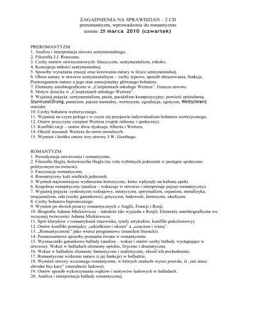 ZAGADNIENIA NA SPRAWDZIAN – 2 CD preromantyzm, wprowadzenie do romantyzmu termin: 25 marca 2010 (czwartek) PREROMANTYZM 1. Analiza i interpretacja utworu sentymentalnego. 2. Filozofia J.J. Rousseau. 3. Cechy nurtów oświeceniowych: klasycyzm, sentymentalizm, rokoko. 4. Koncepcja miłości sentymentalnej. 5. Sposoby wyrażania emocji oraz kreowania natury w liryce sentymentalnej. 6. Obraz natury w utworze sentymentalnym – cechy typowe, sposób obrazowania, funkcje. Postrzeganiem natury a jego stan emocjonalny głównego bohatera. 7. Elementy autobiograficzne w „Cierpieniach młodego Wertera”. Geneza utworu. 8. Motyw dziecka w „Cierpieniach młodego Wertera”. 9. Wyjaśnij pojęcia: sentymentalizm, pieśń, paralelizm kompozycyjny; powieść epistolarna, Sturm und Drang, panteizm, pejzaż mentalny, werteryzm, egzaltacja, egotyzm, Weltschmerz, outsider. 10. Cechy bohatera werterycznego. 11. Wyjaśnij na czym polega i w czym się przejawia indywidualizm bohatera werterycznego. 12. Omów przyczyny cierpień Wertera (wątek miłosny i społeczny). 13. Konflikt racji – omów dwie dyskusje Alberta i Wertera. 14. Określ stosunek Wertera do norm moralnych. 15. Wymień i krótko omów trzy utwory J.W. Goethego. ROMANTYZM 1. Periodyzacja oświecenia i romantyzmu. 2. Filozofia Hegla, historiozofia Hegla (tu: rola wybitnych jednostek w postępie społecznopolitycznym na świecie). 3. Fascynacje romantyczne. 4. Romantyczny kult wielkich jednostek. 5. Wymień najważniejsze wydarzenia historyczne, które wpłynęły na kulturę epoki. 6. Krajobraz romantyczny (analiza – wskazuje w utworze i interpretuje pejzaż romantyczny). 7. Wyjaśnij pojęcia: synkretyzm rodzajowy, mistycyzm, spirytualizm, osjanizm, metafizyka, irracjonalizm, oda (cechy gatunkowe), gotycyzm, ludowość, historyzm, okultyzm. 8. Cechy bohatera bajronicznego 9. Wymień po dwóch pisarzy romantycznych z Anglii, Francji i Rosji. 10. Biografia Adama Mickiewicza – młodość (do wyjazdu z Rosji). Elementy autobiograficzne we wczesnej twórczości Adama Mickiewicza. 11. Spór klasyków z romantykami (nazwiska, tytuły artykułów, konflikt pokoleniowy). 12. Omów konflikt pomiędzy „szkiełkiem i okiem” a „czuciem i wiarą”. 13. „Romantyczność” jako wiersz programowy (manifest literacki). 14. Pozarozumowe sposoby poznania świata w romantyzmie. 15. Wyznaczniki gatunkowe ballady (analiza – wskaż i omów cechy ballady występujące w utworze). Wskaż w balladach elementy epickie, liryczne i dramatyczne. 16. Wskaż w balladzie elementy fantastyczne i realistyczne, określ ich pochodzenie. 17. Romantyczne widzenie natury (i jej funkcje) w balladzie. 18. Wymień utwory wczesnego romantyzmu, w których znalazła wyraz prawda, iż „nie masz zbrodni bez kary” (moralność ludowa). 19. Omów sposób wykorzystania wątków i motywów ludowych w balladach. 20. Analiza i interpretacja ballady romantycznej.