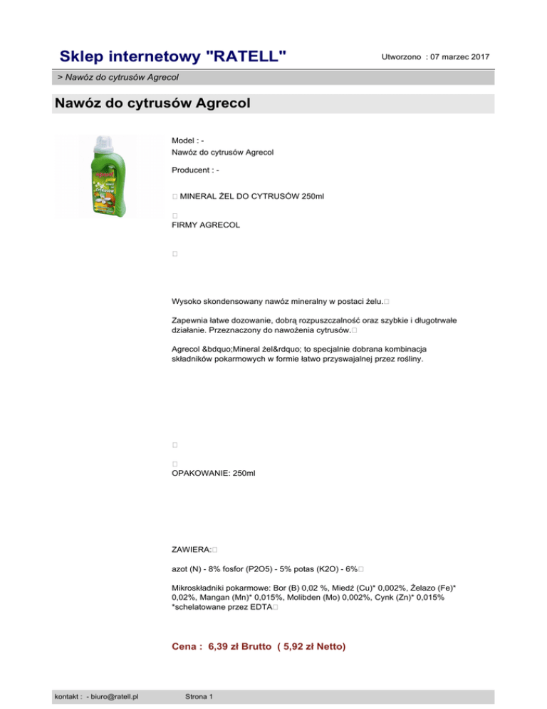 Sklep internetowy "RATELL" Utworzono : 07 marzec 2017 > Nawóz do cytrusów Agrecol Nawóz do cytrusów Agrecol Model : Nawóz do cytrusów Agrecol Producent : �MINERAL ŻEL DO CYTRUSÓW 250ml � FIRMY AGRECOL � Wysoko skondensowany nawóz mineralny w postaci żelu.� Zapewnia łatwe dozowanie, dobrą rozpuszczalność oraz szybkie i długotrwałe działanie. Przeznaczony do nawożenia cytrusów.� Agrecol „Mineral żel” to specjalnie dobrana kombinacja składników pokarmowych w formie łatwo przyswajalnej przez rośliny. � � OPAKOWANIE: 250ml ZAWIERA:� azot (N) - 8% fosfor (P2O5) - 5% potas (K2O) - 6%� Mikroskładniki pokarmowe: Bor (B) 0,02 %, Miedź (Cu)* 0,002%, Żelazo (Fe)* 0,02%, Mangan (Mn)* 0,015%, Molibden (Mo) 0,002%, Cynk (Zn)* 0,015% *schelatowane przez EDTA� Cena : 6,39 zł Brutto ( 5,92 zł Netto) kontakt : - [email protected] Strona 1 Sklep internetowy "RATELL" > Nawóz do cytrusów Agrecol Nawóz do cytrusów Agrecol Dostępność: Produkt dostępny w naszym sklepie od 13 marzec 2014 kontakt : - [email protected] Strona 2 Utworzono : 07 marzec 2017