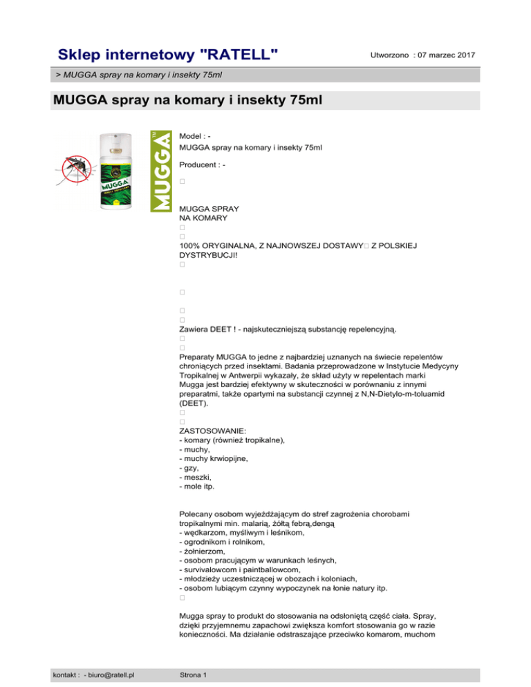 Sklep internetowy "RATELL" Utworzono : 07 marzec 2017 > MUGGA spray na komary i insekty 75ml MUGGA spray na komary i insekty 75ml Model : MUGGA spray na komary i insekty 75ml Producent : � MUGGA SPRAY NA KOMARY � � 100% ORYGINALNA, Z NAJNOWSZEJ DOSTAWY�Z POLSKIEJ DYSTRYBUCJI! � � � � Zawiera DEET ! - najskuteczniejszą substancję repelencyjną. � � Preparaty MUGGA to jedne z najbardziej uznanych na świecie repelentów chroniących przed insektami. Badania przeprowadzone w Instytucie Medycyny Tropikalnej w Antwerpii wykazały, że skład użyty w repelentach marki Mugga jest bardziej efektywny w skuteczności w porównaniu z innymi preparatmi, także opartymi na substancji czynnej z N,N-Dietylo-m-toluamid (DEET). � � ZASTOSOWANIE: - komary (również tropikalne), - muchy, - muchy krwiopijne, - gzy, - meszki, - mole itp. Polecany osobom wyjeżdżającym do stref zagrożenia chorobami tropikalnymi min. malarią, żółtą febrą,dengą - wędkarzom, myśliwym i leśnikom, - ogrodnikom i rolnikom, - żołnierzom, - osobom pracującym w warunkach leśnych, - survivalowcom i paintballowcom, - młodzieży uczestniczącej w obozach i koloniach, - osobom lubiącym czynny wypoczynek na łonie natury itp. � Mugga spray to produkt do stosowania na odsłoniętą część ciała. Spray, dzięki przyjemnemu zapachowi zwiększa komfort stosowania go w razie konieczności. Ma działanie odstraszające przeciwko komarom, muchom kontakt : - [email protected] Strona 1 Sklep internetowy "RATELL" Utworzono : 07 marzec 2017 > MUGGA spray na komary i insekty 75ml MUGGA spray na komary i insekty 75ml krwiopijnym, gzom. Preparat zabezpiecza przed ukąszeniem do 8 godzin od zastosowania. Spryskiwać odzież lub/i odsłoniętą część ciała z odległości około 20 cm. � Można stosować u dzieci powyżej 2 roku� � Opakowanie:�75 ml� � Termin ważności: 2019r. � Stężenie substancji czynnej: 9,6%� � � � Skład: Sodium Styrene/Acrylate Copolymer(en) Sodium Lauryl Sulfate(en) trideceth-7, Carbomer, Triethanolamine, Methylparaben, Cyclomethicone en Dimethiconol, Propylparaben, Tetrasoduim EDATA, 9 % substancji czynnej dwuetylotoluamid (DEET) 0,9% frakcji olejków roślinnych, Aqua, Alcohol, Diethyltoluamide, Parfum� Cena : 17,79 zł Brutto ( 16,47 zł Netto) Dostępność: Produkt dostępny w naszym sklepie od 15 maj 2014 kontakt : - [email protected] Strona 2
