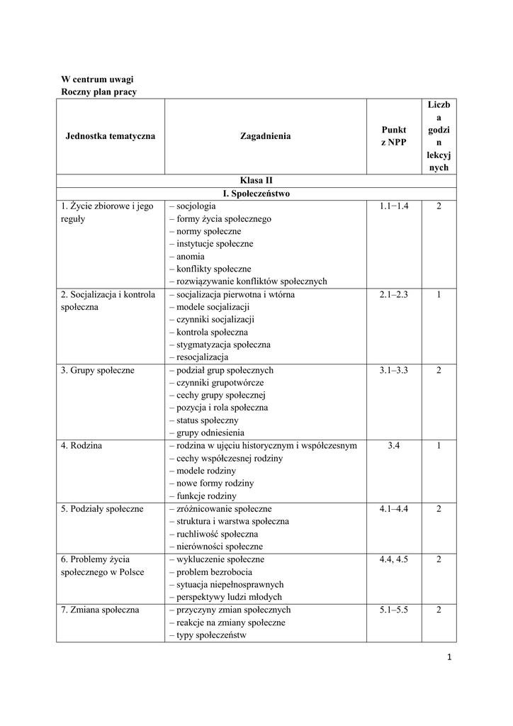 W centrum uwagi Roczny plan pracy Jednostka tematyczna Zagadnienia Punkt z NPP Liczb a godzi n lekcyj nych 1.1−1.4 2 2.1–2.3 1 3.1–3.3 2 3.4 1 4.1–4.4 2 4.4, 4.5 2 5.1–5.5 2 Klasa II I. Społeczeństwo 1. Życie zbiorowe i jego reguły 2. Socjalizacja i kontrola społeczna 3. Grupy społeczne 4. Rodzina 5. Podziały społeczne 6. Problemy życia społecznego w Polsce 7. Zmiana społeczna – socjologia – formy życia społecznego – normy społeczne – instytucje społeczne – anomia – konflikty społeczne – rozwiązywanie konfliktów społecznych – socjalizacja pierwotna i wtórna – modele socjalizacji – czynniki socjalizacji – kontrola społeczna – stygmatyzacja społeczna – resocjalizacja – podział grup społecznych – czynniki grupotwórcze – cechy grupy społecznej – pozycja i rola społeczna – status społeczny – grupy odniesienia – rodzina w ujęciu historycznym i współczesnym – cechy współczesnej rodziny – modele rodziny – nowe formy rodziny – funkcje rodziny – zróżnicowanie społeczne – struktura i warstwa społeczna – ruchliwość społeczna – nierówności społeczne – wykluczenie społeczne – problem bezrobocia – sytuacja niepełnosprawnych – perspektywy ludzi młodych – przyczyny zmian społecznych – reakcje na zmiany społeczne – typy społeczeństw 1 8. Naród i mniejszości narodowe 9. Procesy narodowościowe i społeczne – społeczeństwo współczesne – formy zmian społecznych: rewolucja i reformy – ruchy społeczne – ruch kobiet – ruch niepodległościowy – ruch praw obywatelskich – czynniki narodotwórcze – koncepcje narodu – tożsamość narodowa – postawy wobec ojczyzny i narodu – szowinizm – rasizm – antysemityzm – mniejszości narodowe i etniczne w Polsce – sytuacja prawna mniejszości etnicznych i narodowych – integracja narodów w świecie zachodnim – charakterystyka konfliktów między narodami – konflikty na świecie – polityka państw wobec imigrantów – integracja kulturowa i polityka integracji – imigranci w Polsce 6.1–6.5 2 7.1–7.5 1 [15] 1. Instytucja państwa 2. Obywatel i obywatelstwo 3. Polityka i kultura polityczna 4. Ideologie, doktryny i II. Państwo i polityka – definicja państwa – procesy państwowotwórcze – geneza państwa – współczesne państwa – funkcje państwa – cechy państwa – prawomocność władzy – państwo a naród – wzorce obywatelstwa – nabywanie i zrzekanie się obywatelstwa – obywatelstwo a narodowość – prawa i obowiązki obywatela polskiego – obywatelstwo unijne – obywatelskie nieposłuszeństwo – obywatelskość – polityka – interpretacja pojęcia – politycy – przywódcy polityczni – mężowie stanu – polityka a moralność – kultura polityczna – typy kultury politycznej – światopogląd i ideologia 18.1–18.4 2 11.1–11.4 2 16.1–16.4 1 16.5–16.7 3 2 programy polityczne 5. Systemy partyjne 6. Społeczeństwo obywatelskie – ideologia – doktryna – program – prawica i lewica – ideologie totalitarne – faszyzm – nazizm – komunizm – doktryna konserwatywna – doktryna liberalna – doktryna socjalistyczna – socjaldemokracja – chrześcijańska demokracja – partia polityczna – funkcje partii politycznych – rodzaje partii politycznych – systemy partyjne – system partyjny a system wyborczy – podmioty społeczeństwa obywatelskiego – kapitał społeczny – organizacje pozarządowe w Polsce – organizacje pożytku publicznego 17.1–17.6 2 12.1–12.8 2 [12] 1. Demokracja – zasady i procedury 2. Modele ustrojowe państw demokratycznych 3. Władza ustawodawcza w państwie demokratycznym III. Modele demokracji – wartości będące fundamentem współczesnej demokracji – zasady demokracji – fale demokratyzacji – demokratyczne wybory – formy demokracji bezpośredniej – polskie tradycje demokratyczne – formy współczesnych państw – formy państw złożonych – modele ustrojowe państw demokratycznych – system parlamentarno-gabinetowy – system kanclerski – system prezydencki – system półprezydencki – system parlamentarno-komitetowy – relacja państwo-Kościół – aparat państwowy – parlament i jego funkcje – struktura parlamentu – funkcjonowanie parlamentu – wybory parlamentarne – mandat parlamentarny – immunitet parlamentarny – koalicja i opozycja 15.1–15.7 3 19.1–19.5 3 20.1–20.6 3 3 4. Władza wykonawcza w – egzekutywa państwie – głowa państwa demokratycznym – rząd w państwie demokratycznym – biurokracja 5. Współczesna – partycypacja obywatelska demokracja – problemy i – bezpieczeństwo socjalne zagrożenia – ruchy obywatelskiego sprzeciwu i emancypacji – patologie życia publicznego – korupcja – demagogia – populizm – nepotyzm i klientelizm 21.1, 21.2 2 22.1–22.6 2 [13] 1. Konstytucja Rzeczypospolitej Polskiej 2. Parlament Rzeczypospolitej Polskiej 3. Prezydent Rzeczypospolitej Polskiej 4. Rada Ministrów Rzeczypospolitej Polskiej IV. System polityczny RP – konstytucja i jej funkcje – zasady ustroju RP – system rządów w Polsce – suwerenność a prawo międzynarodowe – procedura zmiany konstytucji – stany nadzwyczajne – stan wojenny – stan wyjątkowy – stan klęski żywiołowej – sejm i senat – wybory – posłowie i senatorowie – organy sejmu i senatu – funkcjonowanie sejmu i senatu – skrócenie kadencji parlamentu – funkcje parlamentu – Zgromadzenie Narodowe – model prezydentury w Polsce – zasady wyboru prezydenta – kadencja prezydenta – uprawnienia wobec parlamentu, rządu, władzy sądowniczej – prezydent a bezpieczeństwo państwa – uprawnienia w polityce zagranicznej – odpowiedzialność prezydenta – procedura powołania rządu – zmiana rządów i ministrów – odpowiedzialność polityczna Rady Ministrów – rząd mniejszościowy – administracja rządowa – kompetencje 