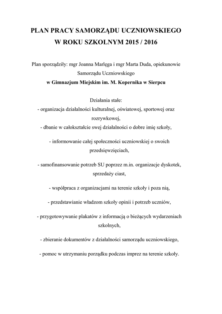 PLAN PRACY SAMORZĄDU UCZNIOWSKIEGO W ROKU SZKOLNYM 2015 / 2016 Plan sporządziły: mgr Joanna Marlęga i mgr Marta Duda, opiekunowie Samorządu Uczniowskiego w Gimnazjum Miejskim im. M. Kopernika w Sierpcu Działania stałe: - organizacja działalności kulturalnej, oświatowej, sportowej oraz rozrywkowej, - dbanie w całokształcie swej działalności o dobre imię szkoły, - informowanie całej społeczności uczniowskiej o swoich przedsięwzięciach, - samofinansowanie potrzeb SU poprzez m.in. organizacje dyskotek, sprzedaży ciast, - współpraca z organizacjami na terenie szkoły i poza nią, - przedstawianie władzom szkoły opinii i potrzeb uczniów, - przygotowywanie plakatów z informacją o bieżących wydarzeniach szkolnych, - zbieranie dokumentów z działalności samorządu uczniowskiego, - pomoc w utrzymaniu porządku podczas imprez na terenie szkoły. L.p. 1. 2. 3. Termin realizacji wrzesień październik listopad Planowane zadania 1. Powitanie uczniów klas I podczas uroczystego rozpoczęcia roku szkolnego przez przedstawiciela SU. 2. Wybór kandydatów do SU na terenie klasy. 3. Zagospodarowanie tablicy Samorządu Uczniowskiego ( plakaty) 4. Zebranie gospodarzy klas i wybranych kandydatów do SU: - wybór przewodniczącego SU, - sekretarza SU, - skarbnika, - organizacja roku szkolnego 2014/2015 5. Opracowanie planu pracy SU: - zebranie organizacyjne, - ustalenie priorytetów, - harmonogram pracy, sprawozdania. 6. Przedstawienie planu pracy SU Dyrekcji szkoły. 1. Zebranie Samorządu Uczniowskiego: - przydział czynności (podział na sekcje) - sprawy bieżące 2. Święto Edukacji Narodowej - przekazanie życzeń wszystkim nauczycielom i pracownikom szkoły. 3. Pomoc w organizacji obchodów 15-lecia szkoły. 1. Święto Odzyskania Niepodległości: - udział w uroczystościach organizowanych przez szkołę, - delegacja SU. 2. Dzień wróżb w naszej szkole: - dyskoteka andrzejkowa, - dyżury pełnione przez nauczycieli. Odpowiedzialni - opiekunowie SU Samorząd Uczniowski - opiekunowie SU - Samorząd Uczniowski - członkowie SU opiekunowie SU 4. 5. 6. 7. grudzień styczeń luty marzec 1. Zorganizowanie przez samorząd uczniowski drobnych upominków mikołajkowych: - zakupienie np. lizaków. Organizacja Mikołajek szkolnych. 2. Przygotowanie wigilii SU. 3. Roznoszenie kartek z życzeniami Świątecznymi. - członkowie SU opiekunowie SU 1. Złożenie sprawozdania z działalności SU za I semestr. - opiekunowie SU członkowie SU - członkowie SU opiekunowie SU - członkowie SU opiekunowie SU 2. Zabawa karnawałowa: - organizacja dyskoteki, - dyżury nauczycieli. 1. Walentynkowa Poczta Serduszkowa: - sprzedaż serduszek - wręczanie życzeń adresatom 2. Uruchomienie „poczty walentynkowej” 3. Dzień Patrona Szkoły: - rozniesienie zaproszeń na uroczystość obchodów Dnia Patrona Szkoły Mikołaja Kopernika. 4. Branie udziału w działaniach mających na celu promocje szkoły w środowisku lokalnym. 1. Przygotowanie gazetki okolicznościowej z okazji Dnia Kobiet, zorganizowanie przez chłopców niespodzianki dla pań i koleżanek w swoich klasach. 2. Sprzedaż ciast w Dniu Kobiet. 3. Pierwszy Dzień Wiosny: - zorganizowanie zabaw pod hasłem „Szkoła na wesoło” - organizacja konkursu karaoke lub „mam talent”. 4. Promocja szkoły w trakcie Dnia Otwartego w Gimnazjum – oprowadzanie uczniów klas 6 ze szkół podstawowych. 8. 9. 10. kwiecień maj czerwiec 1. Dzień Służby Zdrowia: - zakup kwiatów i złożenie życzeń Pani Pielęgniarce przez SU. 1. 3 Maja: - udział w akademii z okazji uchwalenia Konstytucji 3 Maja - delegacja SU. 1. Dzień Sportu i Zdrowia: - współudział w organizacji „Dnia Sportu i Zdrowia” 2. Podsumowanie pracy SU za rok szkolny 2015/2016 - przedstawienie wniosków do realizacji w przyszłym roku szkolnym - przygotowanie sprawozdania z działalności Samorządu Uczniowskiego 3. Uroczyste zakończenie roku szkolnego. 4. Pożegnanie klas III przez reprezentanta SU. 5. Przyznanie nagród za pracę w SU. 6. Przemówienie przedstawiciela SU na uroczystym zakończeniu roku szkolnego. Wręczenie kwiatów dyrekcji. - opiekunowie SU członkowie SU - członkowie SU - opiekunowie SU, członkowie SU Samorząd Uczniowski i opiekunowie SU zastrzegają sobie zmiany do planu pracy wg bieżących potrzeb. Opiekun SU mgr Joanna Marlęga Opiekun SU mgr Marta Duda