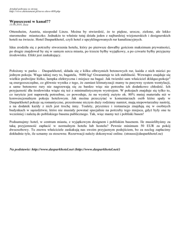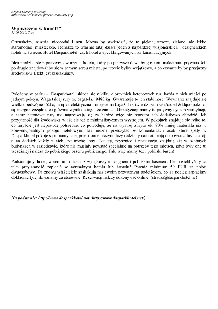 Artykuł pobrany ze strony http://www.ekonsument.pl/news-show-609.php Wpuszczeni w kanał?? 13.06.2010, Zuza Ottensheim, Austria, nieopodal Linzu. Można by stwierdzić, że to piękne, urocze, zielone, ale lekko staromodne miasteczko. Jednakże to właśnie tutaj działa jeden z najbardziej wizjonerskich i designerskich hoteli na świecie. Hotel Dasparkhotel, czyli hotel z upcyklingowanych rur kanalizacyjnych. Idea zrodziła się z potrzeby stworzenia hotelu, który po pierwsze dawałby gościom maksimum prywatności, po drugie znajdował by się w samym sercu miasta, po trzecie byłby wyjątkowy, a po czwarte byłby przyjazny środowisku. Efekt jest zaskakujący. Położony w parku - Dasparkhotel, składa się z kilku olbrzymich betonowych rur, każda z nich mieści po jednym pokoju. Waga takiej rury to, bagatela, 9480 kg! Gwarantuje to ich stabilność. Wewnątrz znajduje się wielkie podwójne łóżko, lampka elektryczna i miejsce na bagaż. Jak twierdzi sam właściciel “pokoje" są energooszczędne, co głównie wynika z tego, że zamiast klimatyzacji mamy tu pasywny system wentylacji, a same betonowe rury nie nagrzewają się za bardzo więc nie potrzeba ich dodatkowo chłodzić. Ich przyjazność dla środowiska wiąże się też z minimalistycznym wystrojem. W pokojach znajduje się tylko to, co turyście jest naprawdę potrzebne, co powoduje, że na wystrój zużyto ok. 80% mniej materiału niż w konwencjonalnym pokoju hotelowym. Jak można przeczytać w komentarzach osób które spały w Dasparkhotel pokoje są romantyczne, przestronne niczym duży rodzinny namiot, mają niepowtarzalny nastrój, a na dodatek każdy z nich jest trochę inny. Toalety, prysznice i restauracja znajdują się w osobnych budynkach w sąsiedztwie, które nie musiały powstać specjalnie na potrzeby tego miejsca, gdyż były one tu wcześniej i należą do pobliskiego basenu publicznego. Tak, więc mamy też i pobliski basen! Podsumujmy: hotel, w centrum miasta, z wyjątkowym designem i pobliskim basenem. Ile musielibyśmy za taką przyjemność zapłacić w normalnym hotelu lub hostelu? Pewnie minimum 50 EUR za pokój dwuosobowy. Tu znowu właściciele zaskakują nas swoim przyjaznym podejściem, bo za nocleg zapłacimy dokładnie tyle, ile uznamy za stosowne. Rezerwacji należy dokonywać online. ([email protected]) Na podstawie: http://www.dasparkhotel.net (http://www.dasparkhotel.net/)