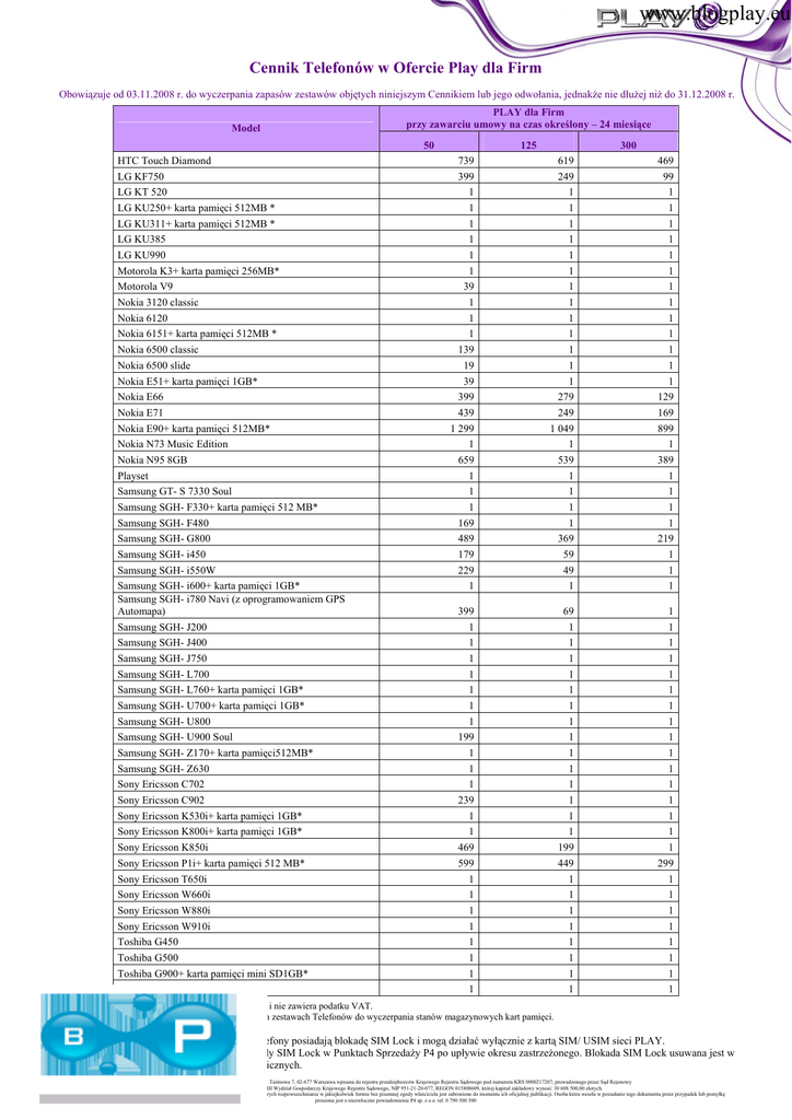 www.blogplay.eu Cennik Telefonów w Ofercie Play dla Firm Obowiązuje od 03.11.2008 r. do wyczerpania zapasów zestawów objętych niniejszym Cennikiem lub jego odwołania, jednakże nie dłużej niż do 31.12.2008 r. Model PLAY dla Firm przy zawarciu umowy na czas określony – 24 miesiące 50 HTC Touch Diamond LG KF750 LG KT 520 LG KU250+ karta pamięci 512MB * LG KU311+ karta pamięci 512MB * LG KU385 LG KU990 Motorola K3+ karta pamięci 256MB* Motorola V9 Nokia 3120 classic Nokia 6120 Nokia 6151+ karta pamięci 512MB * Nokia 6500 classic Nokia 6500 slide Nokia E51+ karta pamięci 1GB* Nokia E66 Nokia E71 Nokia E90+ karta pamięci 512MB* Nokia N73 Music Edition Nokia N95 8GB Playset Samsung GT- S 7330 Soul Samsung SGH- F330+ karta pamięci 512 MB* Samsung SGH- F480 Samsung SGH- G800 Samsung SGH- i450 Samsung SGH- i550W Samsung SGH- i600+ karta pamięci 1GB* Samsung SGH- i780 Navi (z oprogramowaniem GPS Automapa) Samsung SGH- J200 Samsung SGH- J400 Samsung SGH- J750 Samsung SGH- L700 Samsung SGH- L760+ karta pamięci 1GB* Samsung SGH- U700+ karta pamięci 1GB* Samsung SGH- U800 Samsung SGH- U900 Soul Samsung SGH- Z170+ karta pamięci512MB* Samsung SGH- Z630 Sony Ericsson C702 Sony Ericsson C902 Sony Ericsson K530i+ karta pamięci 1GB* Sony Ericsson K800i+ karta pamięci 1GB* Sony Ericsson K850i Sony Ericsson P1i+ karta pamięci 512 MB* Sony Ericsson T650i Sony Ericsson W660i Sony Ericsson W880i Sony Ericsson W910i Toshiba G450 Toshiba G500 Toshiba G900+ karta pamięci mini SD1GB* Toshiba TS 705 125 300 739 399 1 1 1 1 1 1 39 1 1 1 139 19 39 399 439 1 299 1 659 1 1 1 169 489 179 229 1 619 249 1 1 1 1 1 1 1 1 1 1 1 1 1 279 249 1 049 1 539 1 1 1 1 369 59 49 1 469 99 1 1 1 1 1 1 1 1 1 1 1 1 1 129 169 899 1 389 1 1 1 1 219 1 1 1 399 1 1 1 1 1 1 1 199 1 1 1 239 1 1 469 599 1 1 1 1 1 1 1 1 69 1 1 1 1 1 1 1 1 1 1 1 1 1 1 199 449 1 1 1 1 1 1 1 1 1 1 1 1 1 1 1 1 1 1 1 1 1 1 1 1 299 1 1 1 1 1 1 1 1 Opłata za Telefony podana jest w złotych i nie zawiera podatku VAT. * Karty pamięci są dostępne w wybranych zestawach Telefonów do wyczerpania stanów magazynowych kart pamięci. Blokada SIM LOCK: 1. Oferowane w ramach Oferty Play Telefony posiadają blokadę SIM Lock i mogą działać wyłącznie z kartą SIM/ USIM sieci PLAY. 2. Abonent może żądać usunięcia blokady SIM Lock w Punktach Sprzedaży P4 po upływie okresu zastrzeżonego. Blokada SIM Lock usuwana jest w ramach istniejących możliwości technicznych. P4 sp. z o.o. z siedzibą i adresem w Warszawie, ul. Taśmowa 7, 02-677 Warszawa wpisana do rejestru przedsiębiorców Krajowego Rejestru Sądowego pod numerem KRS 0000217207, prowadzonego przez Sąd Rejonowy dla miasta stołecznego Warszawy, XIII Wydział Gospodarczy Krajowego Rejestru Sądowego, NIP 951-21-20-077, REGON 015808609, której kapitał zakładowy wynosi: 30 608 500,00 złotych. Niniejszy dokument zawiera informacje stanowiące tajemnicę przedsiębiorstwa Grupy P4, których rozpowszechnianie w jakiejkolwiek formie bez pisemnej zgody właściciela jest zabronione do momentu ich oficjalnej publikacji. Osoba która weszła w posiadanie tego dokumentu przez przypadek lub pomyłkę proszona jest o niezwłoczne powiadomienie P4 sp. z o.o. tel. 0 790 500 500 www.blogplay.eu 3. W przypadku usunięcia blokady SIM Lock poza Punktem Sprzedaży P4 w sposób nie uzgodniony z P4 Abonent może stracić prawo do bezpłatnej obsługi serwisowej Telefonu w ramach gwarancji, rękojmi lub uprawnień z tytułu niezgodności z umową, jeżeli wada / niezgodność z umową powstała na skutek usunięcia blokady SIM Lock. Promocyjne ceny Telefonów: 1. Przy zawieraniu Umowy w ramach Oferty Play, Abonent ma możliwość zakupu Telefonu na warunkach cenowych określonych w niniejszym Cenniku Telefonów. 2. P4 zastrzega, iż dostępność poszczególnych modeli Telefonów uzależniona jest od aktualnych stanów magazynowych Punktów Sprzedaży P4. P4 sp. z o.o. z siedzibą i adresem w Warszawie, ul. Taśmowa 7, 02-677 Warszawa wpisana do rejestru przedsiębiorców Krajowego Rejestru Sądowego pod numerem KRS 0000217207, prowadzonego przez Sąd Rejonowy dla miasta stołecznego Warszawy, XIII Wydział Gospodarczy Krajowego Rejestru Sądowego, NIP 951-21-20-077, REGON 015808609, której kapitał zakładowy wynosi: 30 608 500,00 złotych. Niniejszy dokument zawiera informacje stanowiące tajemnicę przedsiębiorstwa Grupy P4, których rozpowszechnianie w jakiejkolwiek formie bez pisemnej zgody właściciela jest zabronione do momentu ich oficjalnej publikacji. Osoba która weszła w posiadanie tego dokumentu przez przypadek lub pomyłkę proszona jest o niezwłoczne powiadomienie P4 sp. z o.o. tel. 0 790 500 500