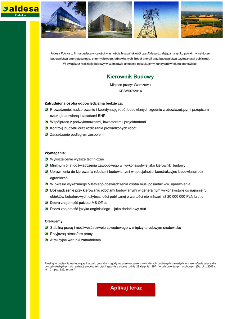 Aldesa Polska to firma będąca w całości własnością hiszpańskiej Grupy Aldesa działająca na rynku polskim w sektorze budownictwa energetycznego, przemysłowego, odnawialnych źródeł energii oraz budownictwa użyteczności publicznej. W związku z realizacją budowy w Warszawie aktualnie poszukujemy kandydatów/tek na stanowisko: Kierownik Budowy Miejsce pracy: Warszawa KB/W/07/2014 Zatrudniona osoba odpowiedzialna będzie za: Prowadzenie, nadzorowanie i koordynację robót budowlanych zgodnie z obowiązującymi przepisami, sztuką budowlaną i zasadami BHP Współpracę z podwykonawcami, inwestorem i projektantami Kontrolę budżetu oraz rozliczanie prowadzonych robót Zarządzanie podległym zespołem Wymagania: Wykształcenie wyższe techniczne Minimum 5 lat doświadczenia zawodowego w wykonawstwie jako kierownik budowy Uprawnienia do kierowania robotami budowlanymi w specjalności konstrukcyjno-budowlanej bez ograniczeń W okresie wykazanego 5 letniego doświadczenia osoba musi posiadać ww. uprawnienia Doświadczenie przy kierowaniu robotami budowlanymi w generalnym wykonawstwie co najmniej 3 obiektów kubaturowych użyteczności publicznej o wartości nie niższej niż 20 000 000 PLN brutto, Dobra znajomość pakietu MS Office Dobra znajomość języka angielskiego – jako dodatkowy atut Oferujemy: Stabilną pracę i możliwość rozwoju zawodowego w międzynarodowym środowisku Przyjazną atmosferę pracy Atrakcyjne warunki zatrudnienia Prosimy o dopisanie następującej klauzuli: „Wyrażam zgodę na przetwarzanie moich danych osobowych zawartych w mojej ofercie pracy dla potrzeb niezbędnych do realizacji procesu rekrutacji zgodnie z ustawą z dnia 29 sierpnia 1997 r. o ochronie danych osobowych (Dz. U. z 2002 r. Nr 101, poz. 926, ze zm.)” Aplikuj teraz
