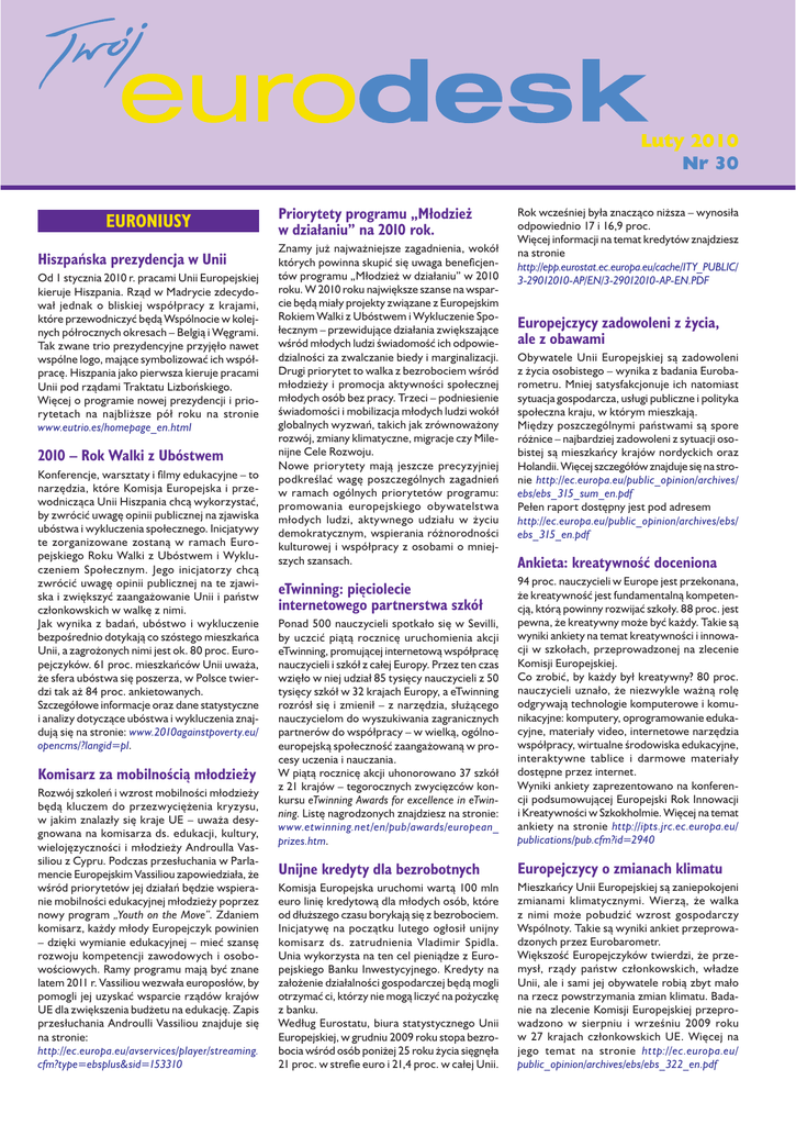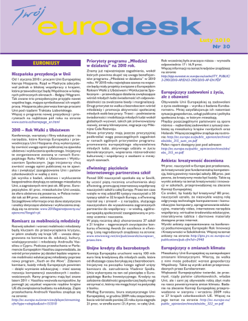 Luty 2010 Nr 30 EURONIUSY Hiszpańska prezydencja w Unii Od 1 stycznia 2010 r. pracami Unii Europejskiej kieruje Hiszpania. Rząd w Madrycie zdecydował jednak o bliskiej współpracy z krajami, które przewodniczyć będą Wspólnocie w kolejnych półrocznych okresach – Belgią i Węgrami. Tak zwane trio prezydencyjne przyjęło nawet wspólne logo, mające symbolizować ich współpracę. Hiszpania jako pierwsza kieruje pracami Unii pod rządami Traktatu Lizbońskiego. Więcej o programie nowej prezydencji i priorytetach na najbliższe pół roku na stronie www.eutrio.es/homepage_en.html 2010 – Rok Walki z Ubóstwem Konferencje, warsztaty i filmy edukacyjne – to narzędzia, które Komisja Europejska i przewodnicząca Unii Hiszpania chcą wykorzystać, by zwrócić uwagę opinii publicznej na zjawiska ubóstwa i wykluczenia społecznego. Inicjatywy te zorganizowane zostaną w ramach Europejskiego Roku Walki z Ubóstwem i Wykluczeniem Społecznym. Jego inicjatorzy chcą zwrócić uwagę opinii publicznej na te zjawiska i zwiększyć zaangażowanie Unii i państw członkowskich w walkę z nimi. Jak wynika z badań, ubóstwo i wykluczenie bezpośrednio dotykają co szóstego mieszkańca Unii, a zagrożonych nimi jest ok. 80 proc. Europejczyków. 61 proc. mieszkańców Unii uważa, że sfera ubóstwa się poszerza, w Polsce twierdzi tak aż 84 proc. ankietowanych. Szczegółowe informacje oraz dane statystyczne i analizy dotyczące ubóstwa i wykluczenia znajdują się na stronie: www.2010againstpoverty.eu/ opencms/?langid=pl. Komisarz za mobilnością młodzieży Rozwój szkoleń i wzrost mobilności młodzieży będą kluczem do przezwyciężenia kryzysu, w jakim znalazły się kraje UE – uważa desygnowana na komisarza ds. edukacji, kultury, wielojęzyczności i młodzieży Androulla Vassiliou z Cypru. Podczas przesłuchania w Parlamencie Europejskim Vassiliou zapowiedziała, że wśród priorytetów jej działań będzie wspieranie mobilności edukacyjnej młodzieży poprzez nowy program „Youth on the Move”. Zdaniem komisarz, każdy młody Europejczyk powinien – dzięki wymianie edukacyjnej – mieć szansę rozwoju kompetencji zawodowych i osobowościowych. Ramy programu mają być znane latem 2011 r. Vassiliou wezwała europosłów, by pomogli jej uzyskać wsparcie rządów krajów UE dla zwiększenia budżetu na edukację. Zapis przesłuchania Androulli Vassiliou znajduje się na stronie: http://ec.europa.eu/avservices/player/streaming. cfm?type=ebsplus&sid=153310 Priorytety programu „Młodzież w działaniu” na 2010 rok. Znamy już najważniejsze zagadnienia, wokół których powinna skupić się uwaga beneficjentów programu „Młodzież w działaniu” w 2010 roku. W 2010 roku największe szanse na wsparcie będą miały projekty związane z Europejskim Rokiem Walki z Ubóstwem i Wykluczenie Społecznym – przewidujące działania zwiększające wśród młodych ludzi świadomość ich odpowiedzialności za zwalczanie biedy i marginalizacji. Drugi priorytet to walka z bezrobociem wśród młodzieży i promocja aktywności społecznej młodych osób bez pracy. Trzeci – podniesienie świadomości i mobilizacja młodych ludzi wokół globalnych wyzwań, takich jak zrównoważony rozwój, zmiany klimatyczne, migracje czy Milenijne Cele Rozwoju. Nowe priorytety mają jeszcze precyzyjniej podkreślać wagę poszczególnych zagadnień w ramach ogólnych priorytetów programu: promowania europejskiego obywatelstwa młodych ludzi, aktywnego udziału w życiu demokratycznym, wspierania różnorodności kulturowej i współpracy z osobami o mniejszych szansach. Rok wcześniej była znacząco niższa – wynosiła odpowiednio 17 i 16,9 proc. Więcej informacji na temat kredytów znajdziesz na stronie http://epp.eurostat.ec.europa.eu/cache/ITY_PUBLIC/ 3-29012010-AP/EN/3-29012010-AP-EN.PDF Europejczycy zadowoleni z życia, ale z obawami Obywatele Unii Europejskiej są zadowoleni z życia osobistego – wynika z badania Eurobarometru. Mniej satysfakcjonuje ich natomiast sytuacja gospodarcza, usługi publiczne i polityka społeczna kraju, w którym mieszkają. Między poszczególnymi państwami są spore różnice – najbardziej zadowoleni z sytuacji osobistej są mieszkańcy krajów nordyckich oraz Holandii. Więcej szczegółów znajduje się na stronie http://ec.europa.eu/public_opinion/archives/ ebs/ebs_315_sum_en.pdf Pełen raport dostępny jest pod adresem http://ec.europa.eu/public_opinion/archives/ebs/ ebs_315_en.pdf Ankieta: kreatywność doceniona Ponad 500 nauczycieli spotkało się w Sevilli, by uczcić piątą rocznicę uruchomienia akcji eTwinning, promującej internetową współpracę nauczycieli i szkół z całej Europy. Przez ten czas wzięło w niej udział 85 tysięcy nauczycieli z 50 tysięcy szkół w 32 krajach Europy, a eTwinning rozrósł się i zmienił – z narzędzia, służącego nauczycielom do wyszukiwania zagranicznych partnerów do współpracy – w wielką, ogólnoeuropejską społeczność zaangażowaną w procesy uczenia i nauczania. W piątą rocznicę akcji uhonorowano 37 szkół z 21 krajów – tegorocznych zwycięzców konkursu eTwinning Awards for excellence in eTwinning. Listę nagrodzonych znajdziesz na stronie: www.etwinning.net/en/pub/awards/european_ prizes.htm. 94 proc. nauczycieli w Europe jest przekonana, że kreatywność jest fundamentalną kompetencją, którą powinny rozwijać szkoły. 88 proc. jest pewna, że kreatywny może być każdy. Takie są wyniki ankiety na temat kreatywności i innowacji w szkołach, przeprowadzonej na zlecenie Komisji Europejskiej. Co zrobić, by każdy był kreatywny? 80 proc. nauczycieli uznało, że niezwykle ważną rolę odgrywają technologie komputerowe i komunikacyjne: komputery, oprogramowanie edukacyjne, materiały video, internetowe narzędzia współpracy, wirtualne środowiska edukacyjne, interaktywne tablice i darmowe materiały dostępne przez internet. Wyniki ankiety zapre