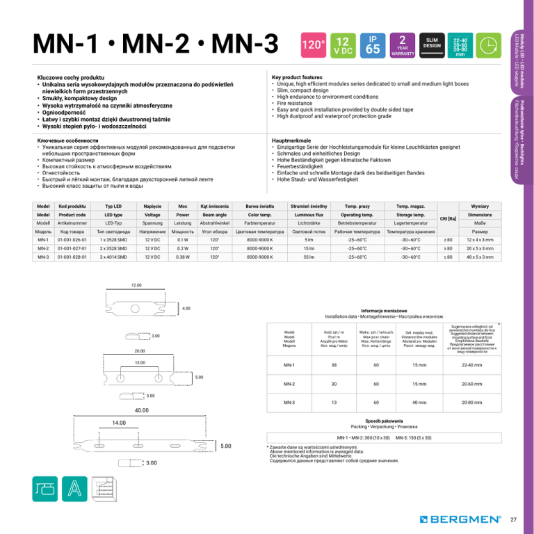 12 2 IP V DC 65 YEAR WARRANTY SLIM DESIGN 22-40 20-60 20-80 mm Key product features • Unique, high efficient modules series dedicated to small and medium light boxes • Slim, compact design • High endurance to environment conditions • Fire resistance • Easy and quick installation provided by double sided tape • High dustproof and waterproof protection grade Ключевые особенности • Уникальная серия эффективных модулей рекомендованных для подсветки небольших пространственных форм • Компактный размер • Высокая стойкость к атмосферным воздействиям • Огнестойкость • Быстрый и лёгкий монтаж, благодаря двухсторонней липкой ленте • Высокий класс защиты от пыли и воды Hauptmerkmale • Einzigartige Serie der Hochleistungsmodule für kleine Leuchtkästen geeignet • Schmales und einheitliches Design • Hohe Beständigkeit gegen klimatische Faktoren • Feuerbeständigkeit • Einfache und schnelle Montage dank des beidseitigen Bandes • Hohe Staub- und Wasserfestigkeit Kod produktu Typ LED Napięcie Moc Kąt świecenia Barwa światła Strumień świetlny Temp. pracy Temp. magaz. Model Product code LED type Voltage Power Beam angle Color temp. Luminous flux Operating temp. Storage temp. Modell Artikelnummer LED-Typ Spannung Leistung Abstrahlwinkel Farbtemperatur Lichtstärke Betriebstemperatur Lagertemperatur Mодель Код товара Тип светодиода Напряжение Мощность Угол обзора Цветовая температура Световой поток Рабочая температура Температура хранения Podświetlenie tylne • Backlights Flächenbeleuchtung •Подсветка сзади Kluczowe cechy produktu • Unikalna seria wysokowydajnych modułów przeznaczona do podświetleń niewielkich form przestrzennych • Smukły, kompaktowy design • Wysoka wytrzymałość na czynniki atmosferyczne • Ognioodporność • Łatwy i szybki montaż dzięki dwustronnej taśmie • Wysoki stopień pyło- i wodoszczelności Model Moduły LED • LED modules LED-Module • LED модули MN-1 • MN-2 • MN-3160° 120°- Wymiary CRI [Ra] Dimensions Maße Размер MN-1 01-001-026-01 1 x 3528 SMD 12 V DC 0.1 W 120° 8000-9000 K 5 lm -25~60°C -30~60°C ≥ 80 12 x 4 x 3 mm MN-2 01-001-027-01 2 x 3528 SMD 12 V DC 0.2 W 120° 8000-9000 K 15 lm -25~60°C -30~60°C ≥ 80 20 x 5 x 3 mm MN-3 01-001-028-01 3 x 4014 SMD 12 V DC 0.38 W 120° 8000-9000 K 55 lm -25~60°C -30~60°C ≥ 80 40 x 5 x 3 mm MN-1 12.00 4.00 Informacje montażowe Installation data • Montagehinweise • Настройка и монтаж 3.00 Model Model Modell Модель Ilość szt./ m Pcs/ m Anzahl pro Meter Кол. мод./ метр Maks. szt./ łańcuch Max pcs/ chain Max. Kettenlänge Кол. мод./ цепь Odl. między mod. Distance btw modules Abstand zw. Modulen Расст. между мод. Sugerowana odległość od powierzchni montażu do lica Suggested distance between mounting surface and front Empfohlene Bautiefe Предлагаемое расстояние от монтажной поверхности к лицу поверхности MN-1 38 60 15 mm 22-40 mm MN-2 30 60 15 mm 20-60 mm MN-3 13 60 40 mm 20-80 mm 20.00 13.00 * 5.00 3.00 40.00 Sposób pakowania Packing • Verpackung • Упаковка 14.00 MN-1 • MN-2: 300 (10 x 30) 5.00 3.00 MN-3: 150 (5 x 30) * Zawarte dane są wartościami uśrednionymi. Above mentioned information is averaged data. Die technische Angaben sind Mittelwerte. Содержится данные представляют собой средние значения. LN-3 27